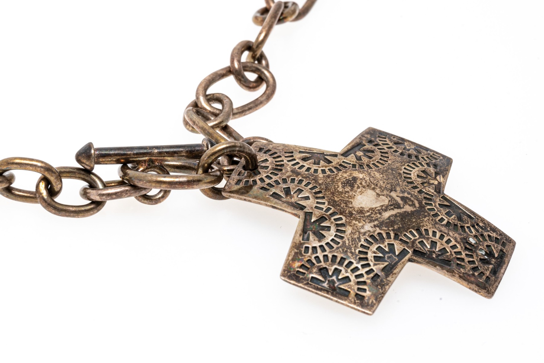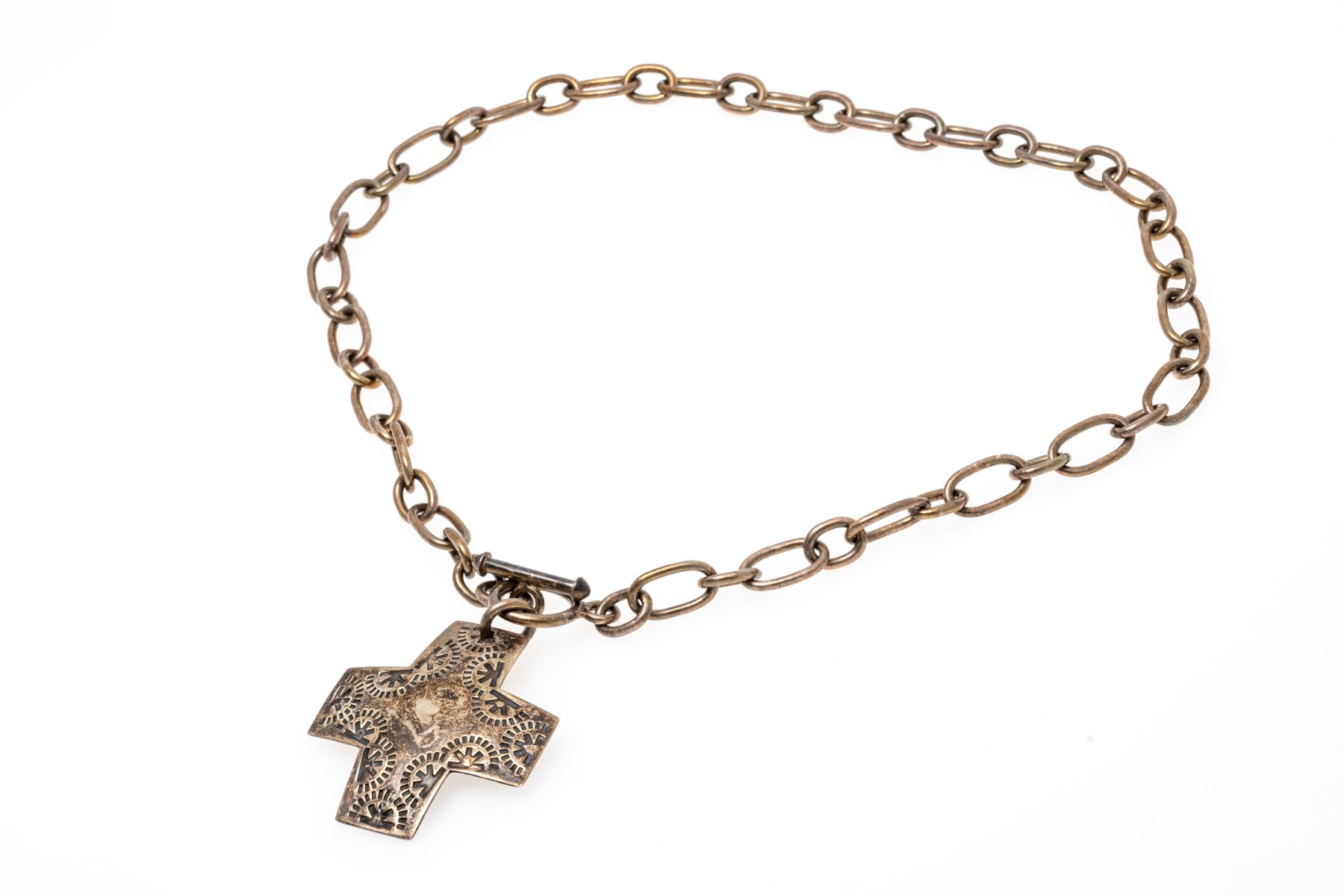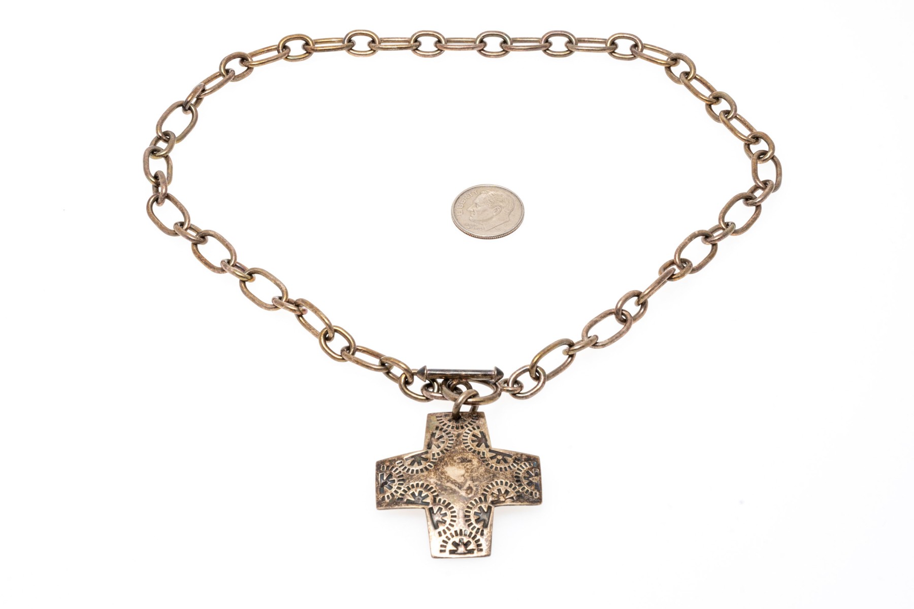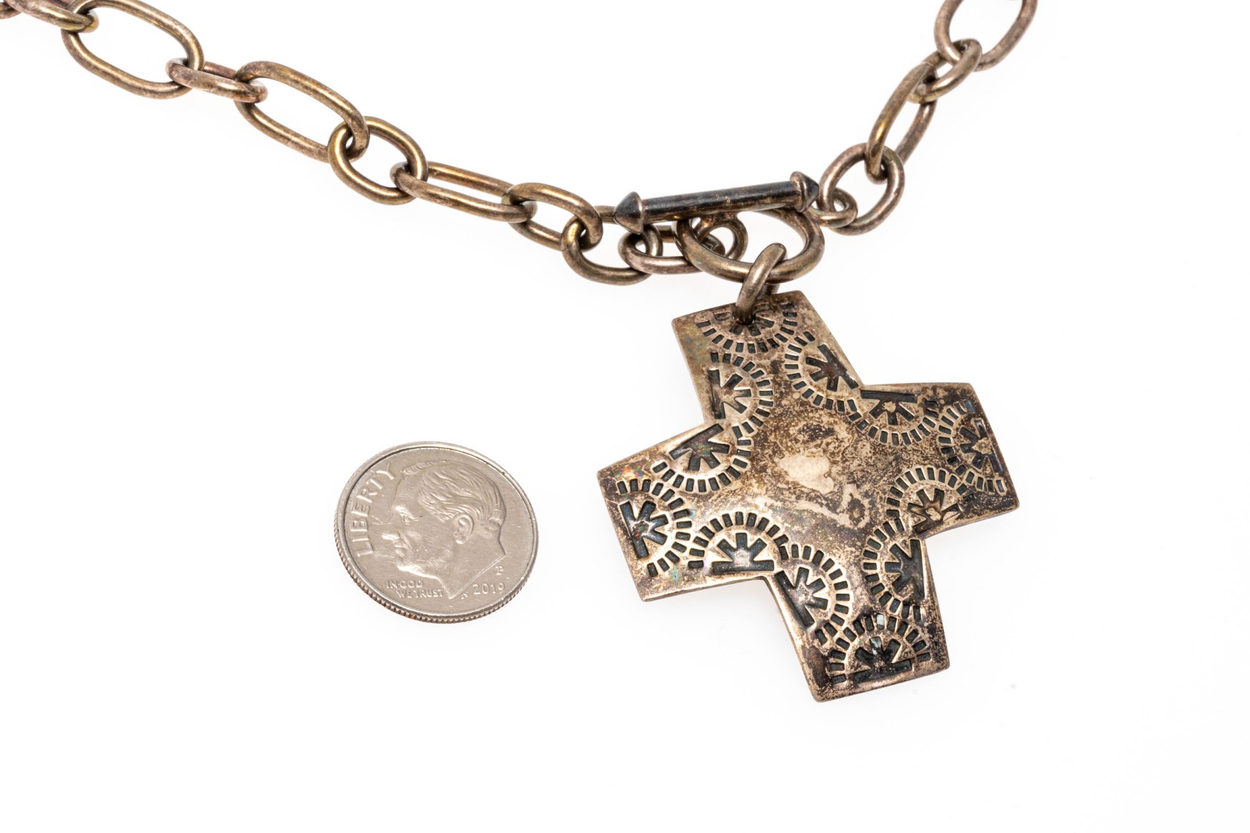 Bold sterling silver pendant necklace. Large cable link style chain with etched cross pendant. Toggle clasp.