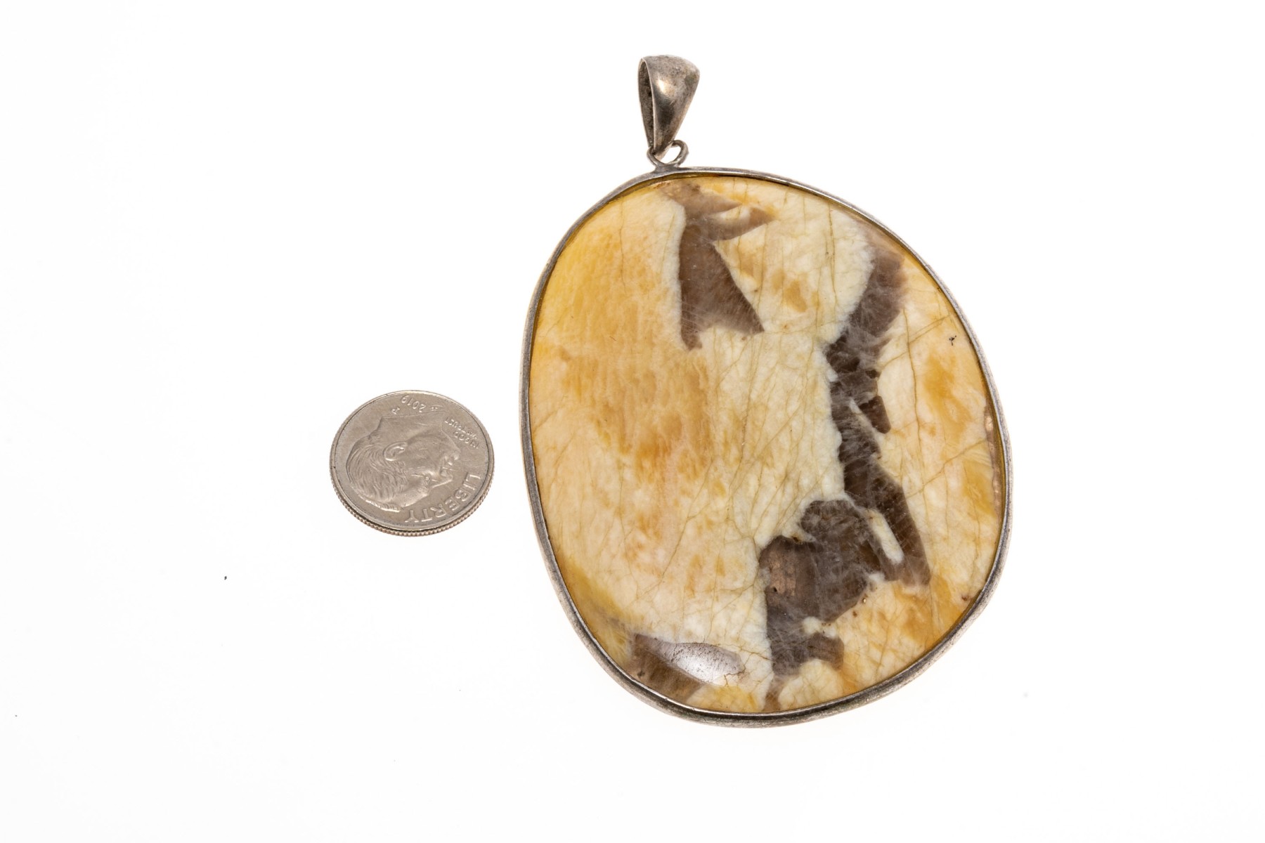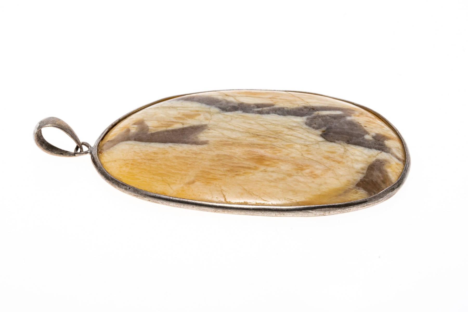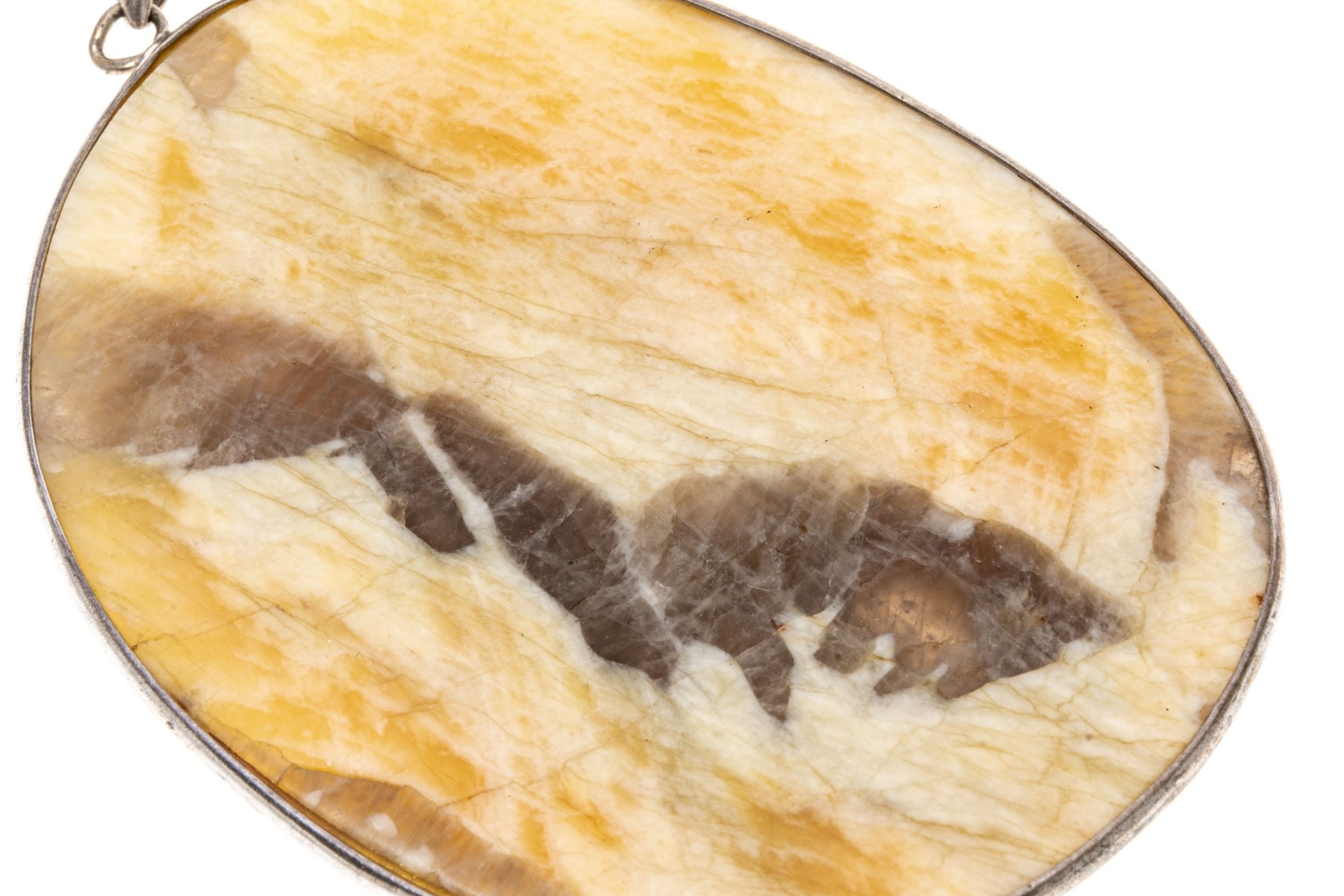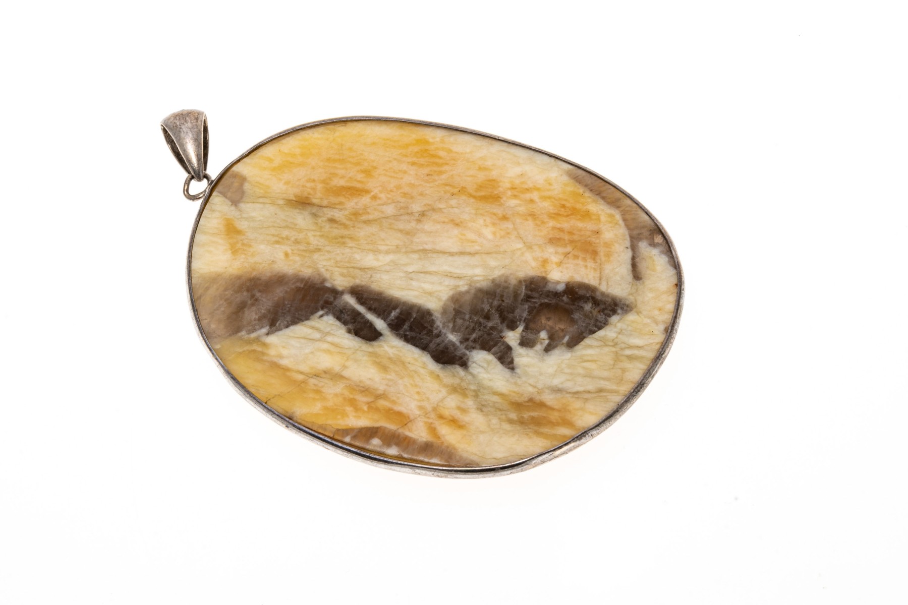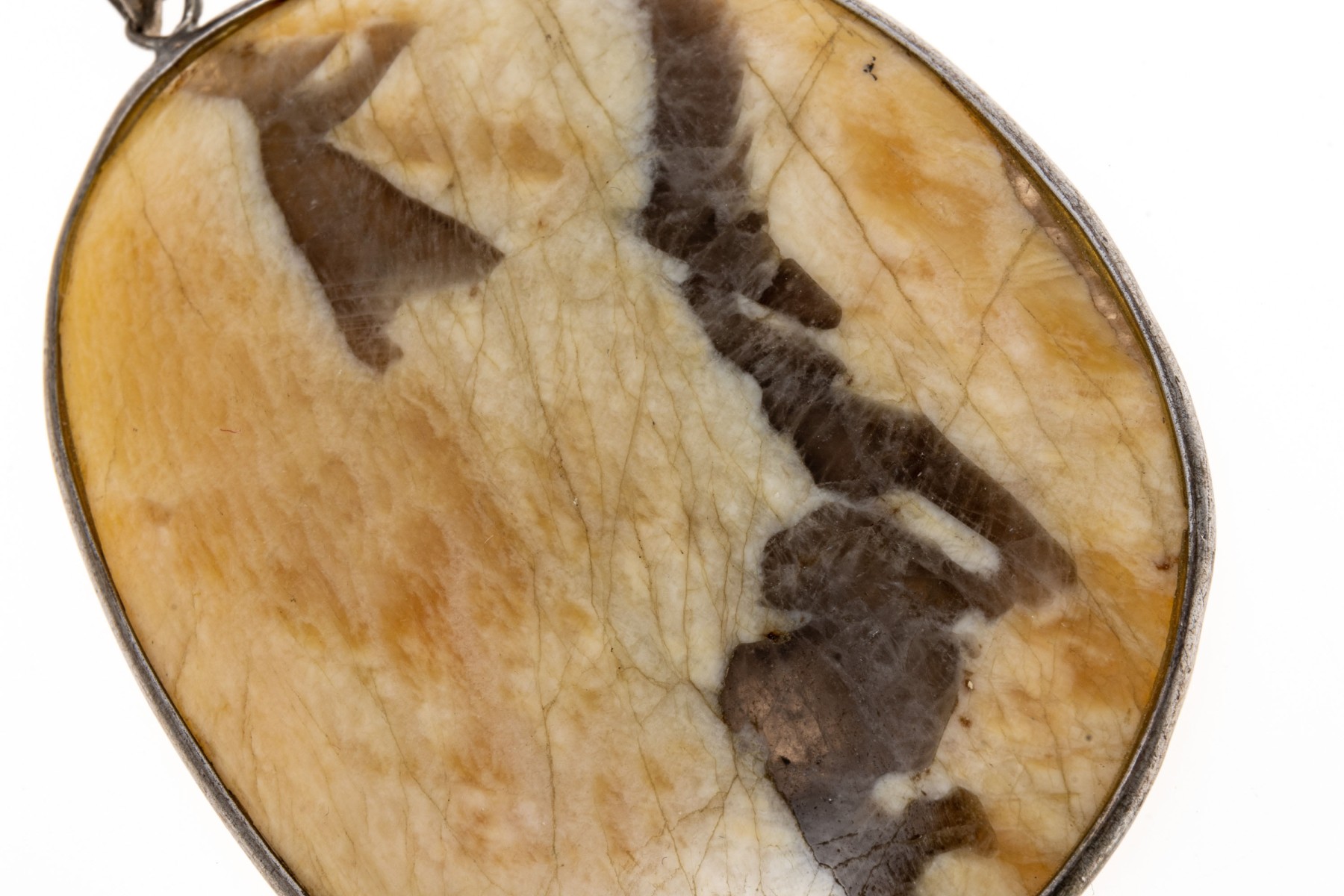 A bold freeform pendant featuring a tumbled hard stone including smoky quartz within a sterling bezel setting.