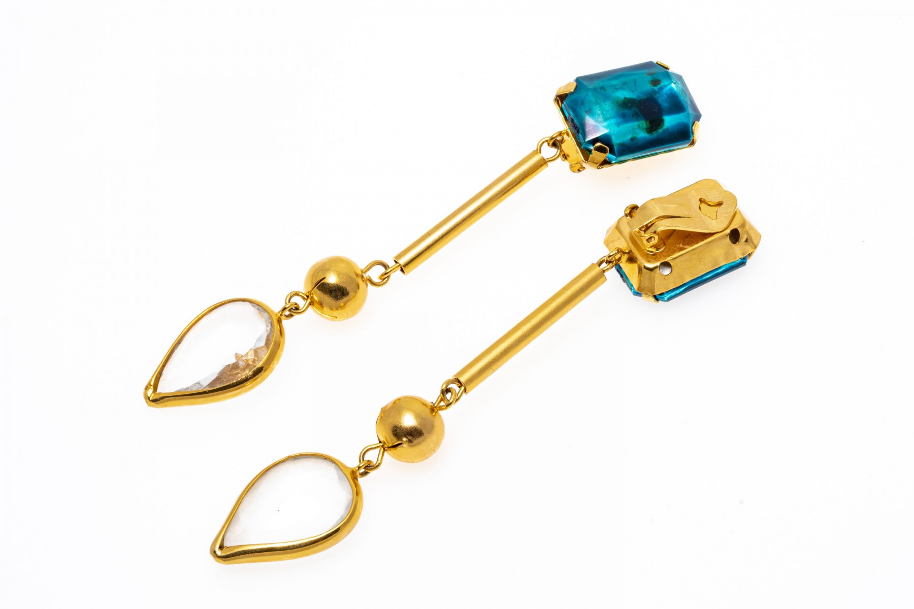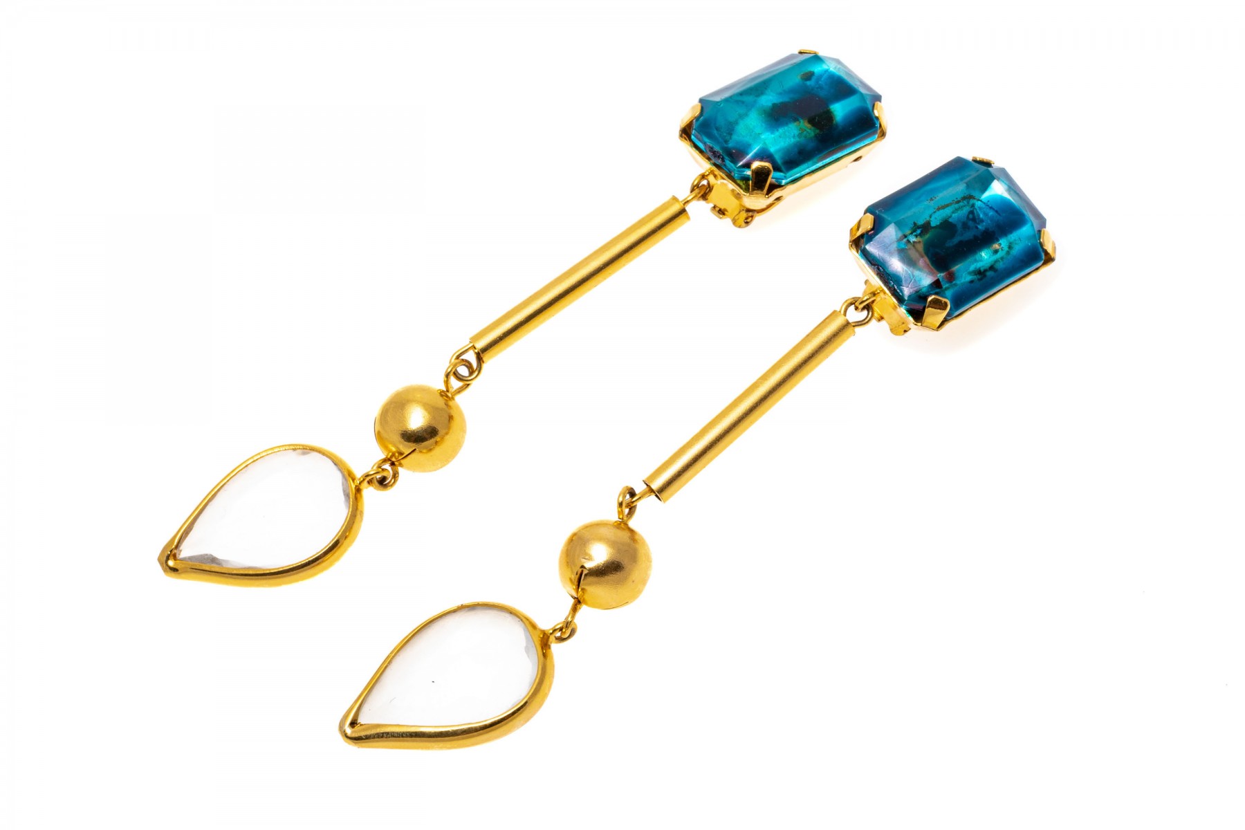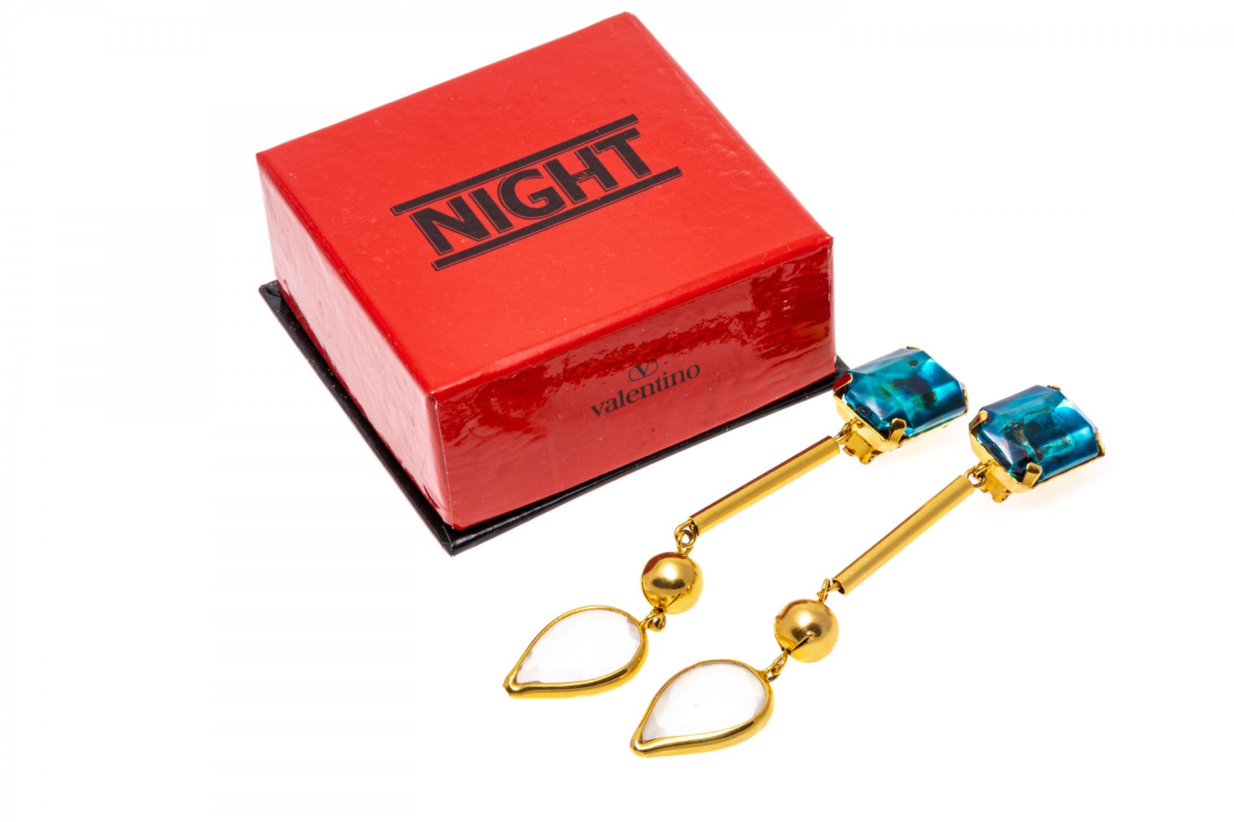 A pair of Valentino 'Night' drop style earrings. The earrings have a rectangular blue stimulant at the top and inverted white stimulants suspended at the base. Clip style backings.