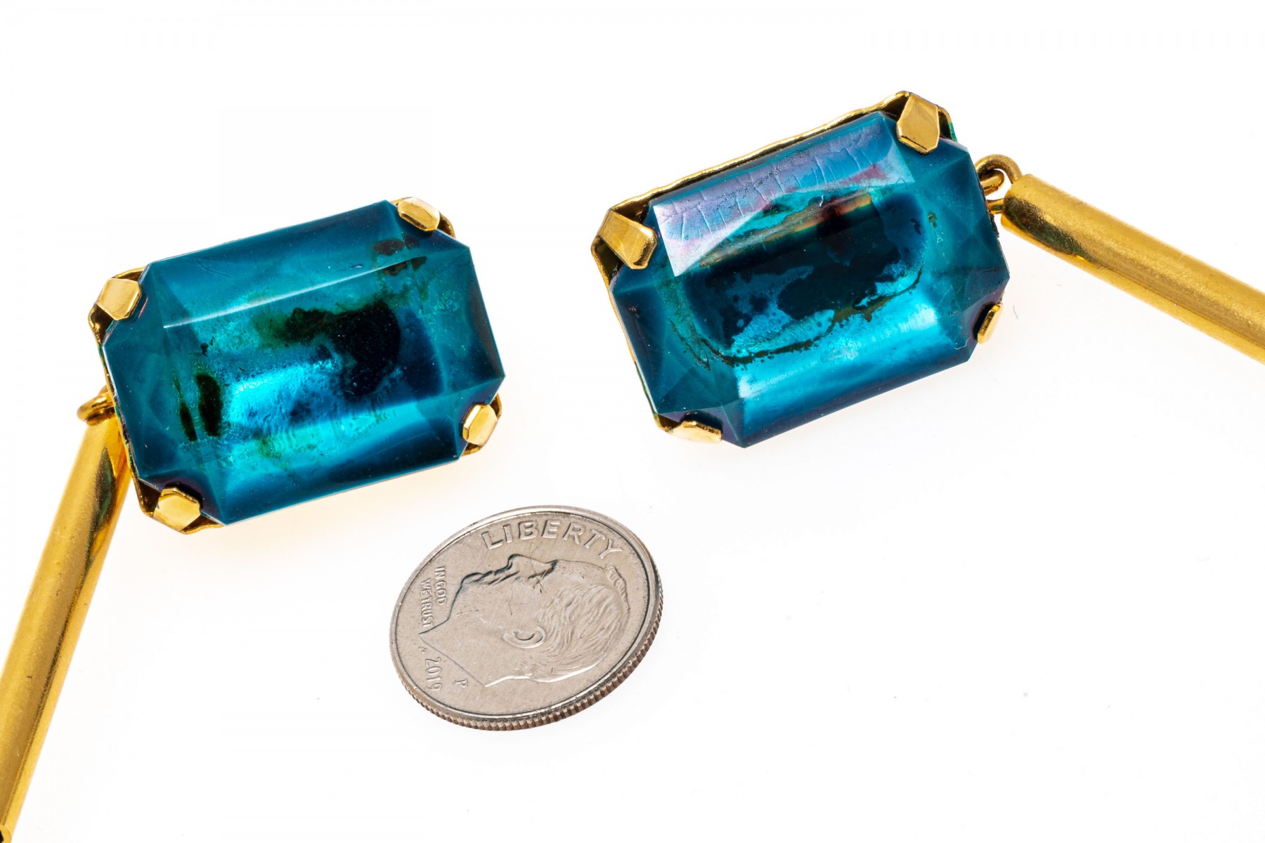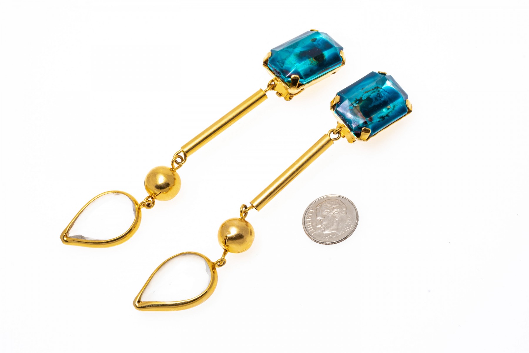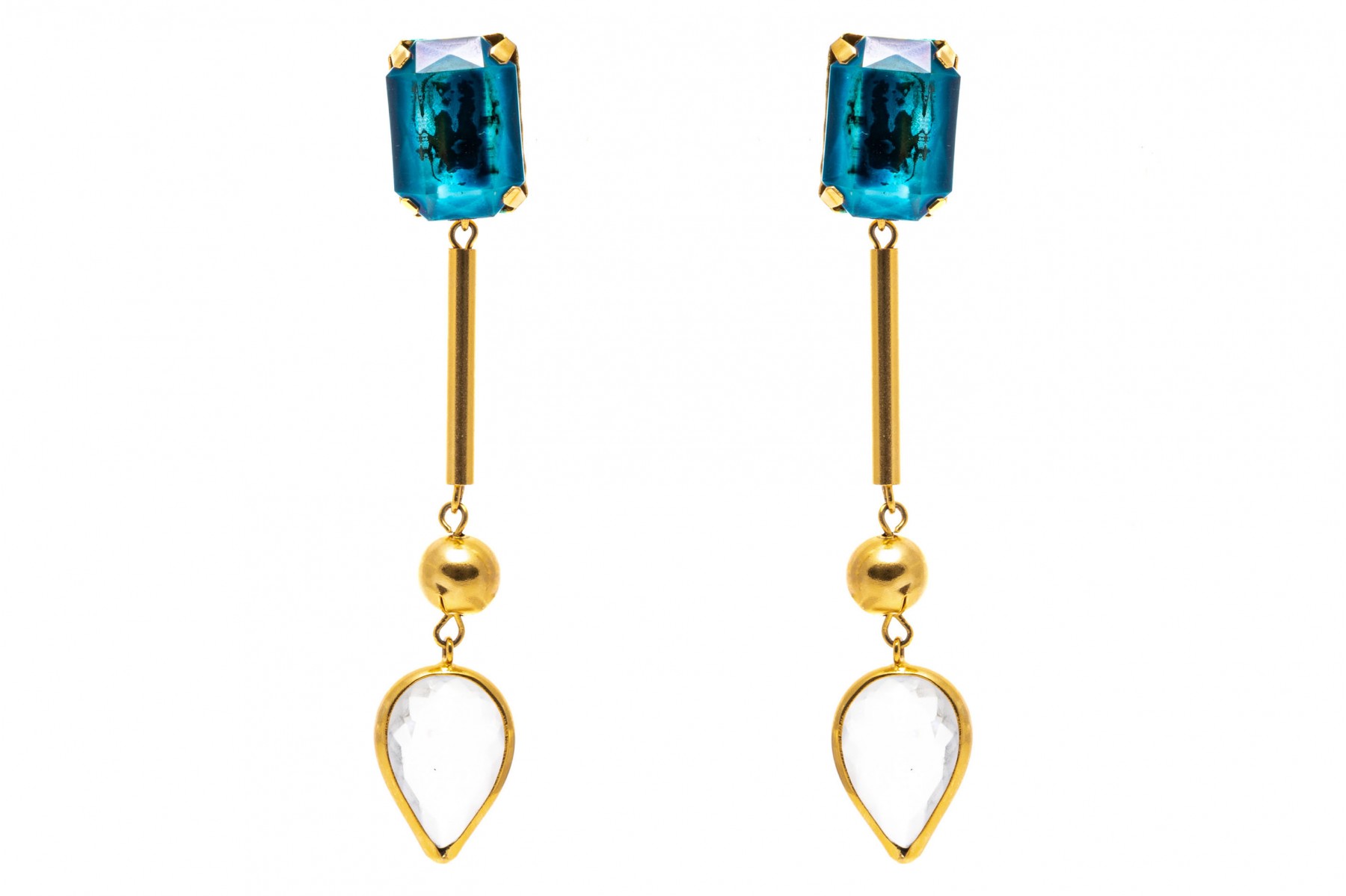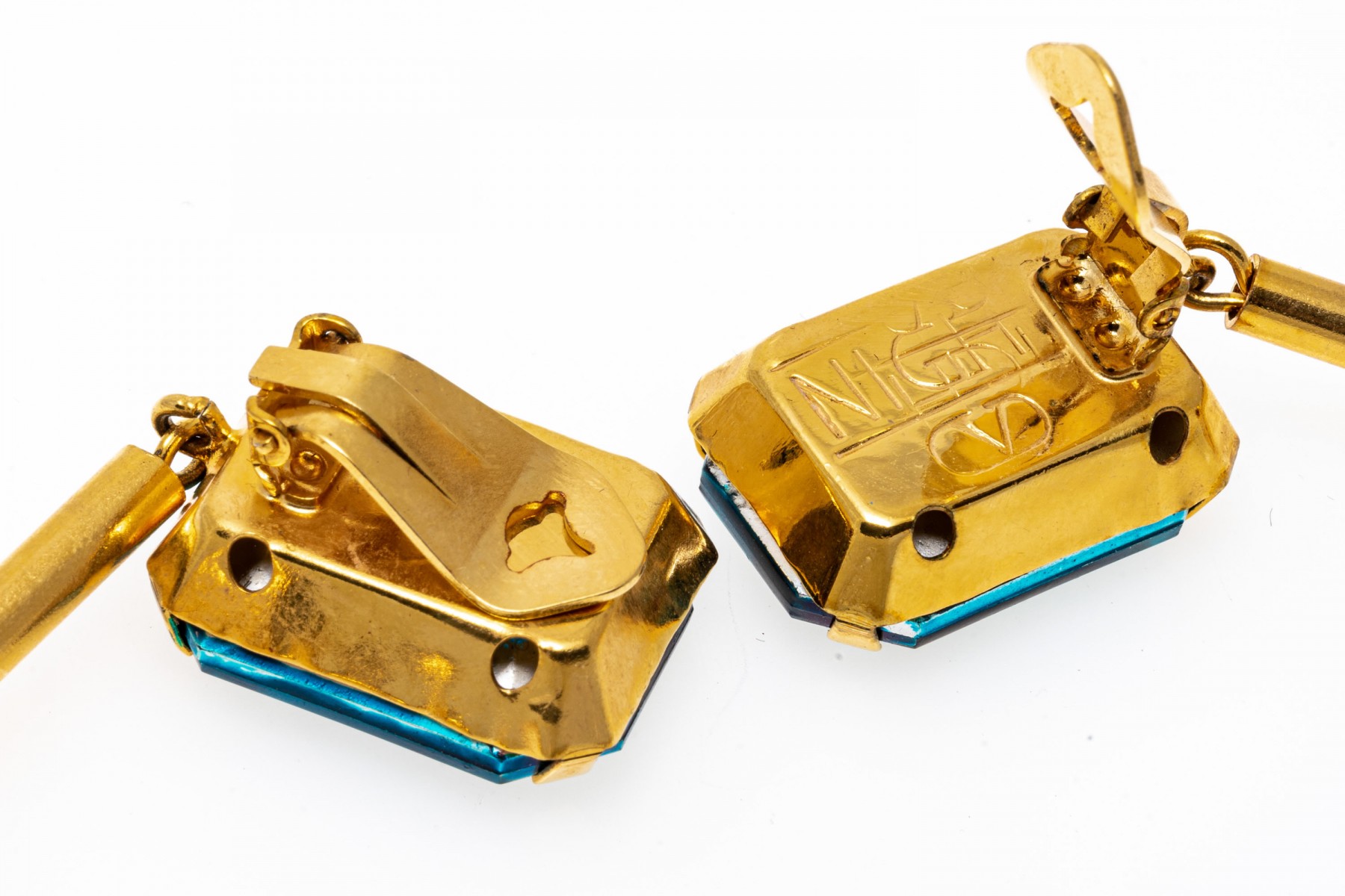 A pair of Valentino 'Night' drop style earrings. The earrings have a rectangular blue stimulant at the top and inverted white stimulants suspended at the base. Clip style backings.