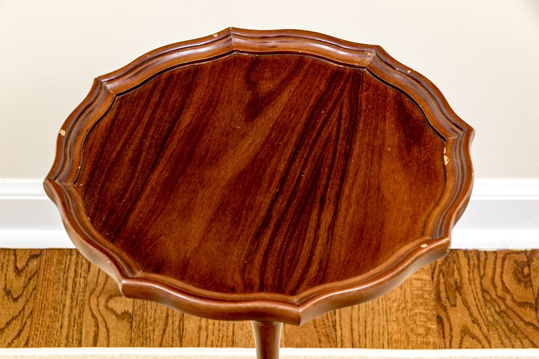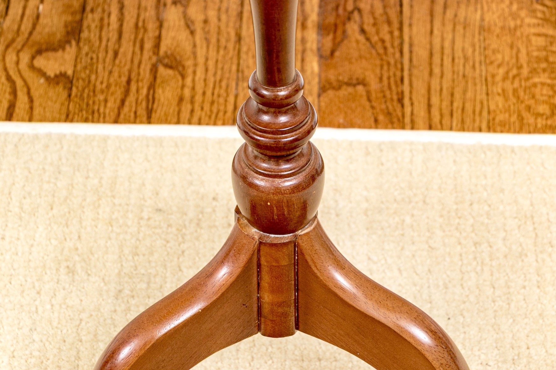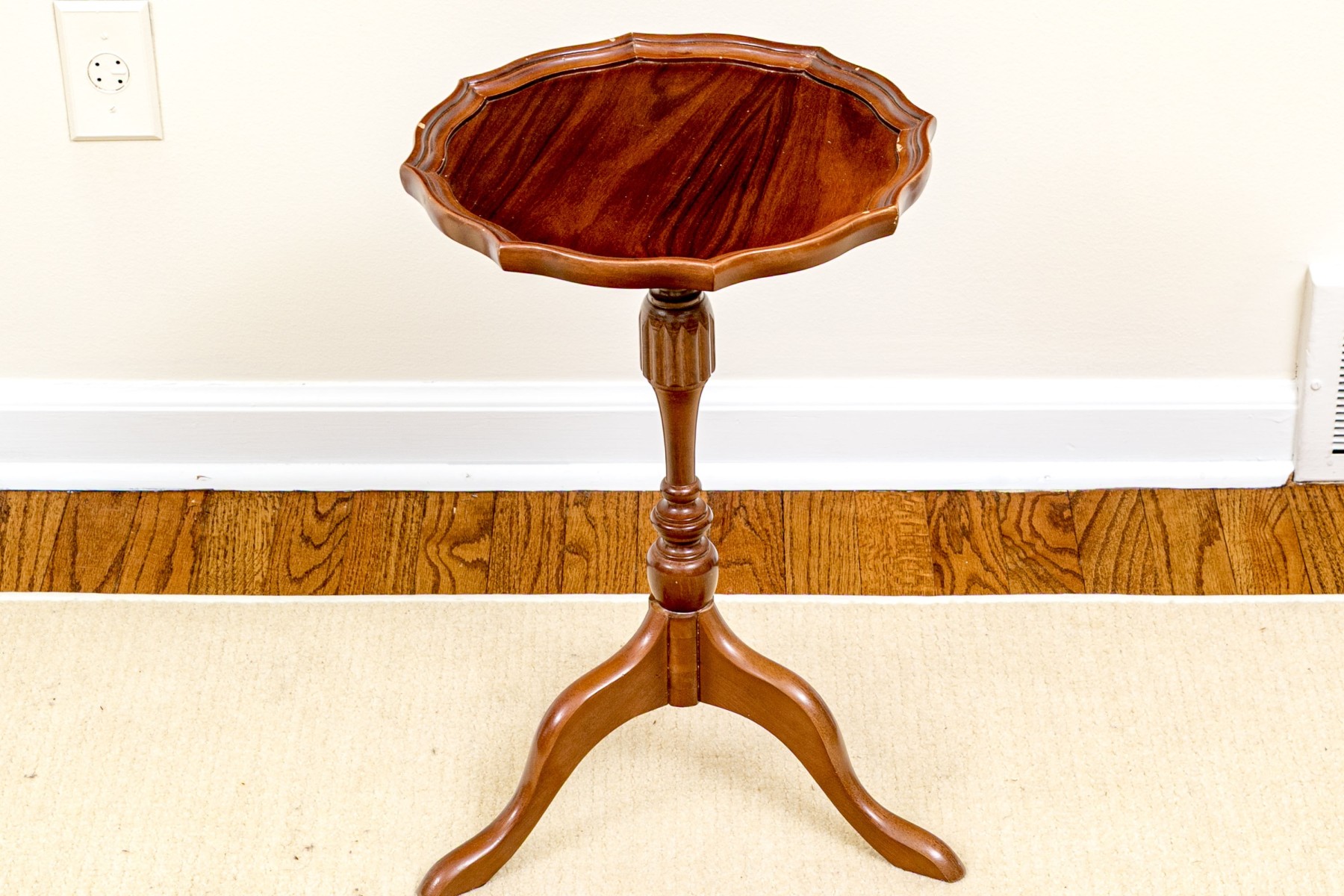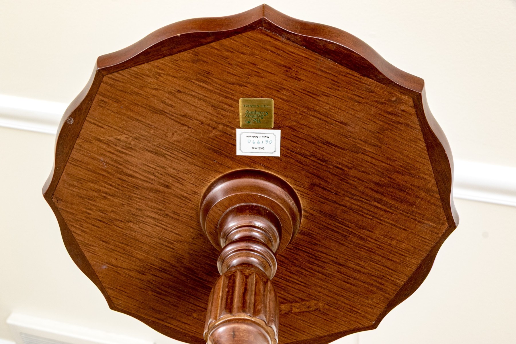 A quality Bombay Company gueridon table in classic Queen Anne design, showcasing a shapely circular top with a pie crust edge raised over a baluster pedestal on cabriole legs with slipper feet.