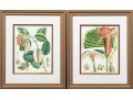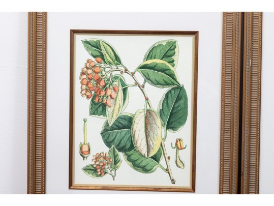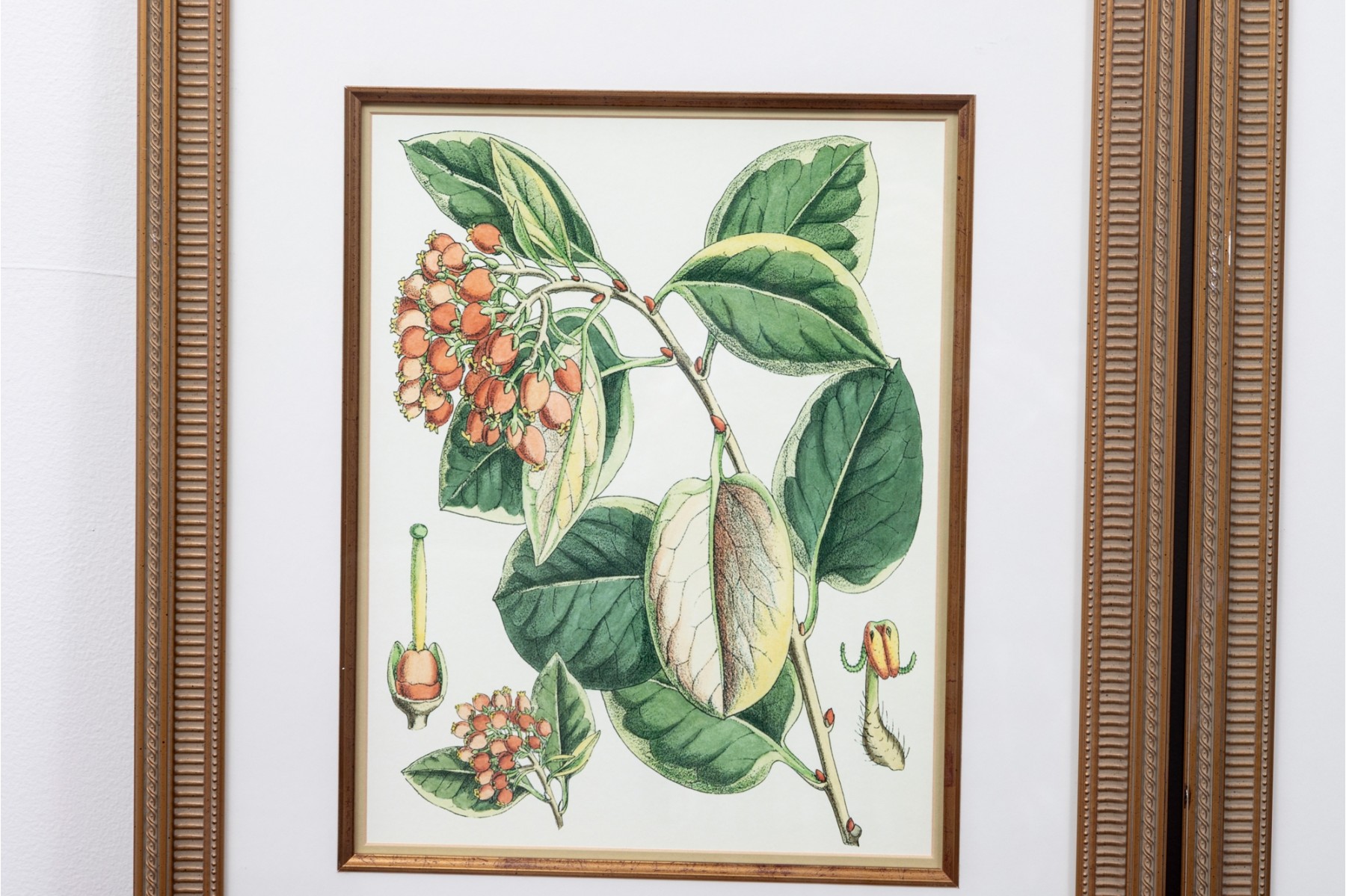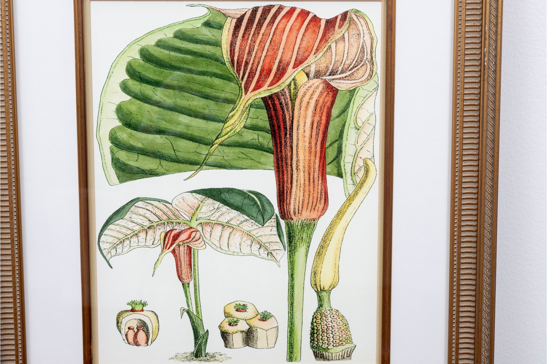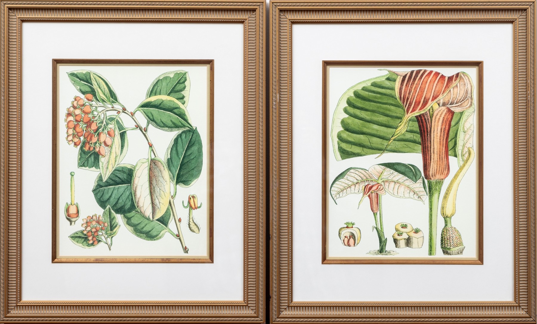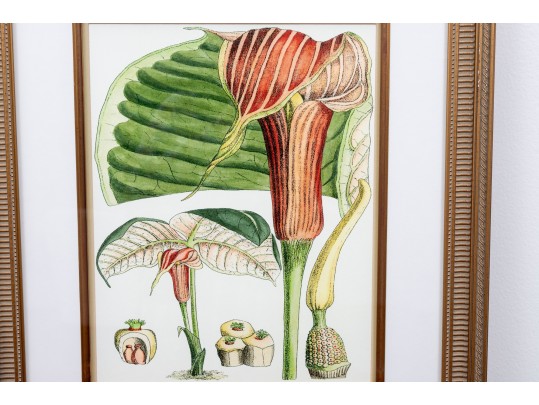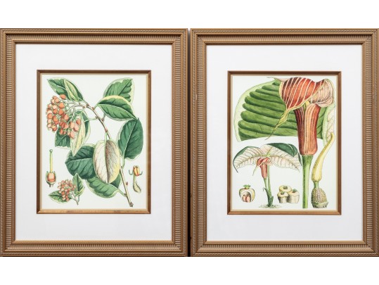 A coordinating pair of classic botany prints titled "Botanical Fantasy" by an unknown artist. These color prints feature elegant plants enclosed in contemporary gilt frames, contained behind glass.