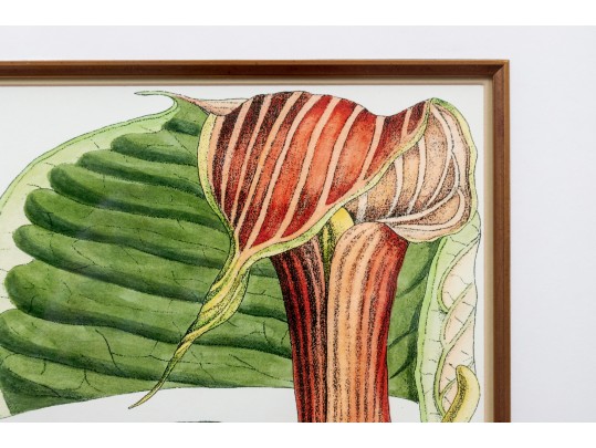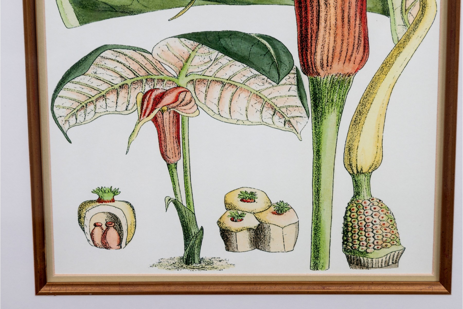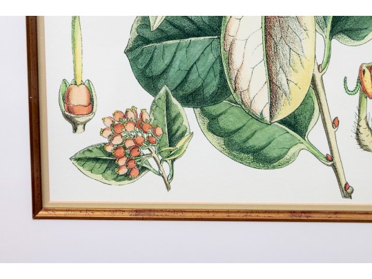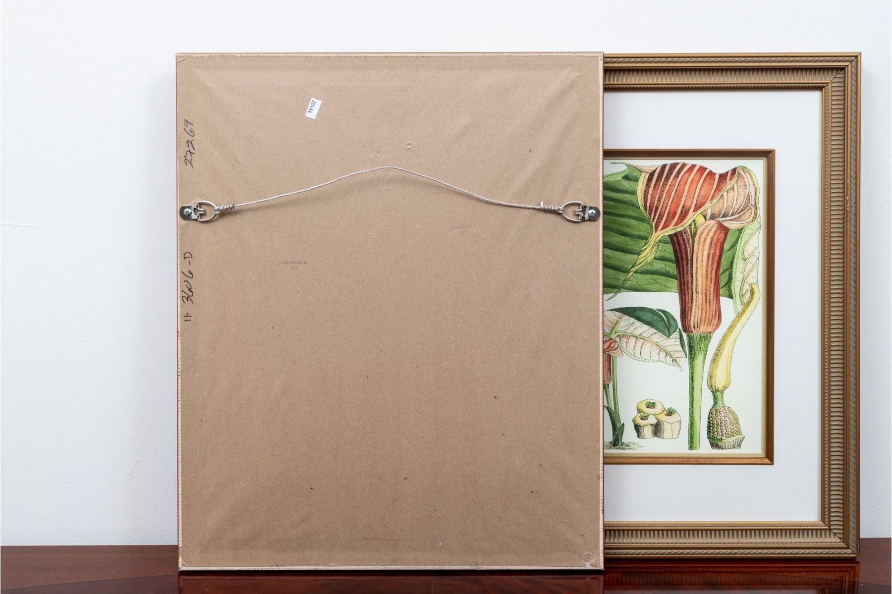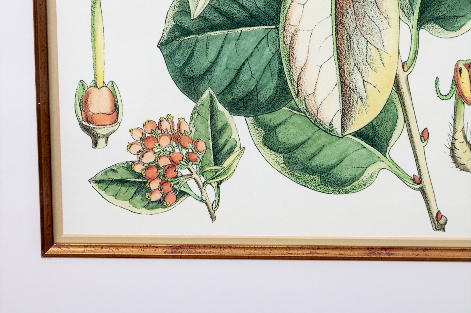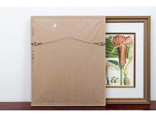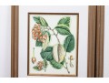 A coordinating pair of classic botany prints titled "Botanical Fantasy" by an unknown artist. These color prints feature elegant plants enclosed in contemporary gilt frames, contained behind glass.