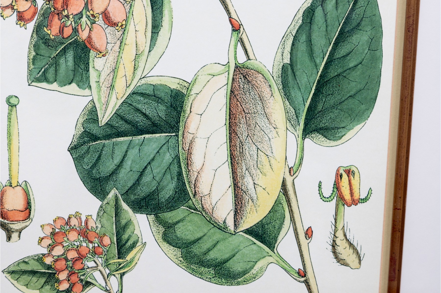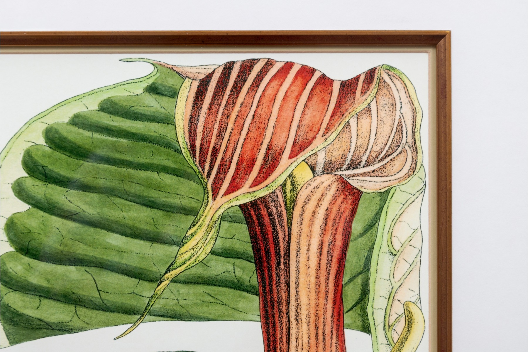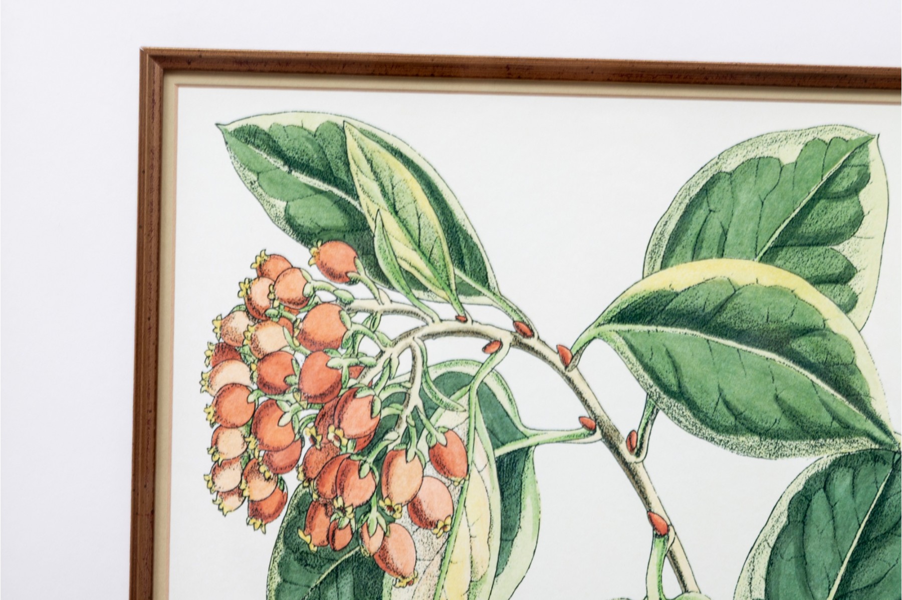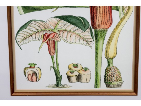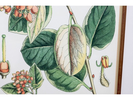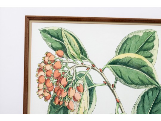 A coordinating pair of classic botany prints titled "Botanical Fantasy" by an unknown artist. These color prints feature elegant plants enclosed in contemporary gilt frames, contained behind glass.