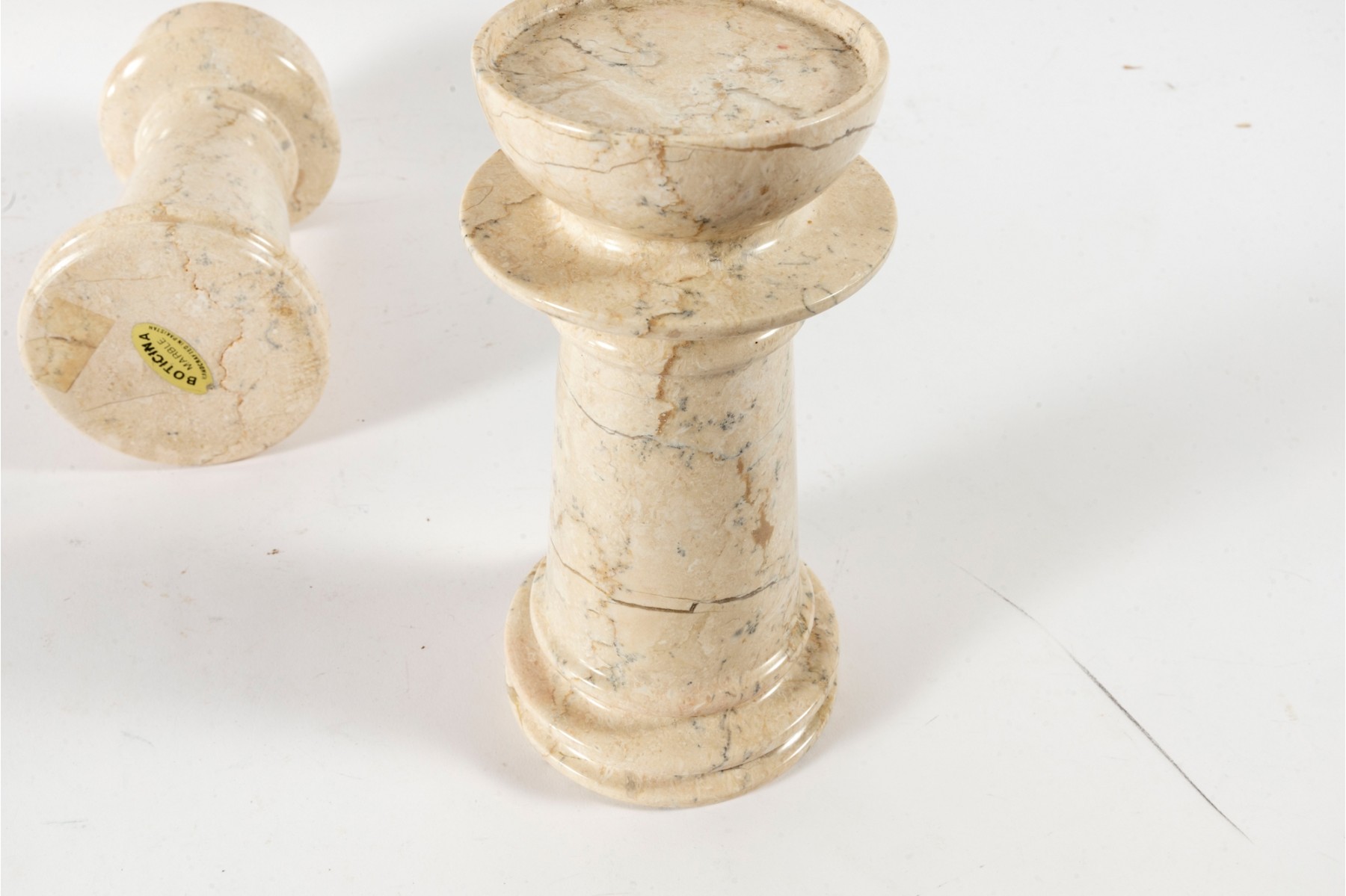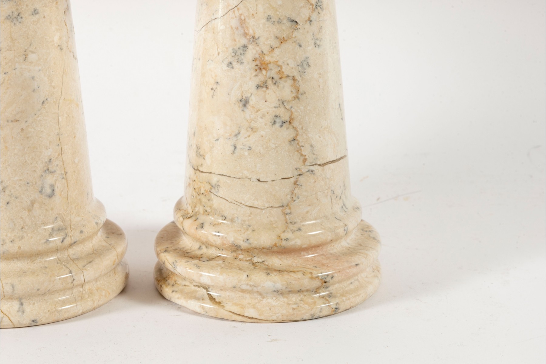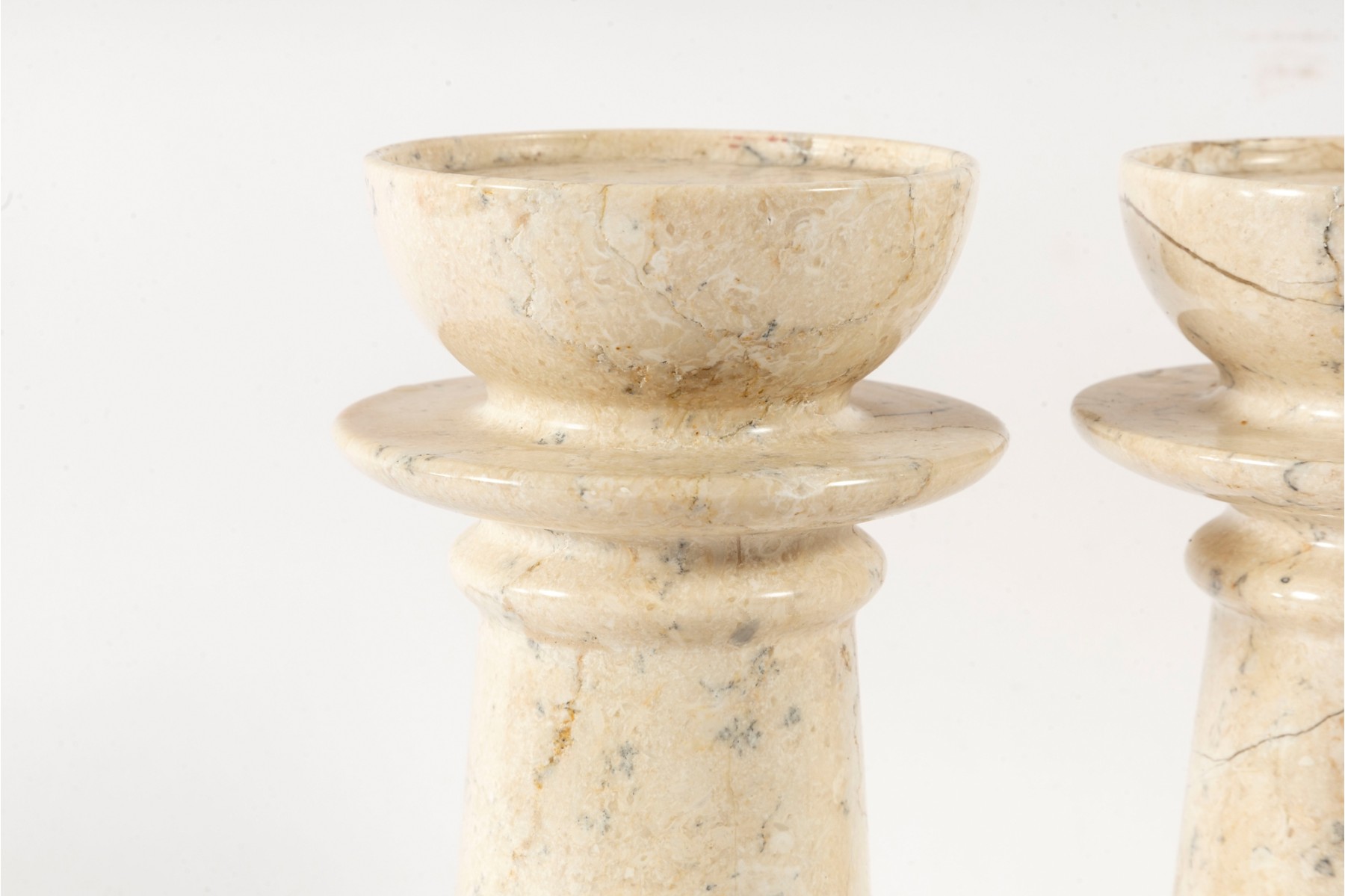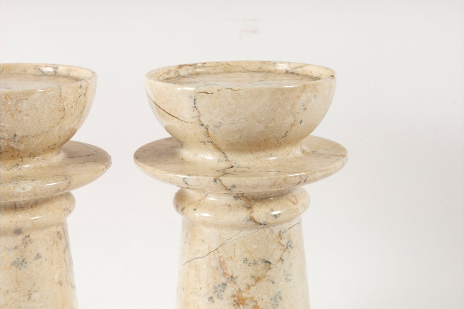 Two candle holder columns. Crafted from premium beige Boticina marble, each column showcases natural veining.