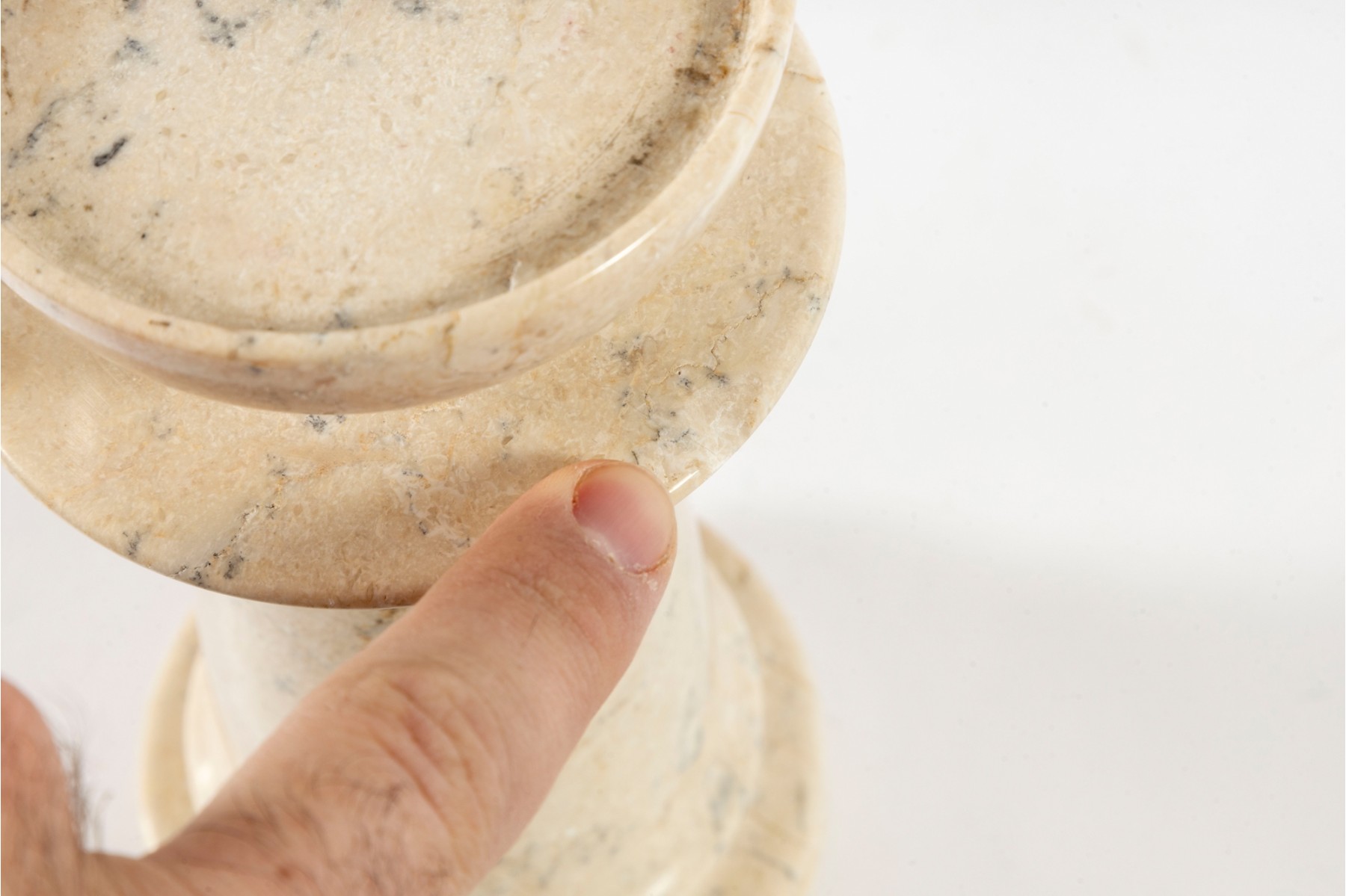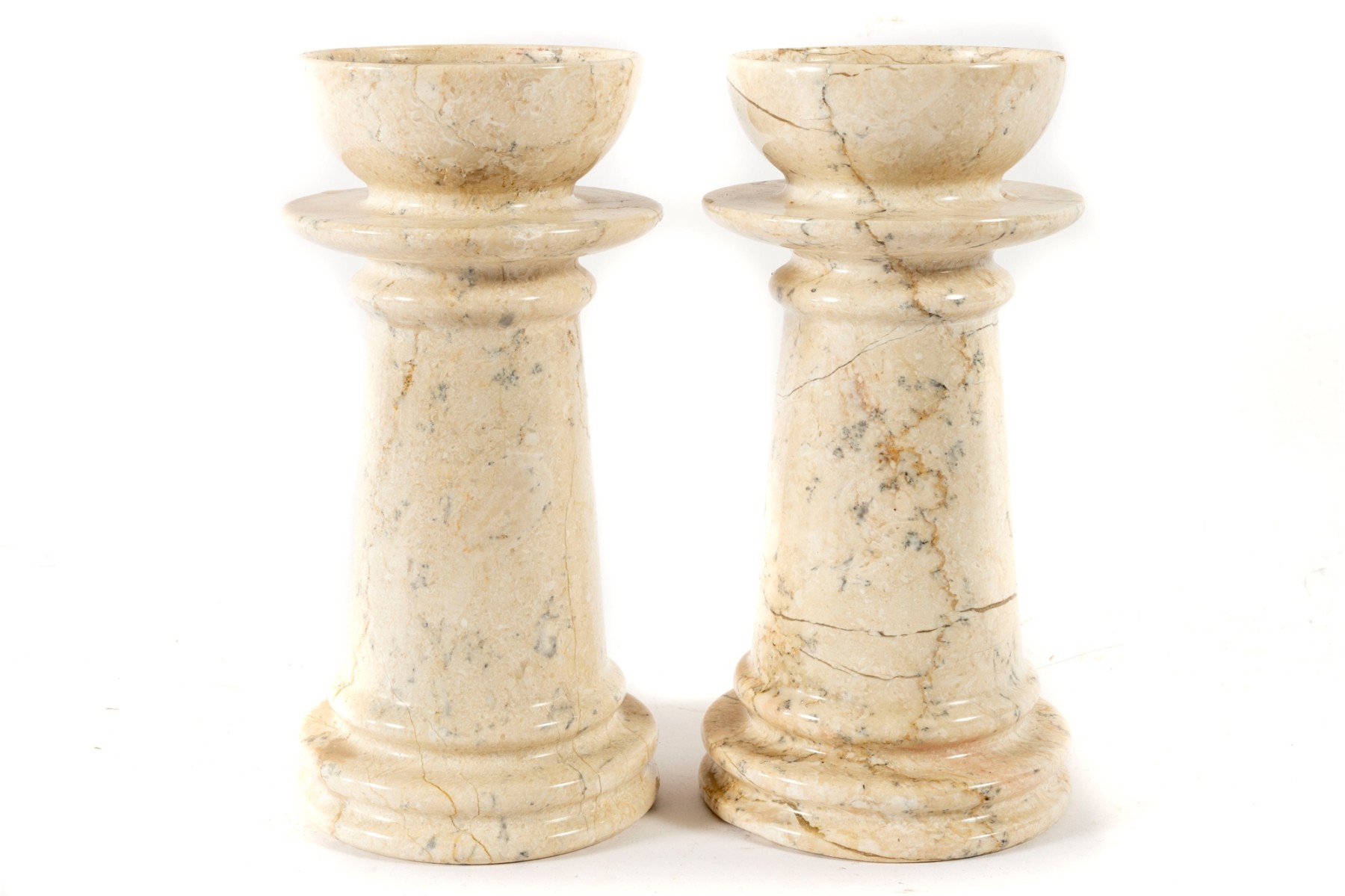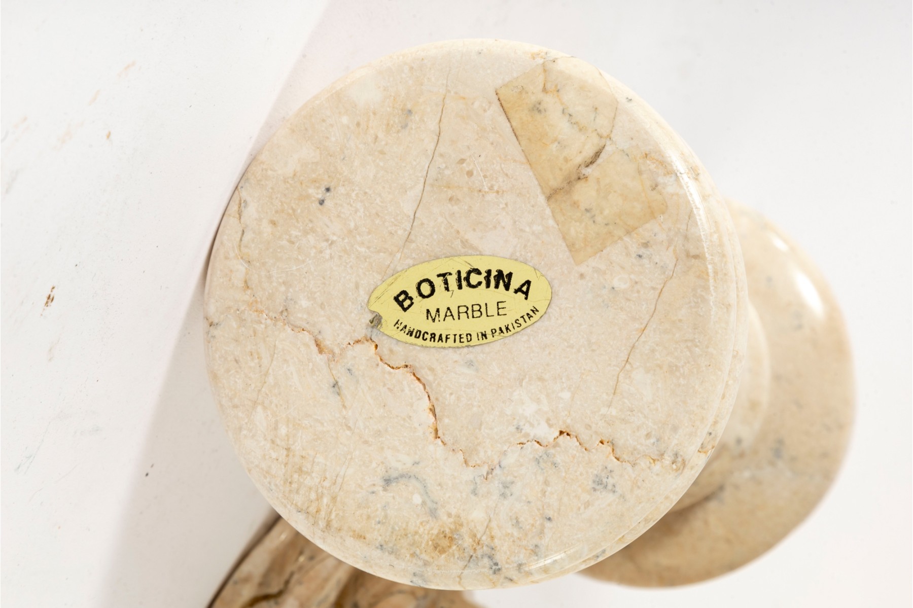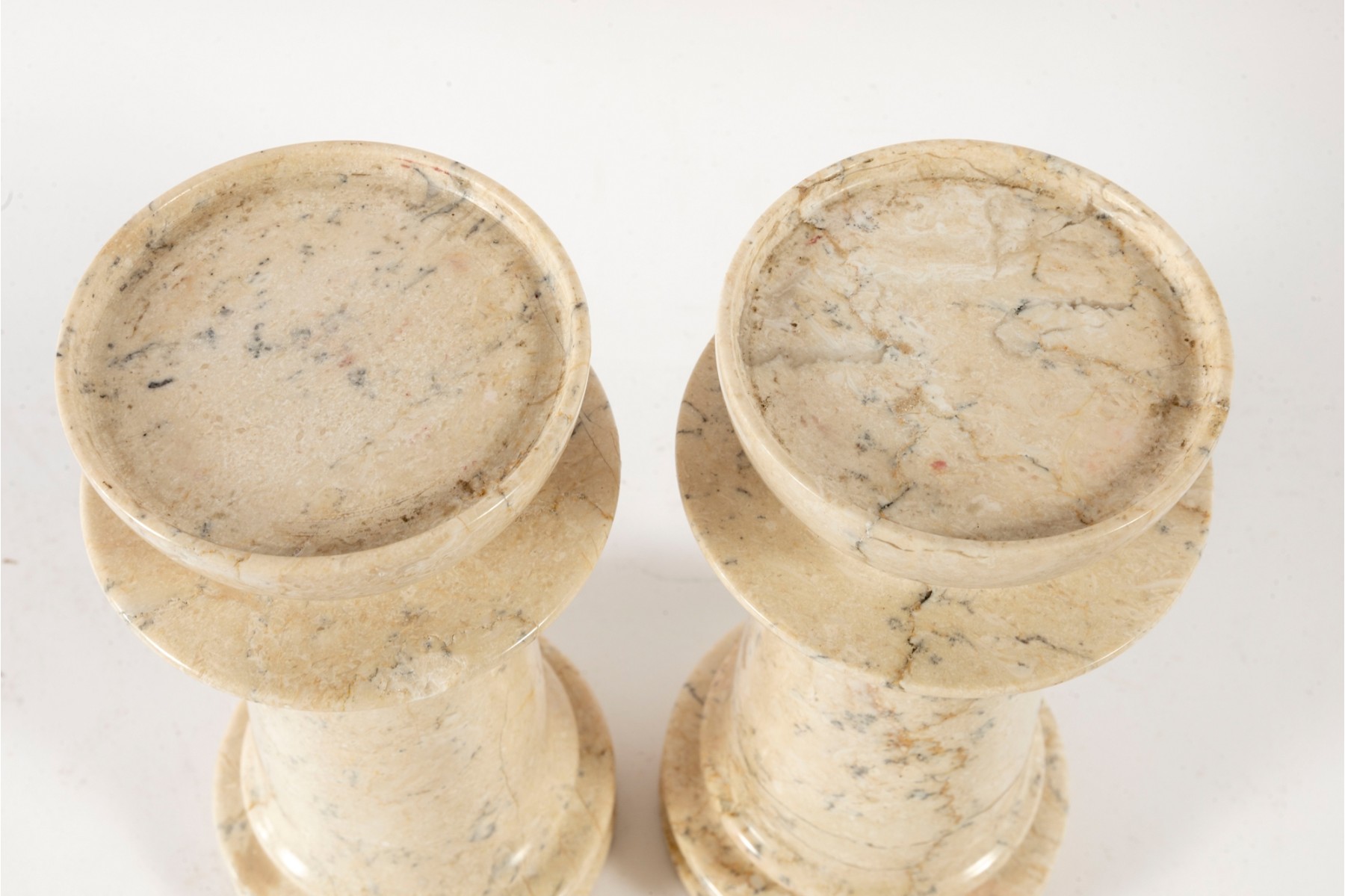 Two candle holder columns. Crafted from premium beige Boticina marble, each column showcases natural veining.