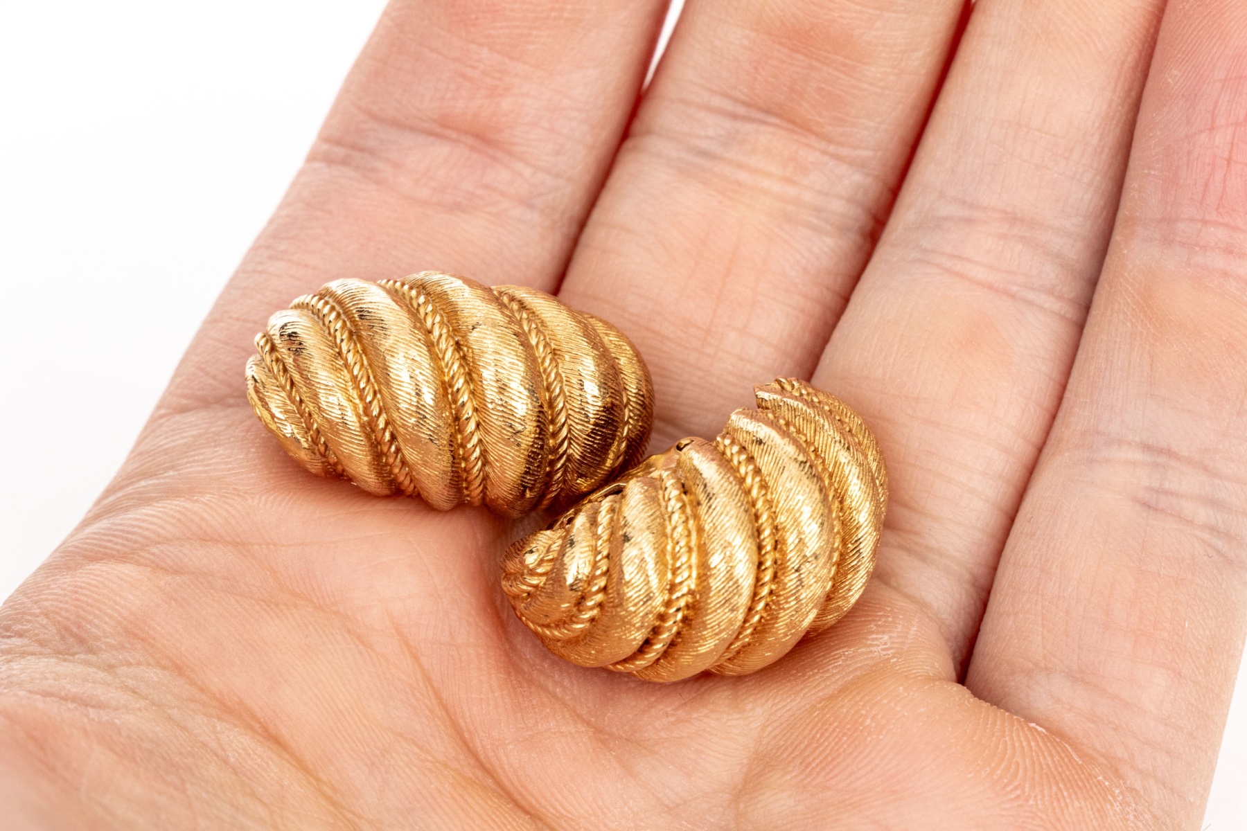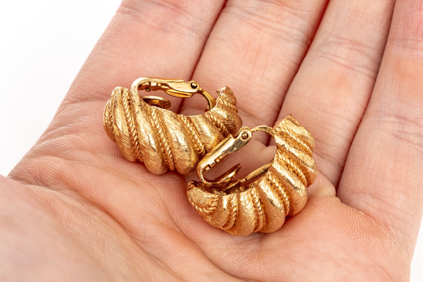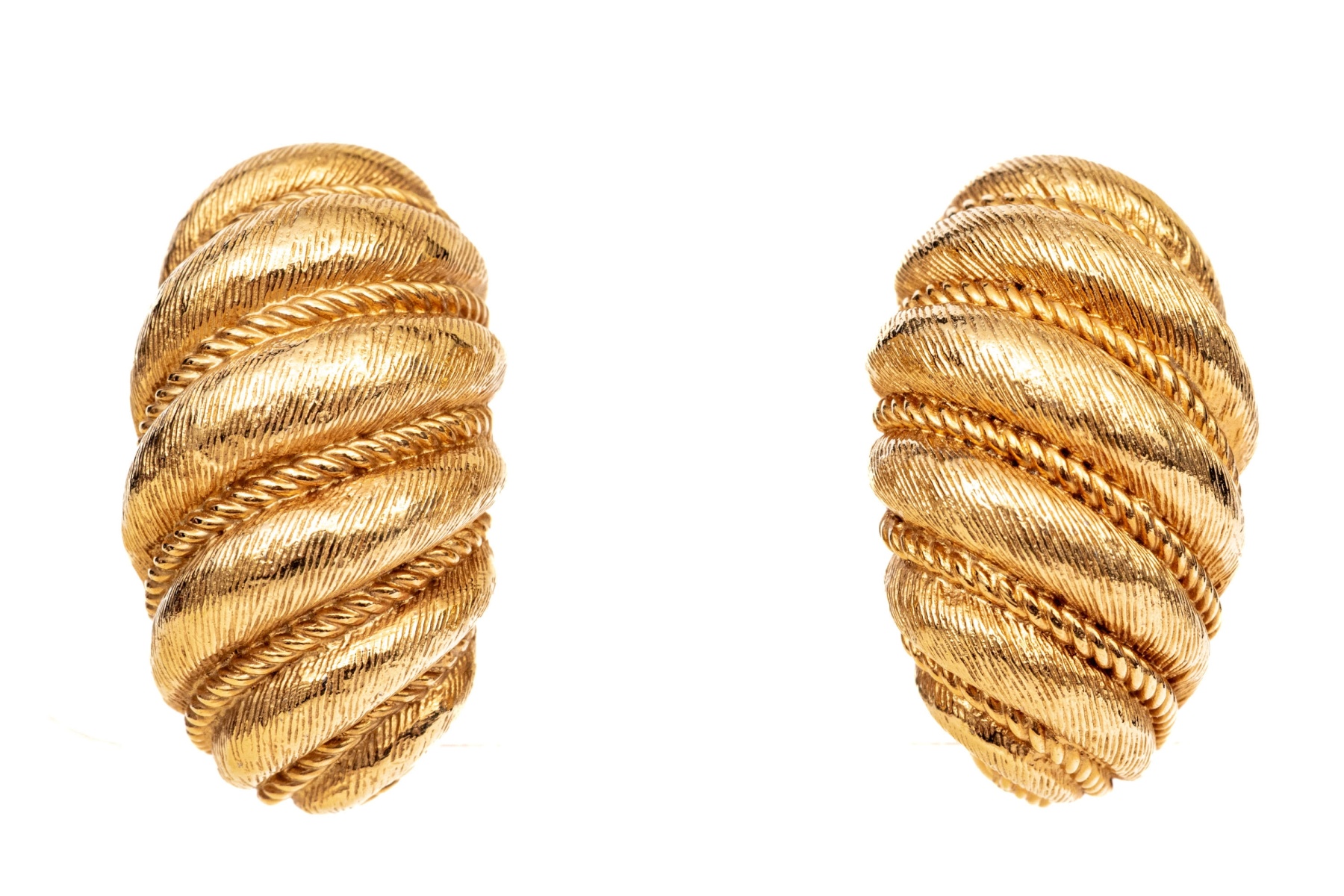 Boucheron 18k yellow gold magnificent vintage matte ribbed shrimp style clip on earrings, finished with clip on style backs, no posts
