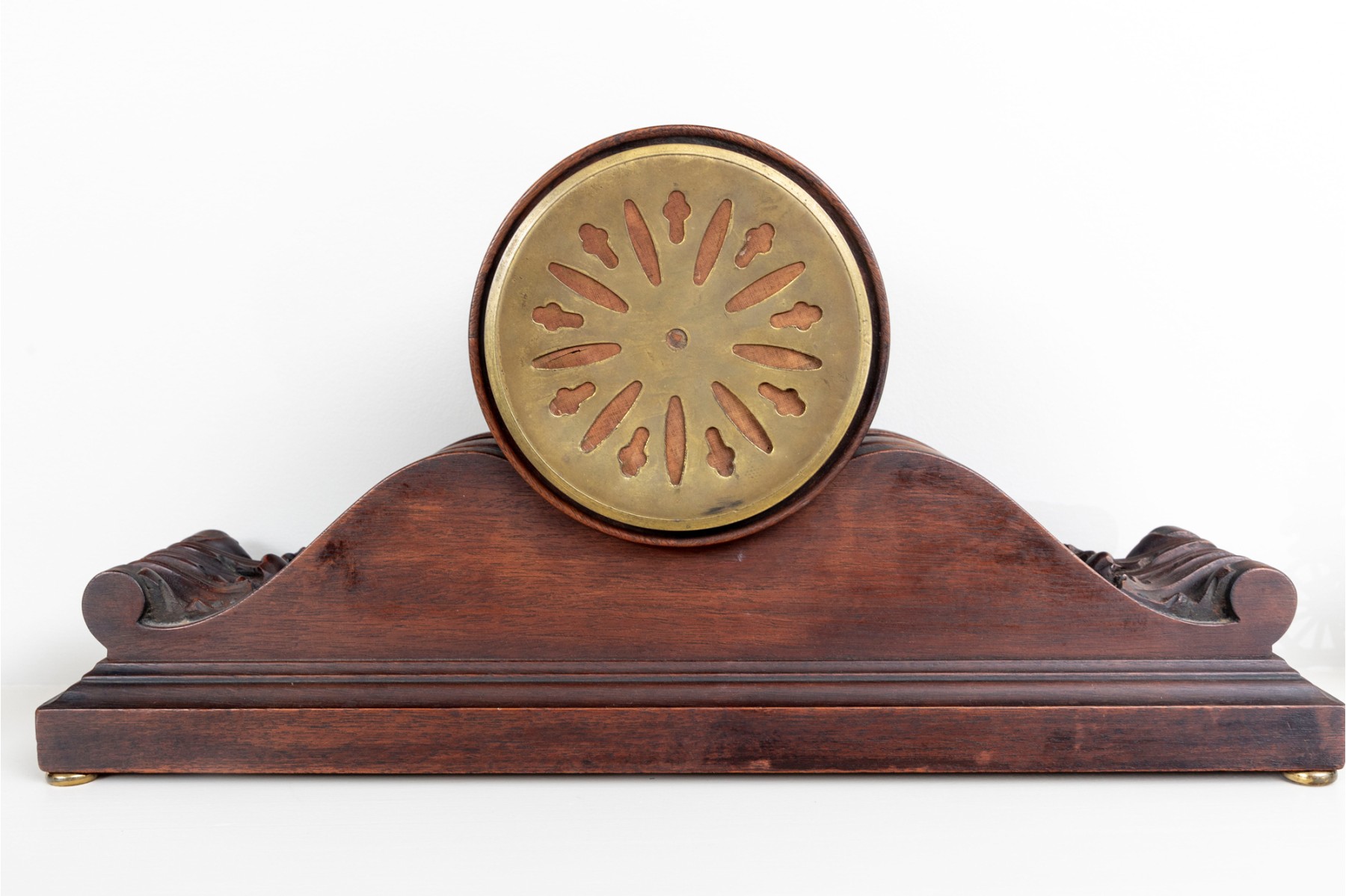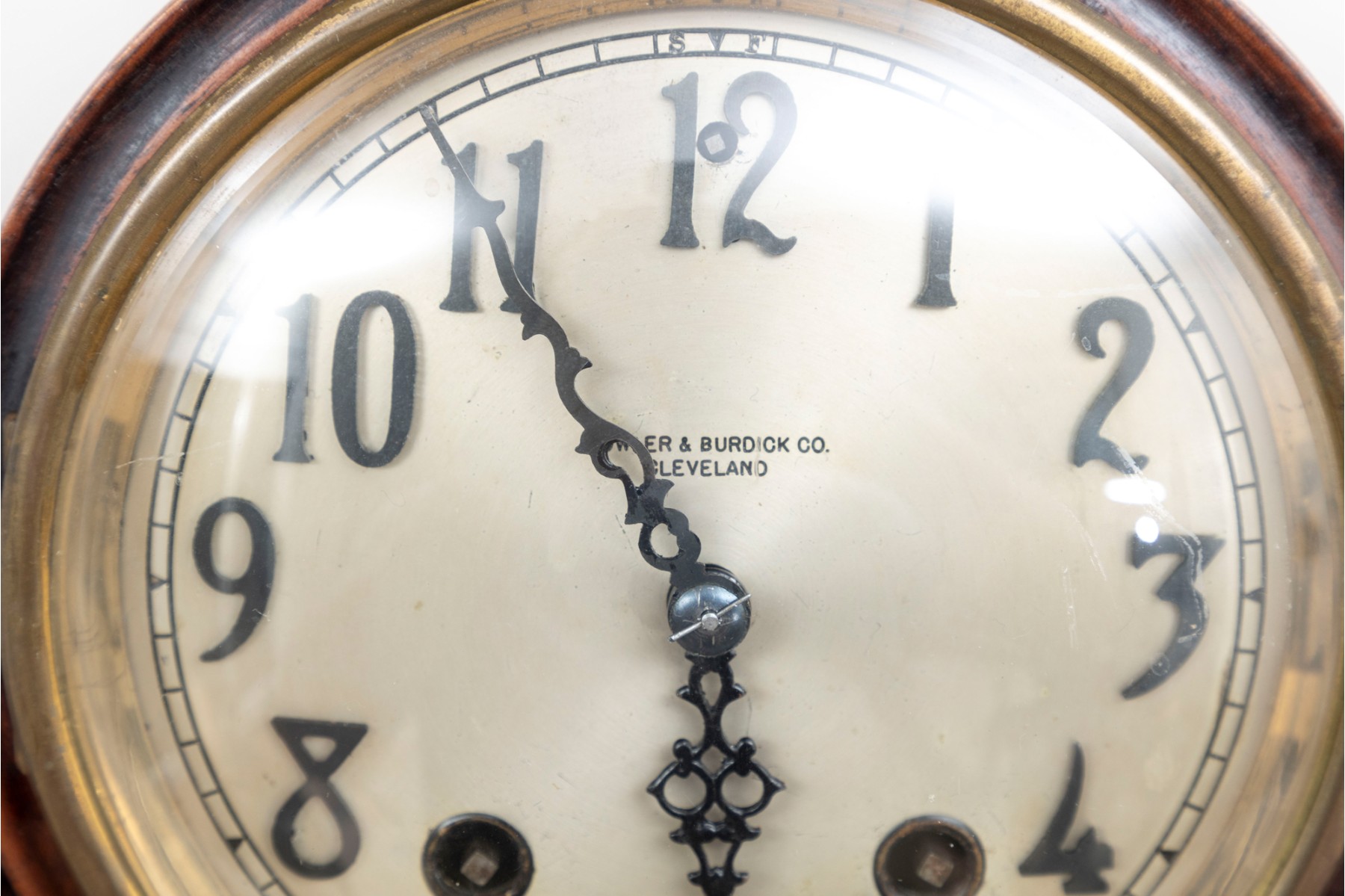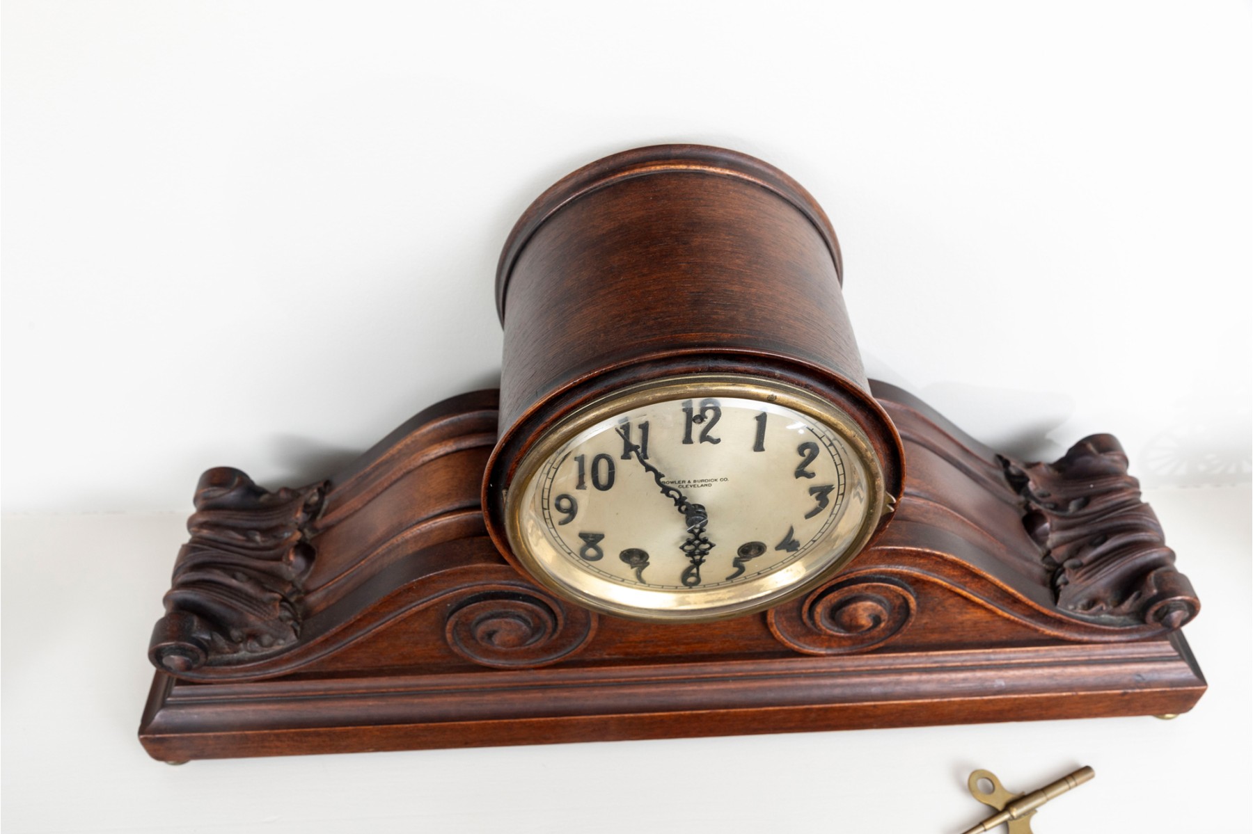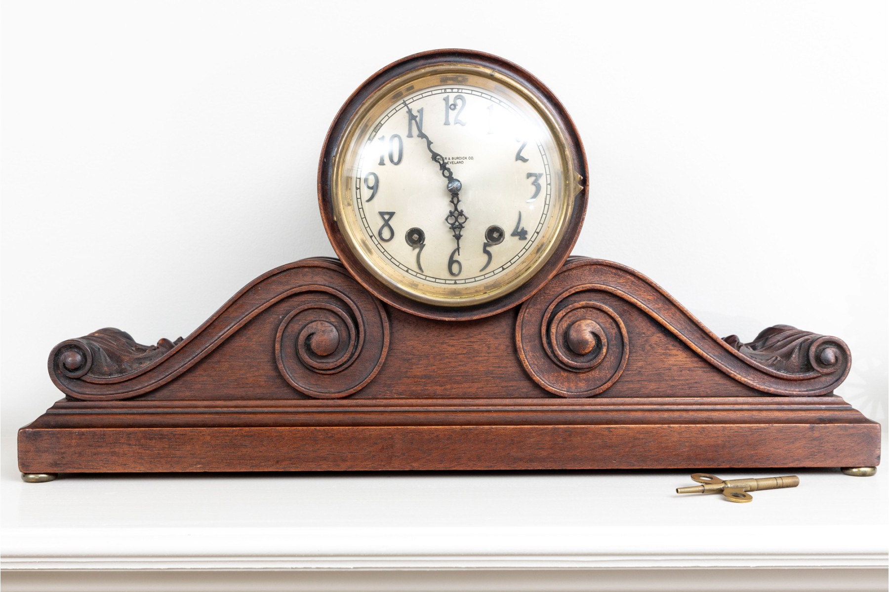A handsome Bowler & Burdick Co. mantel clock in traditional form, displaying a gray dial with black Arabic numerals in a traditional warm brown wood house with elegant scrolled motifs.