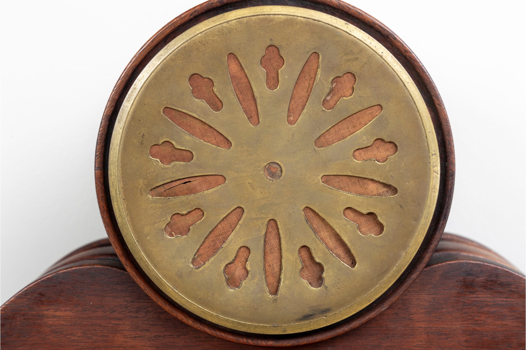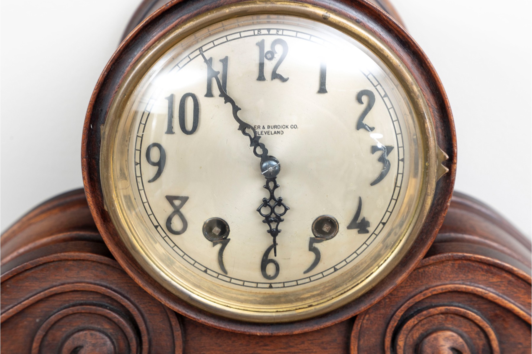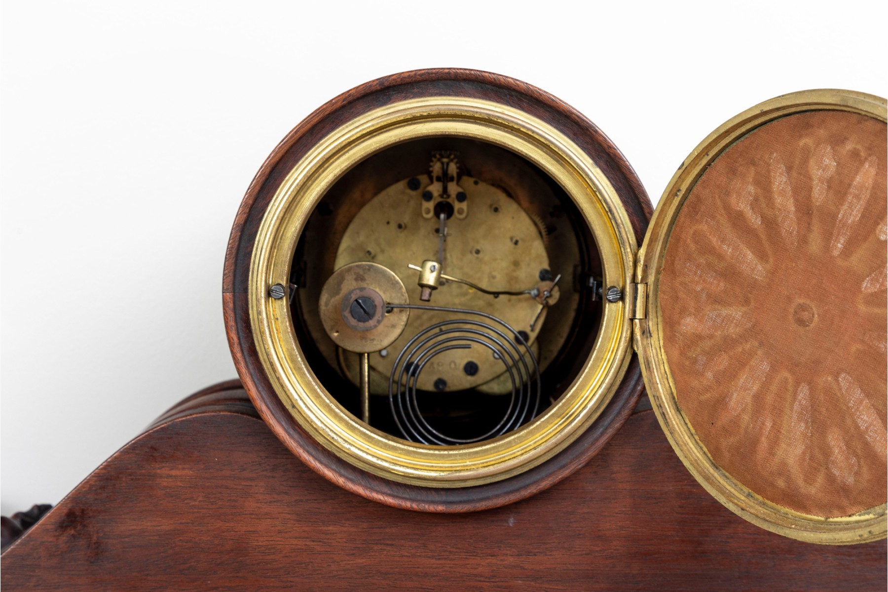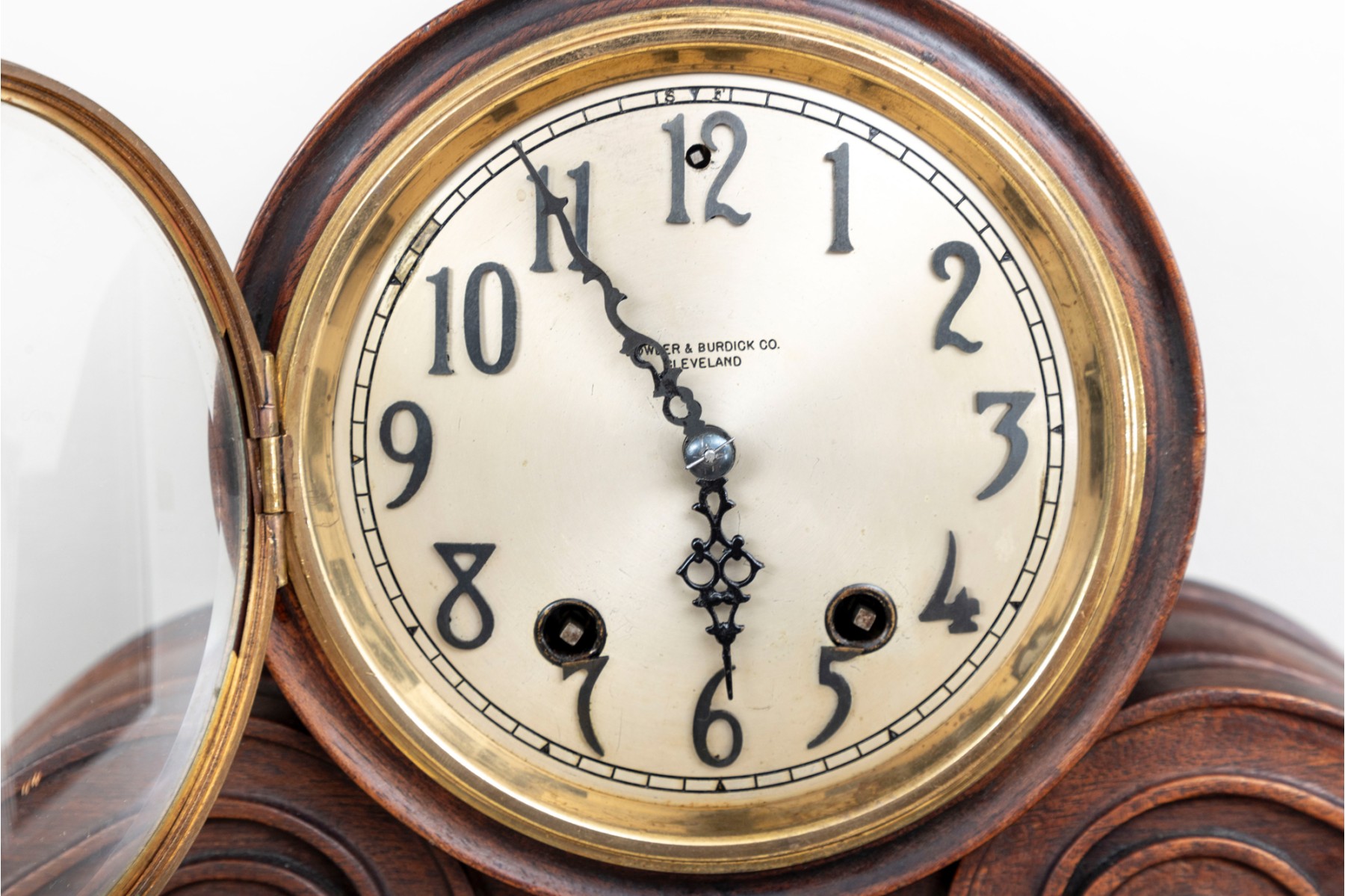 A handsome Bowler & Burdick Co. mantel clock in traditional form, displaying a gray dial with black Arabic numerals in a traditional warm brown wood house with elegant scrolled motifs.