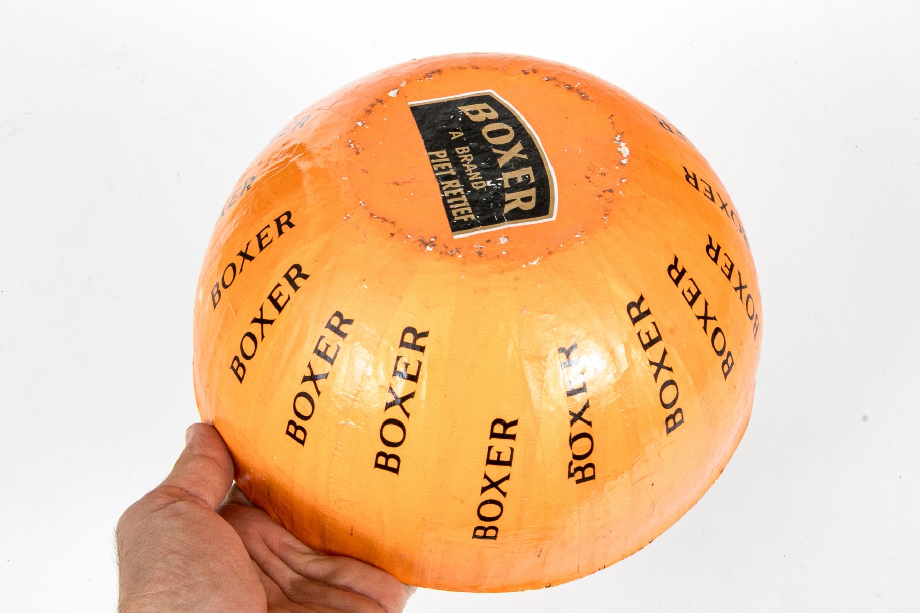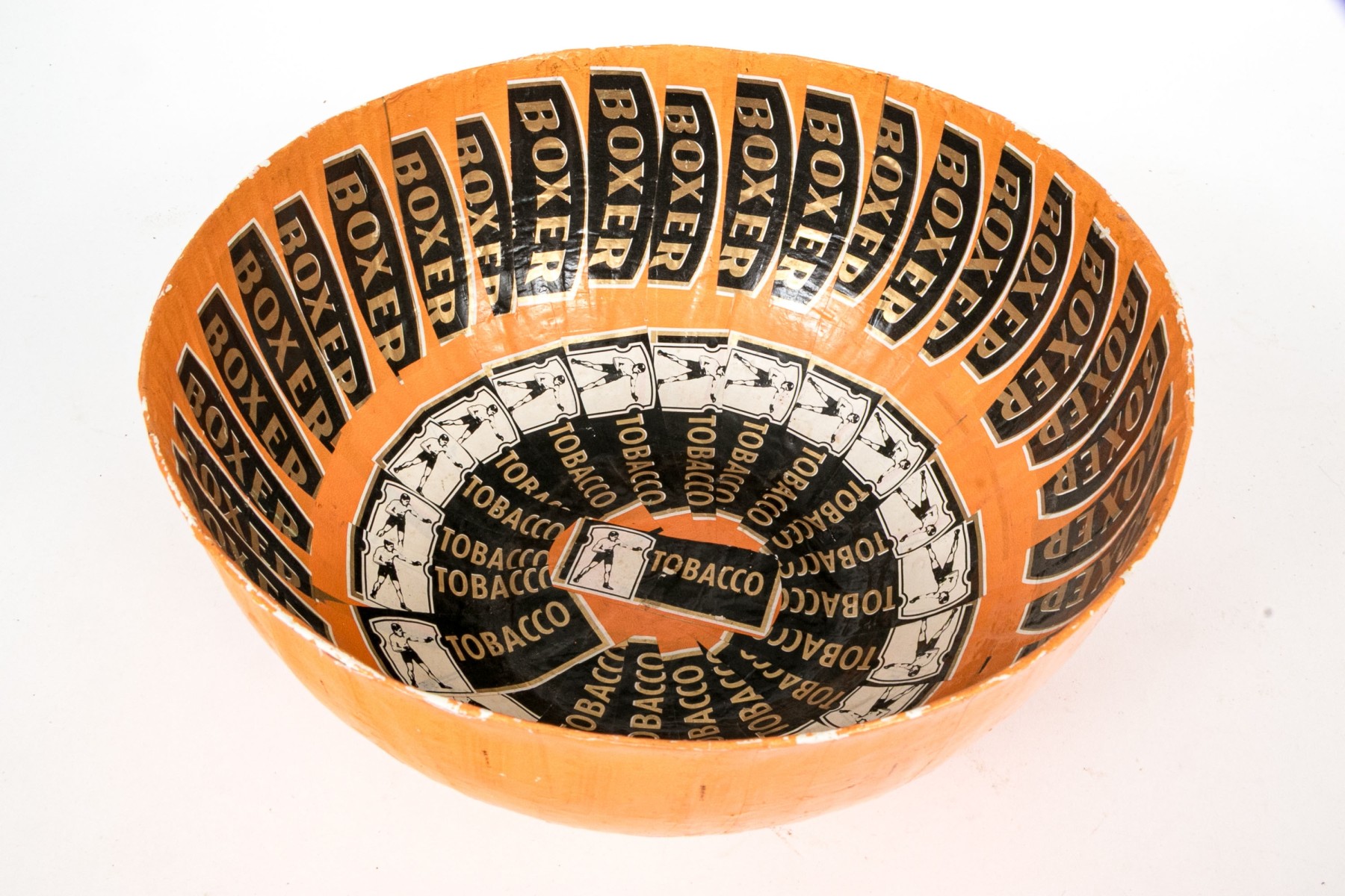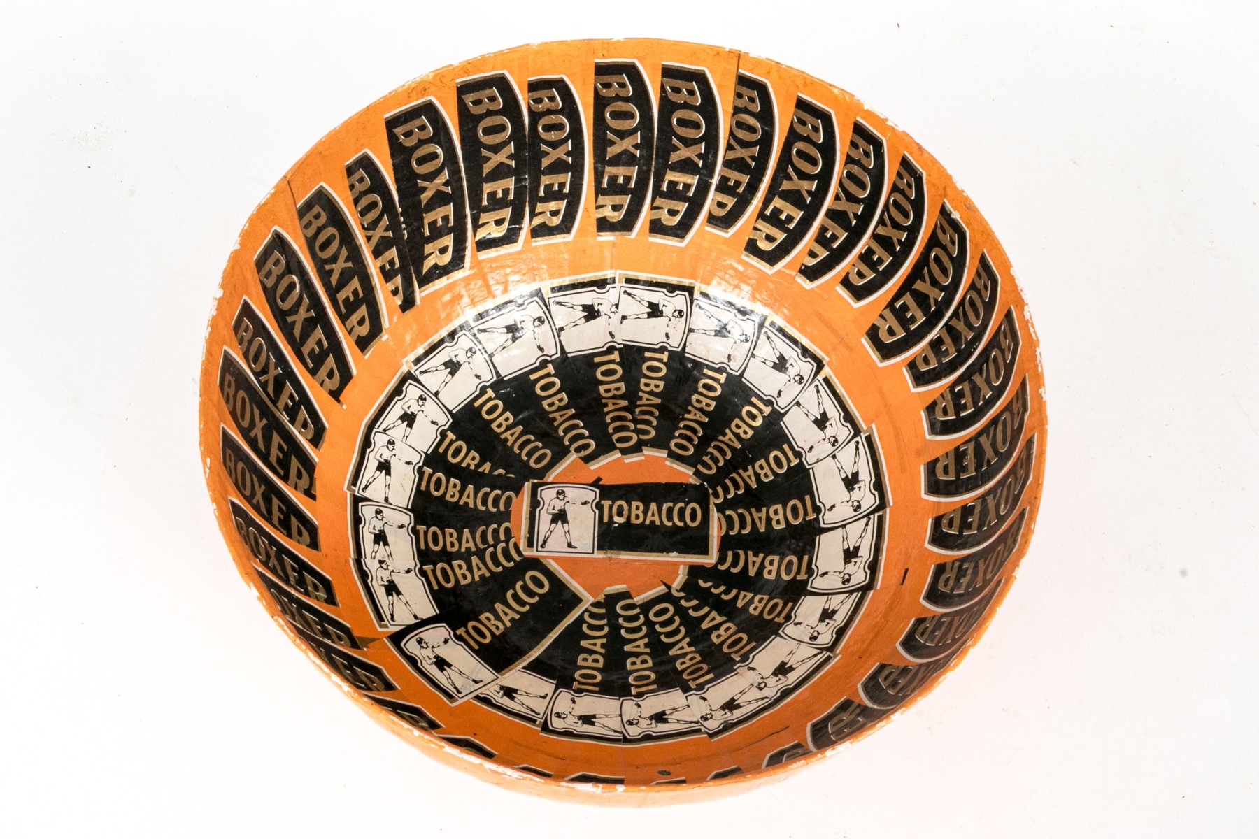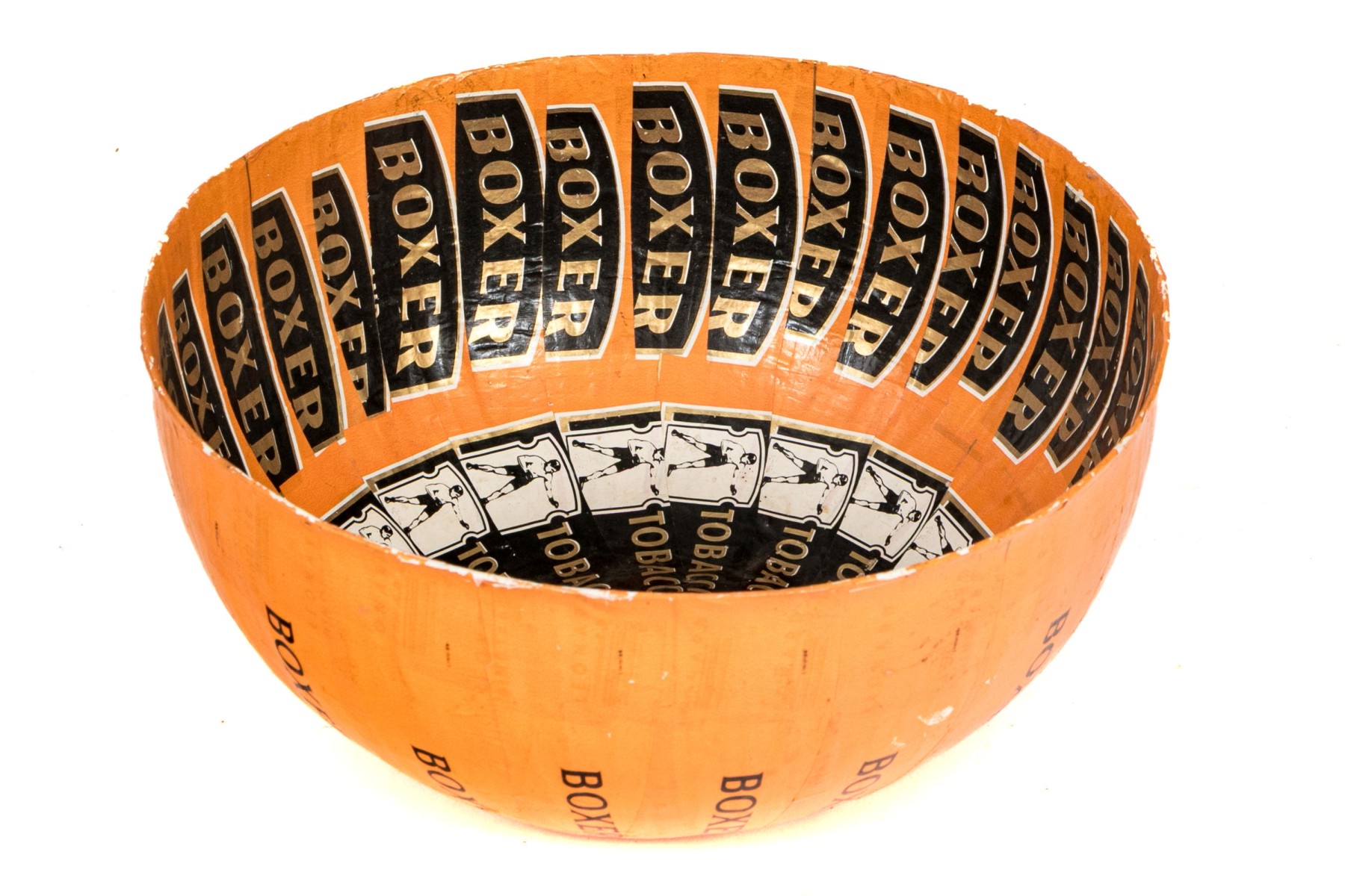 An eye-catching paper mache bowl constructed of Boxer Tobacco packaging with bright orange, black, and gilt labels showcasing imagery of a boxer and the Boxer logo repeated throughout the interior and exterior.