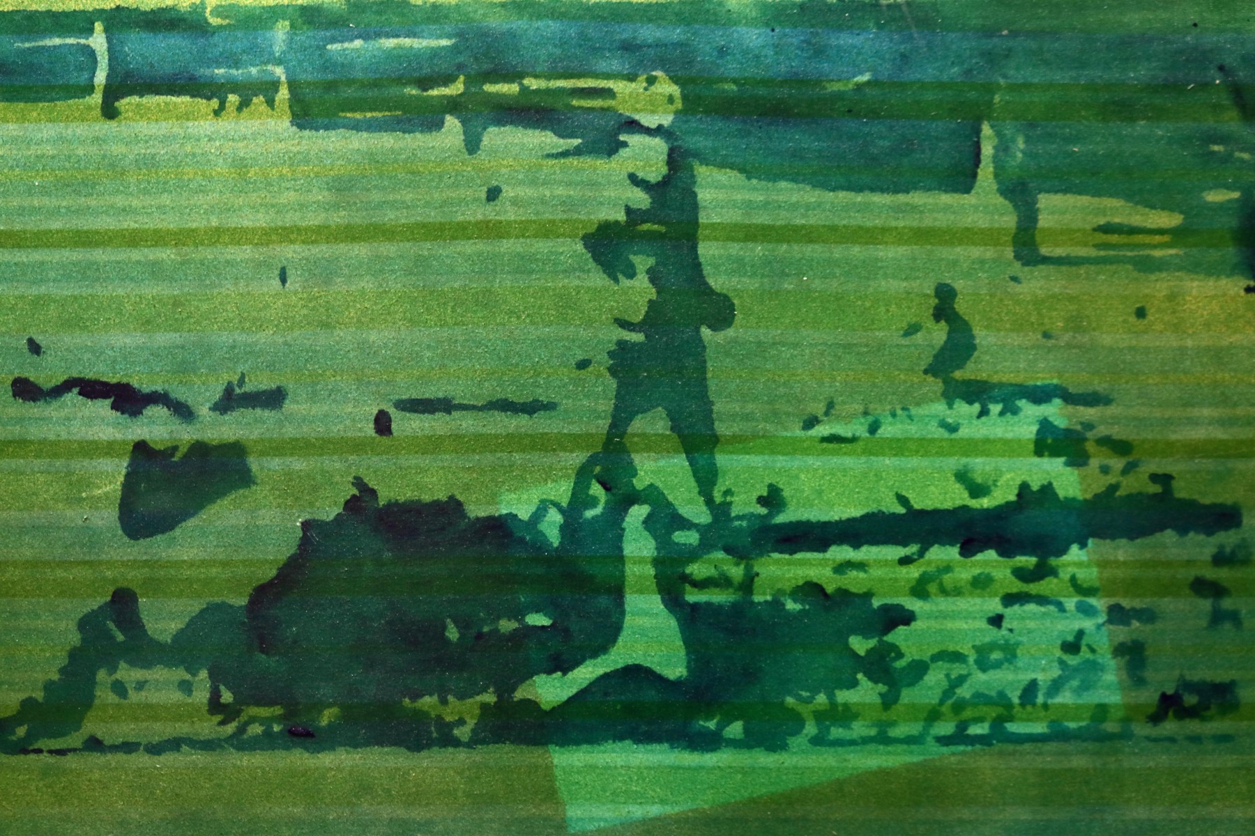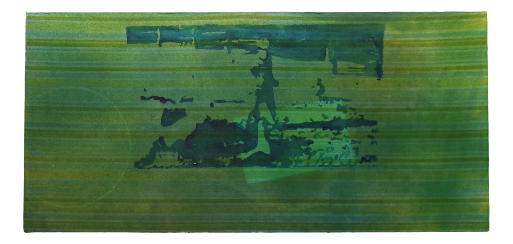 Dated 2002, this mixed media piece presents a figure subtly emerging from a field of textured, horizontal green and blue stripes. The tonal interplay and washes of pigment evoke movement, memory, and introspection—true to the title's playful yet introspective suggestion of identity and presence.