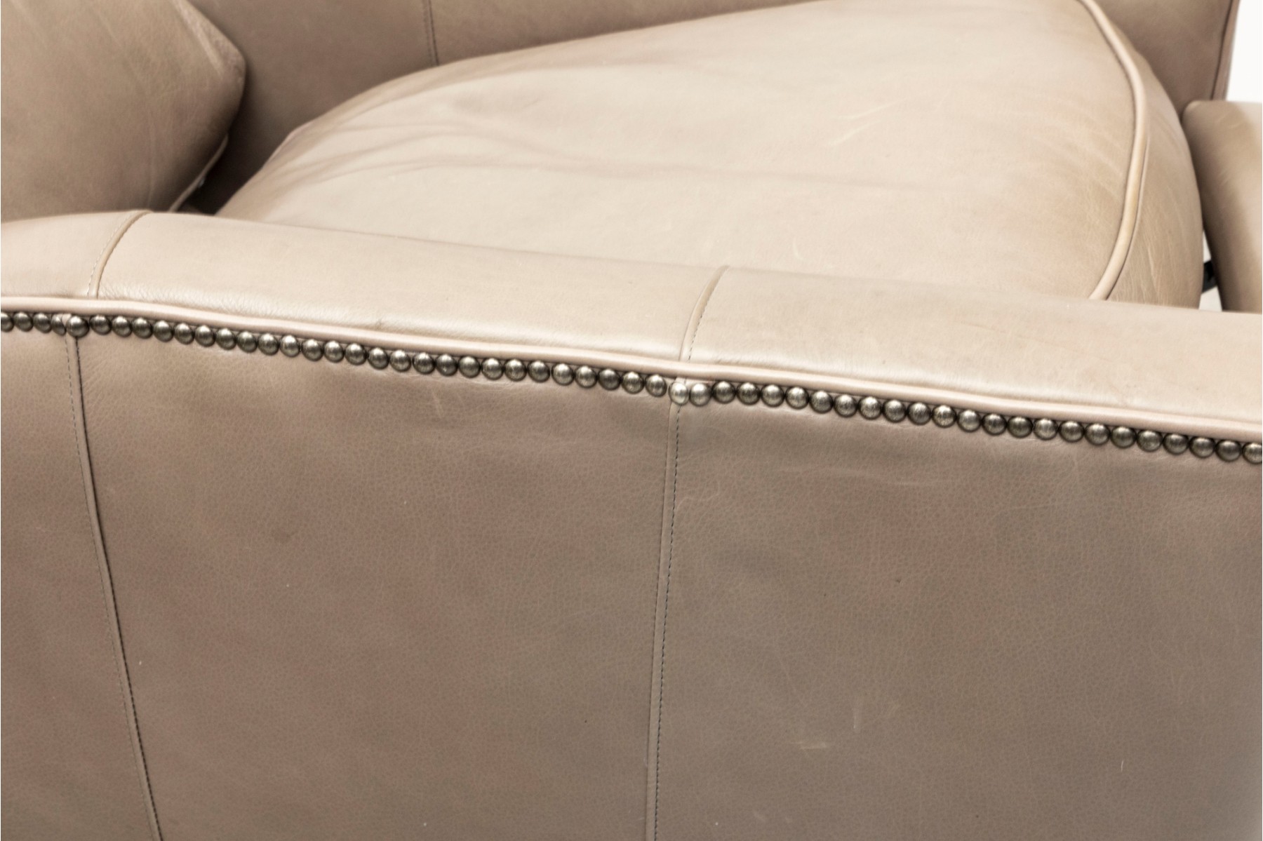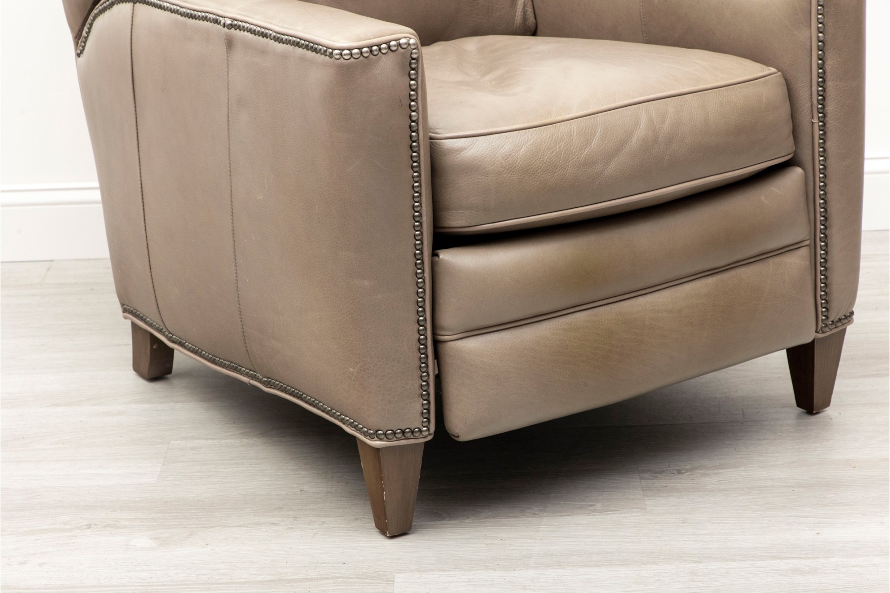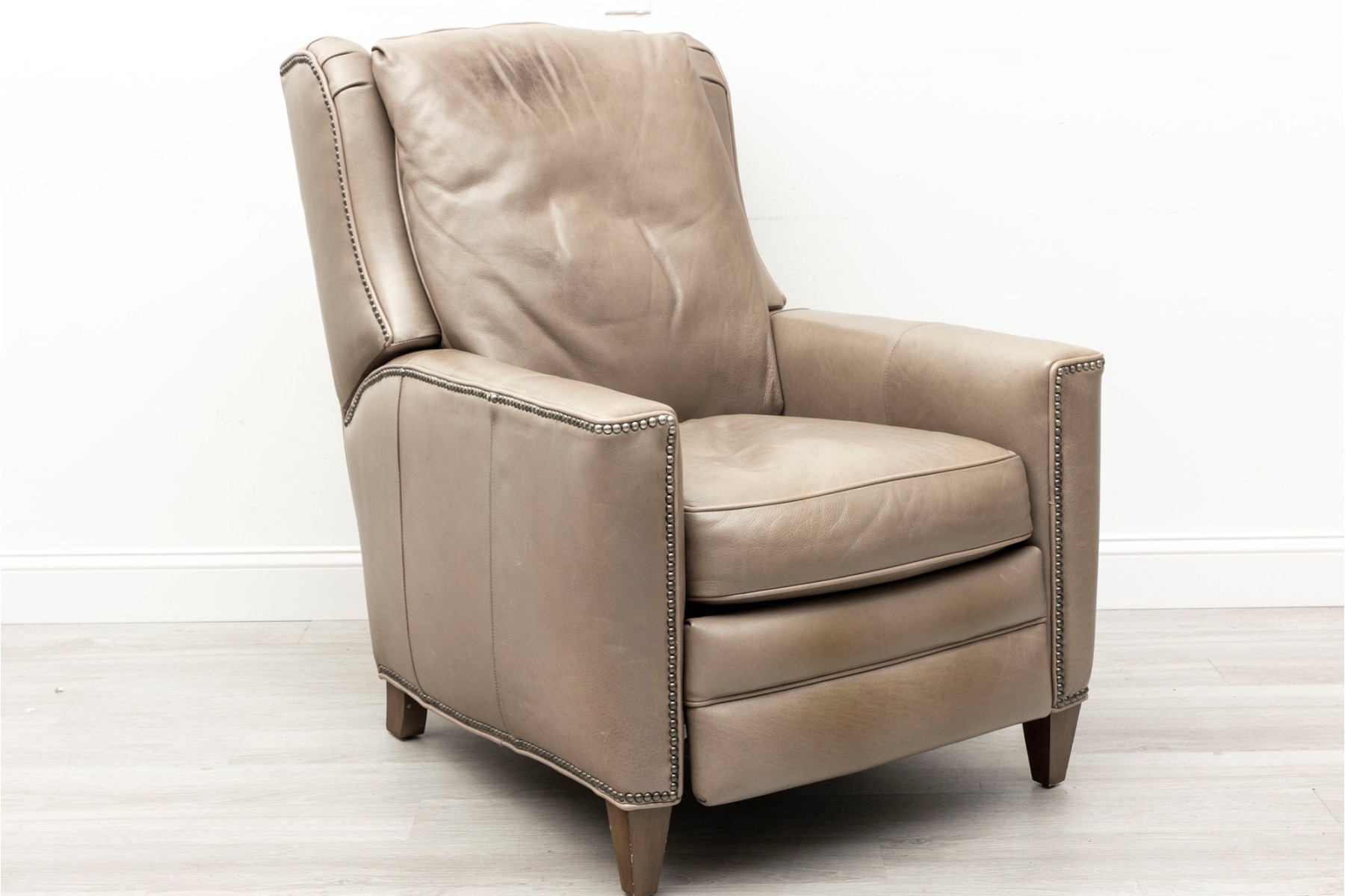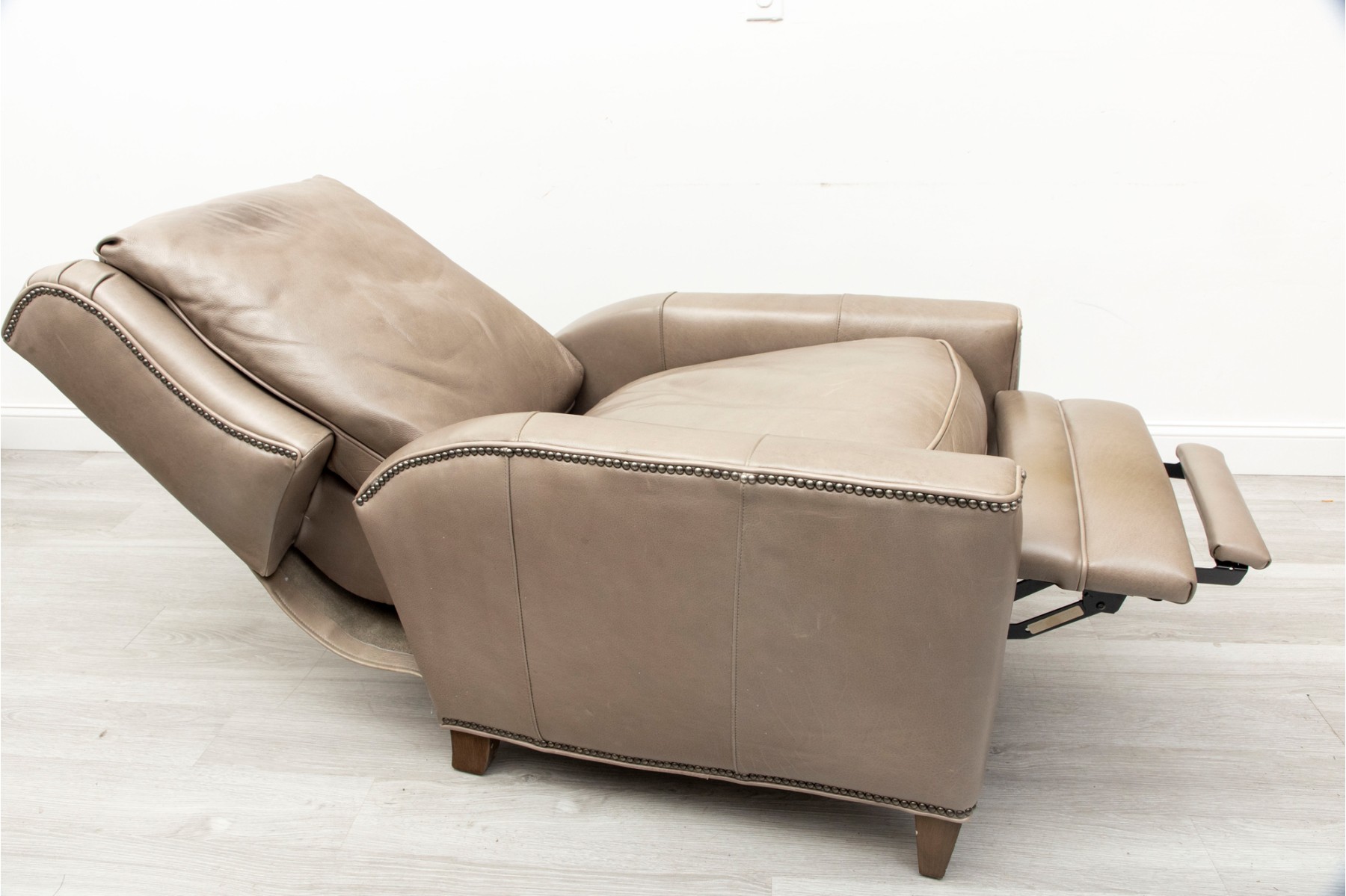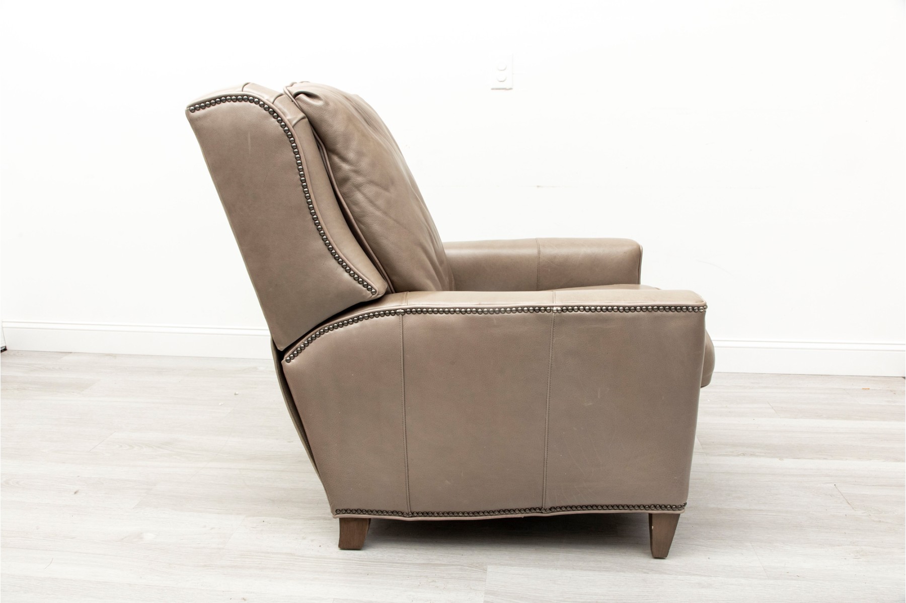 Bradington Young recliner in gray leather, displaying a classic and comfortable form with nice nailhead trims.