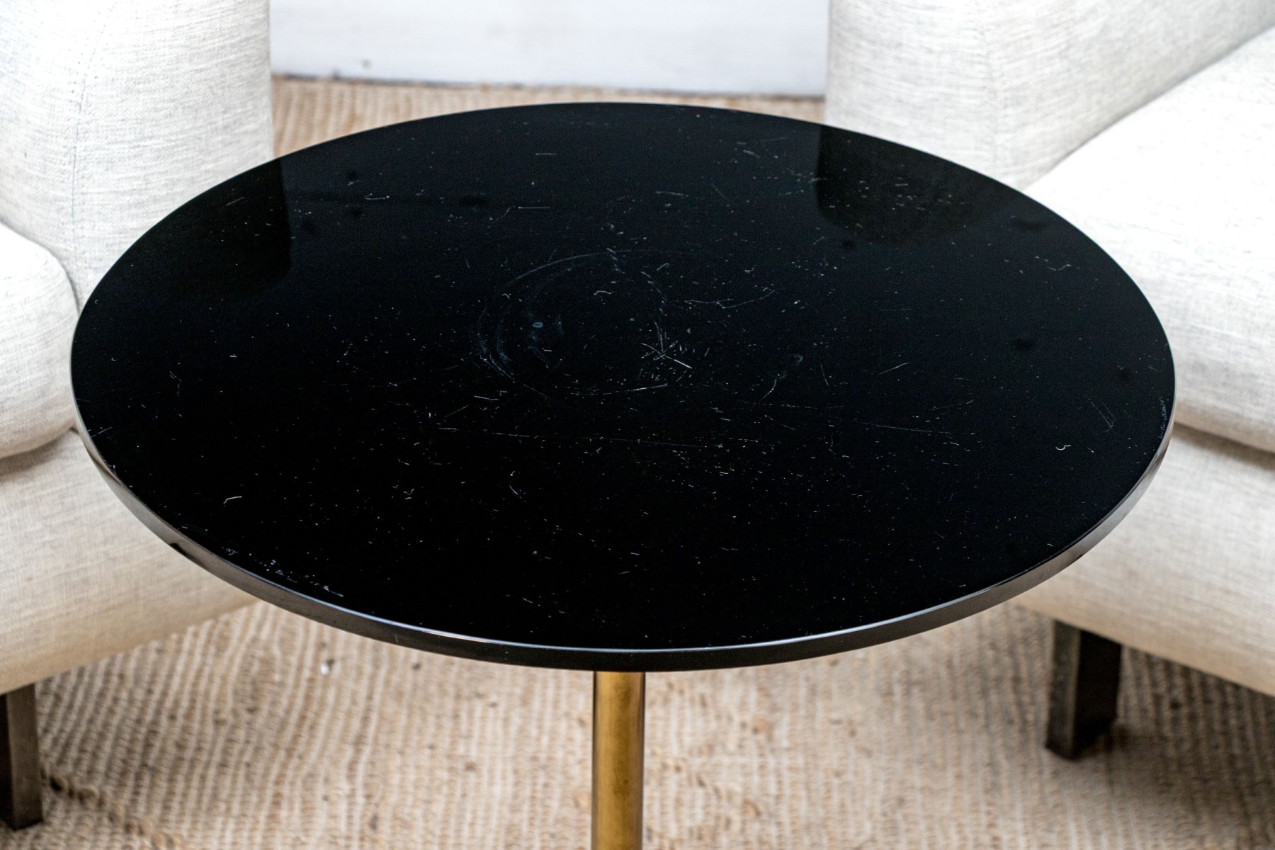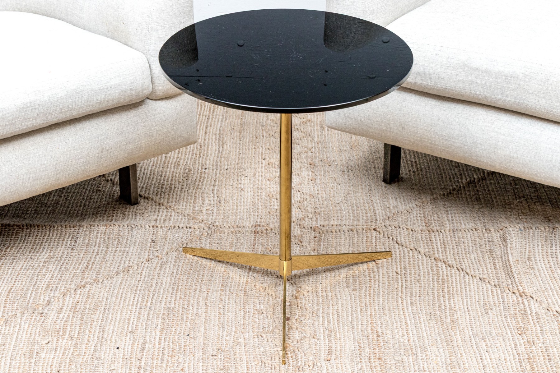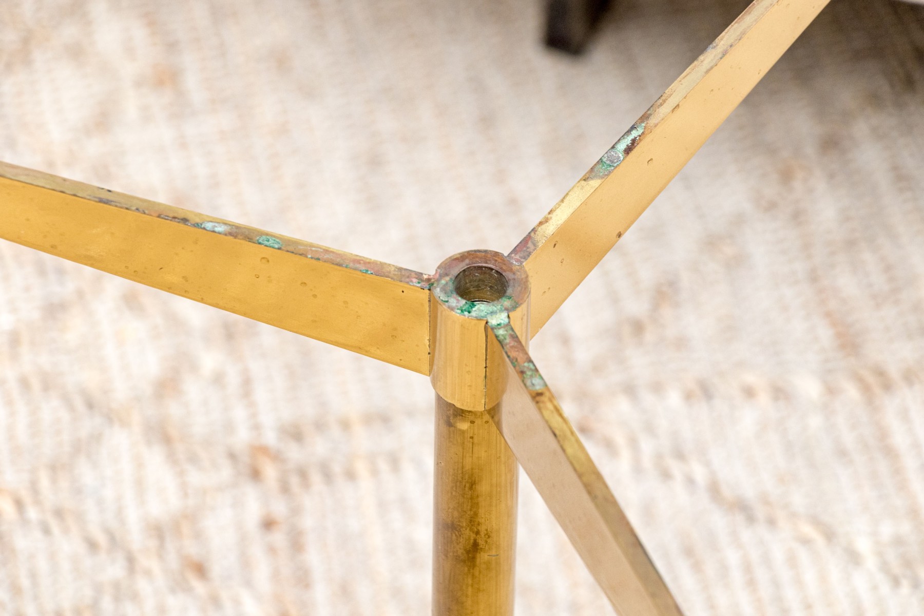 Stylish with three legs and cylindrical pedestal with black tinted glass table top which appears chic in contrast with the brass pedestal.