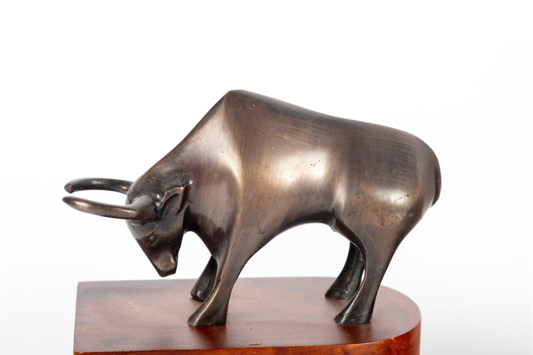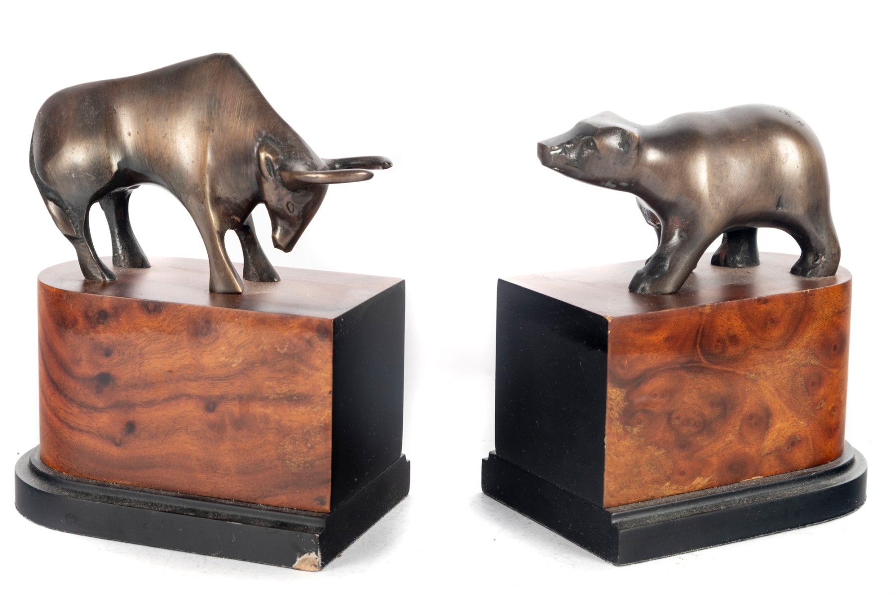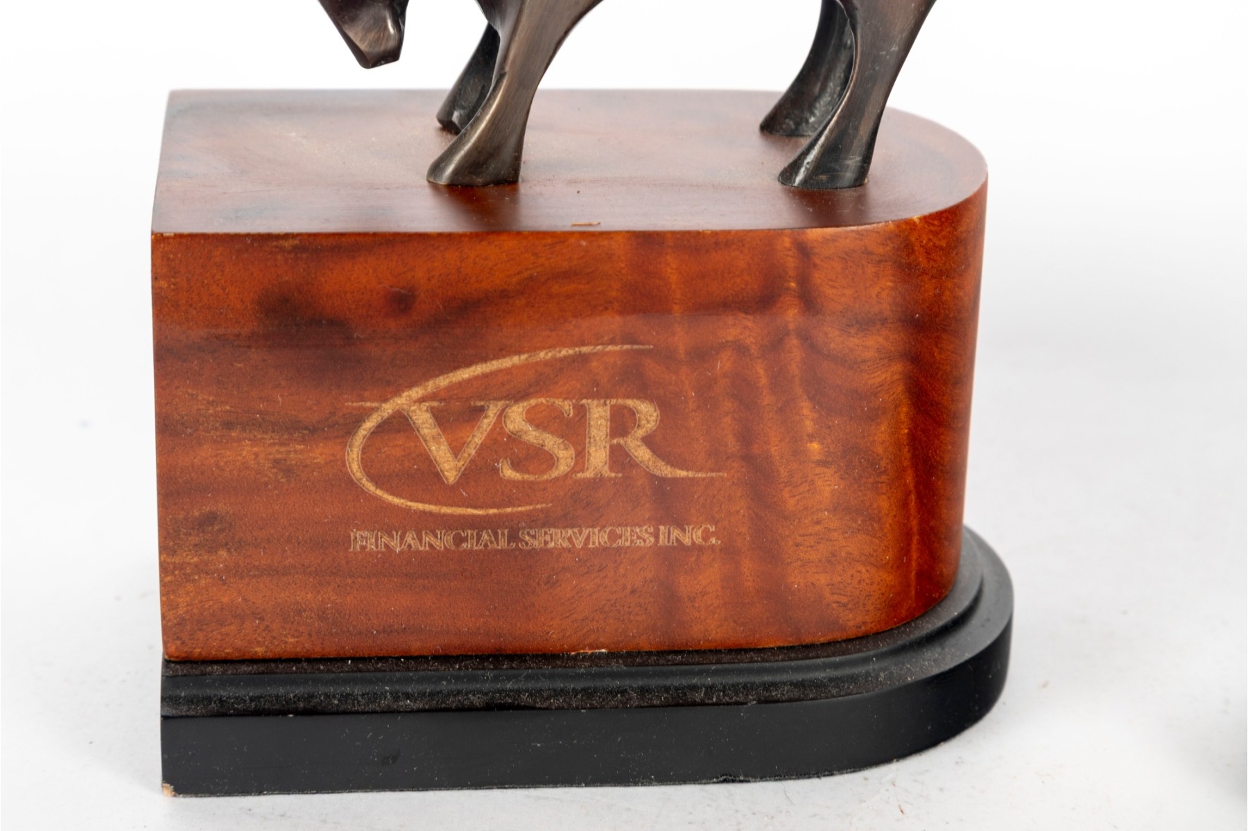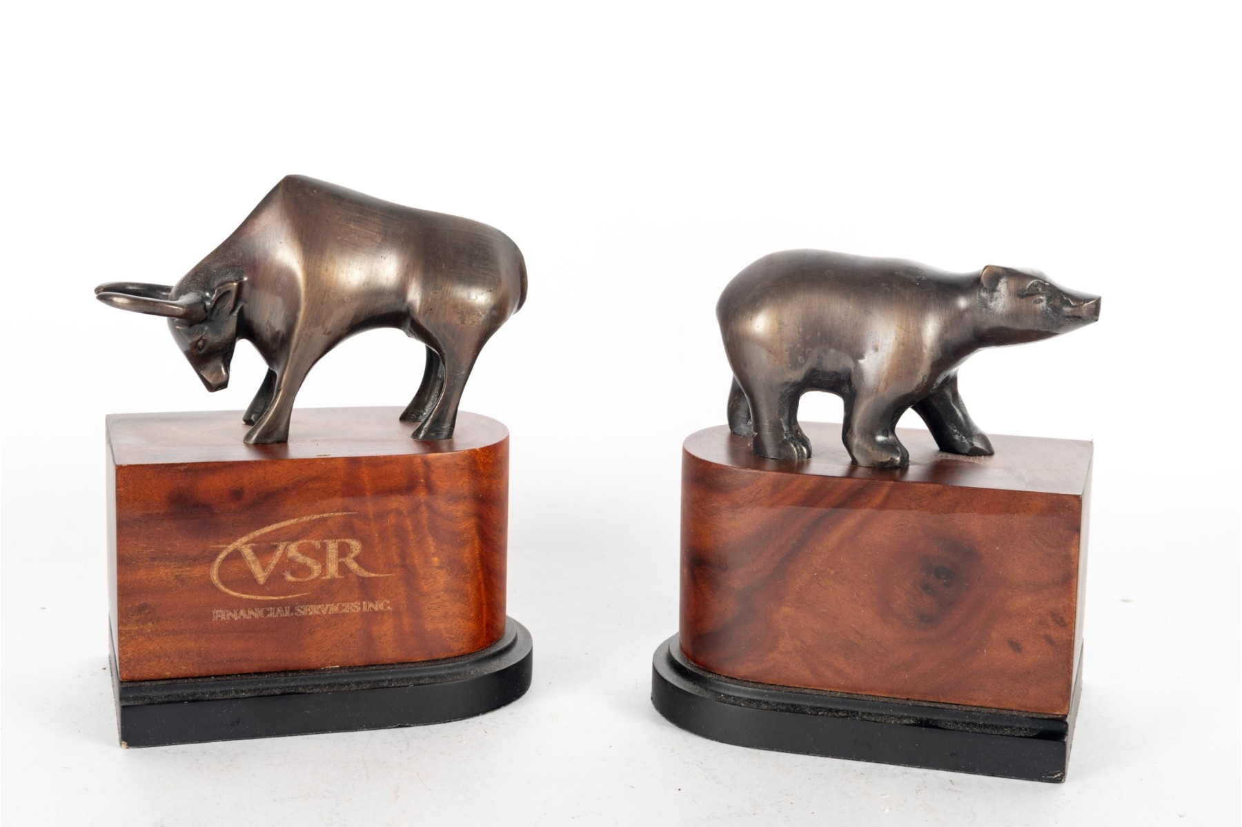 A pair of burnished brass animals (Specifically a bear and a bull perched on wooden pedestal stands personalized by "VSR Financial Services".