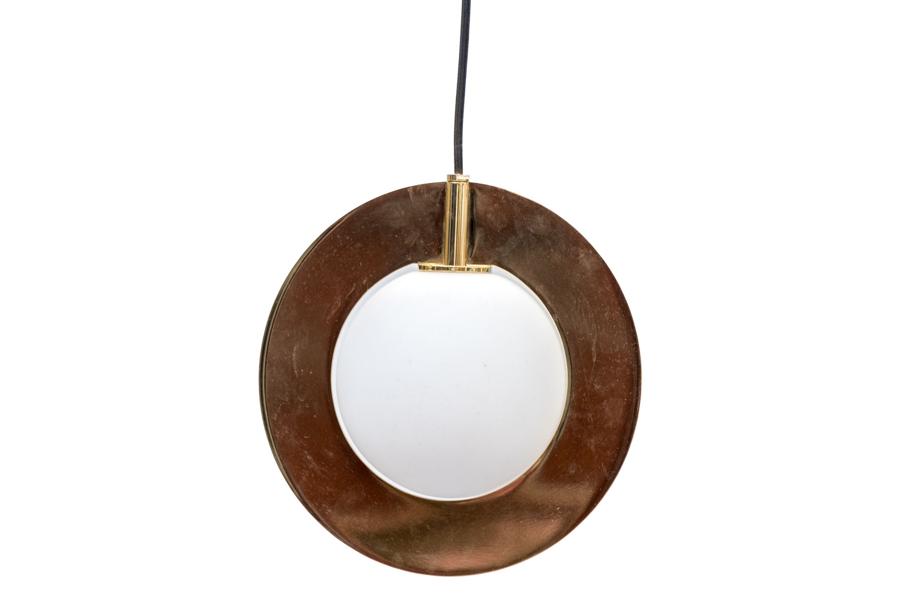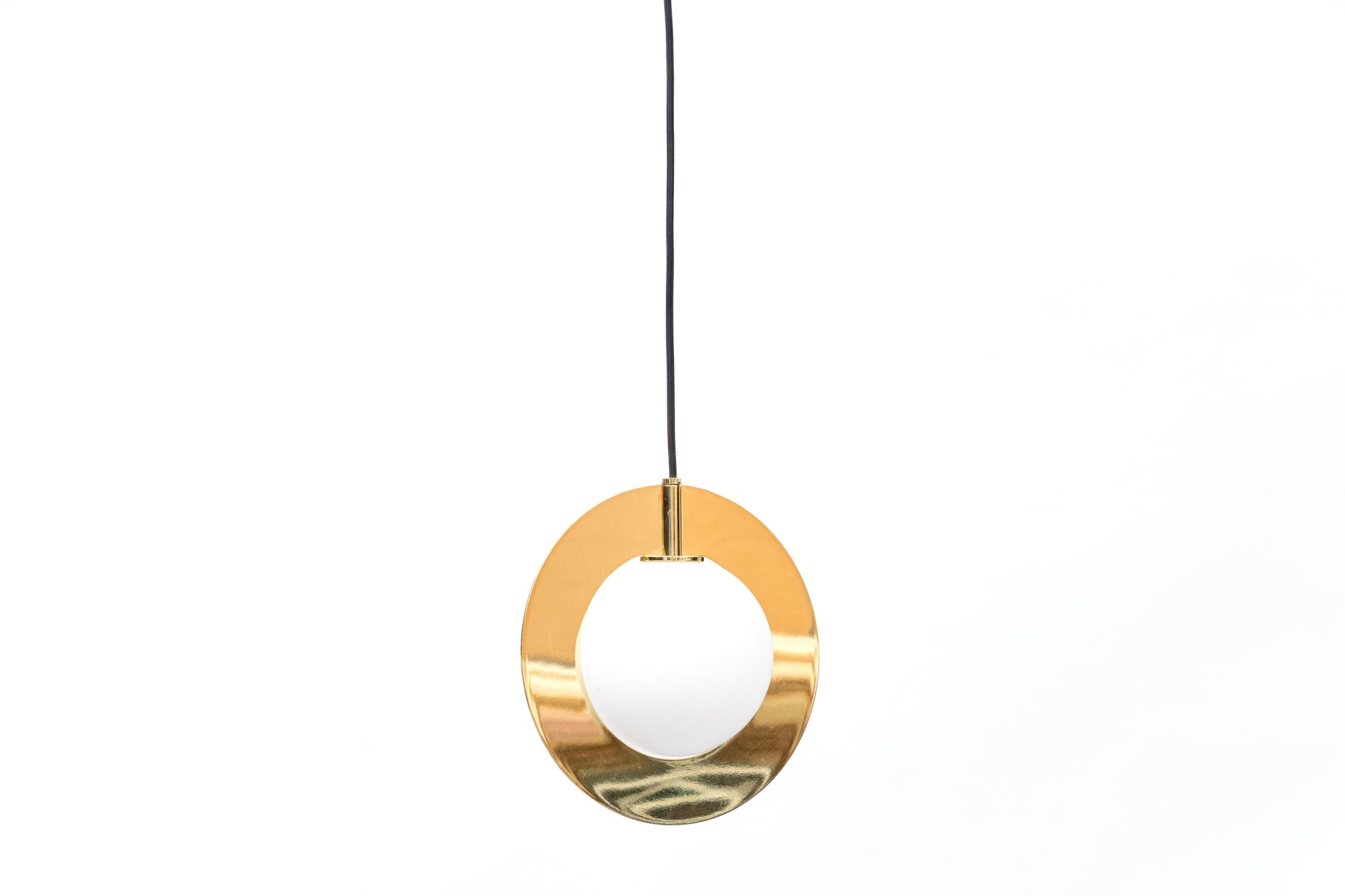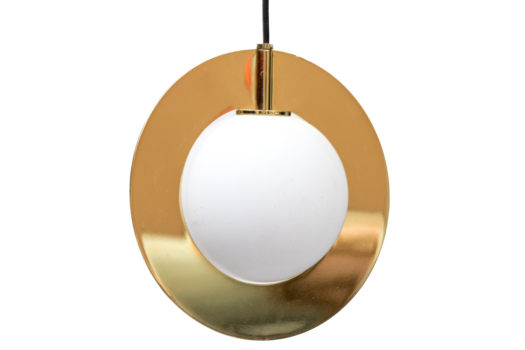 White glass shade with brass finished metallic ring like a planet with conical ceiling flush mount.