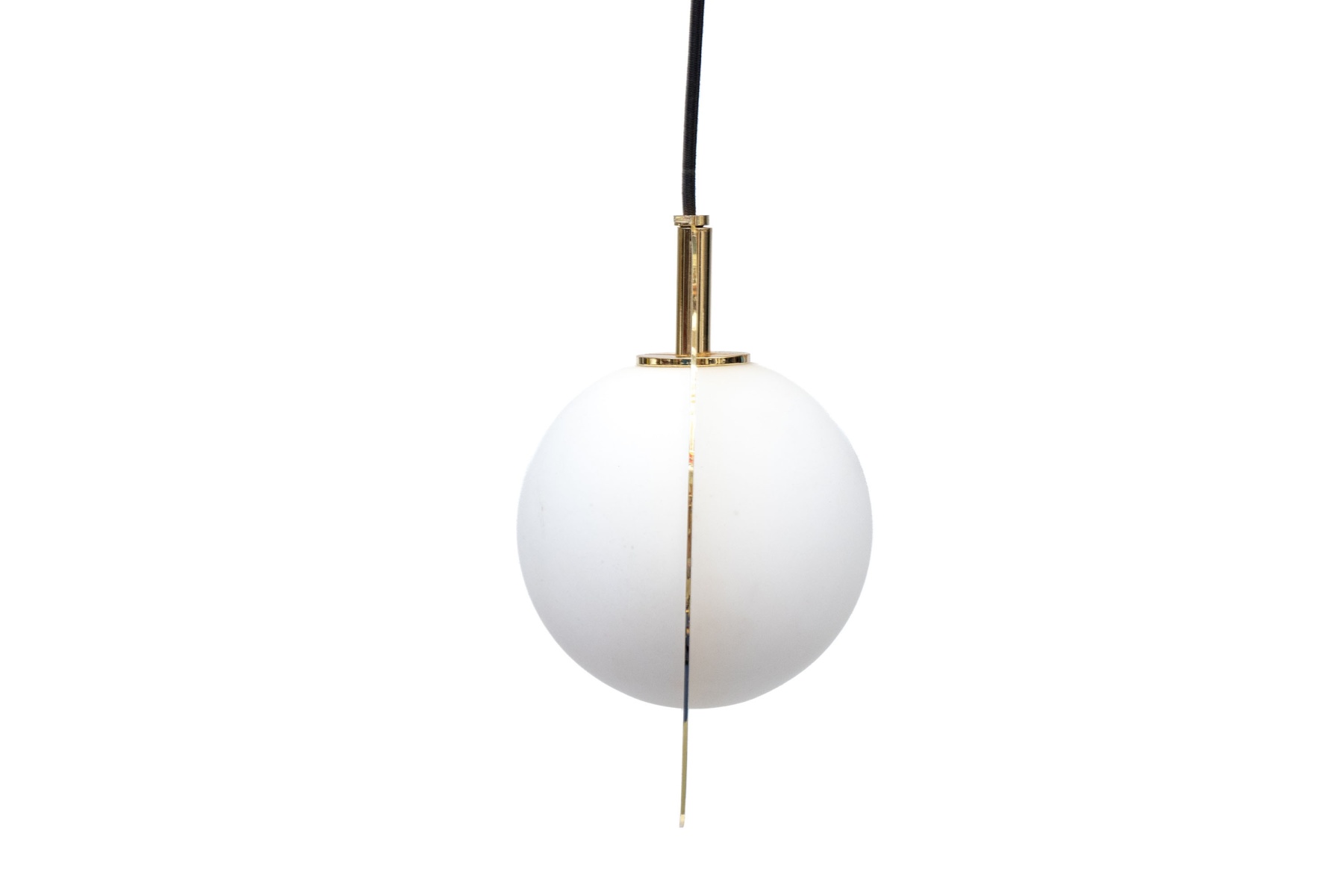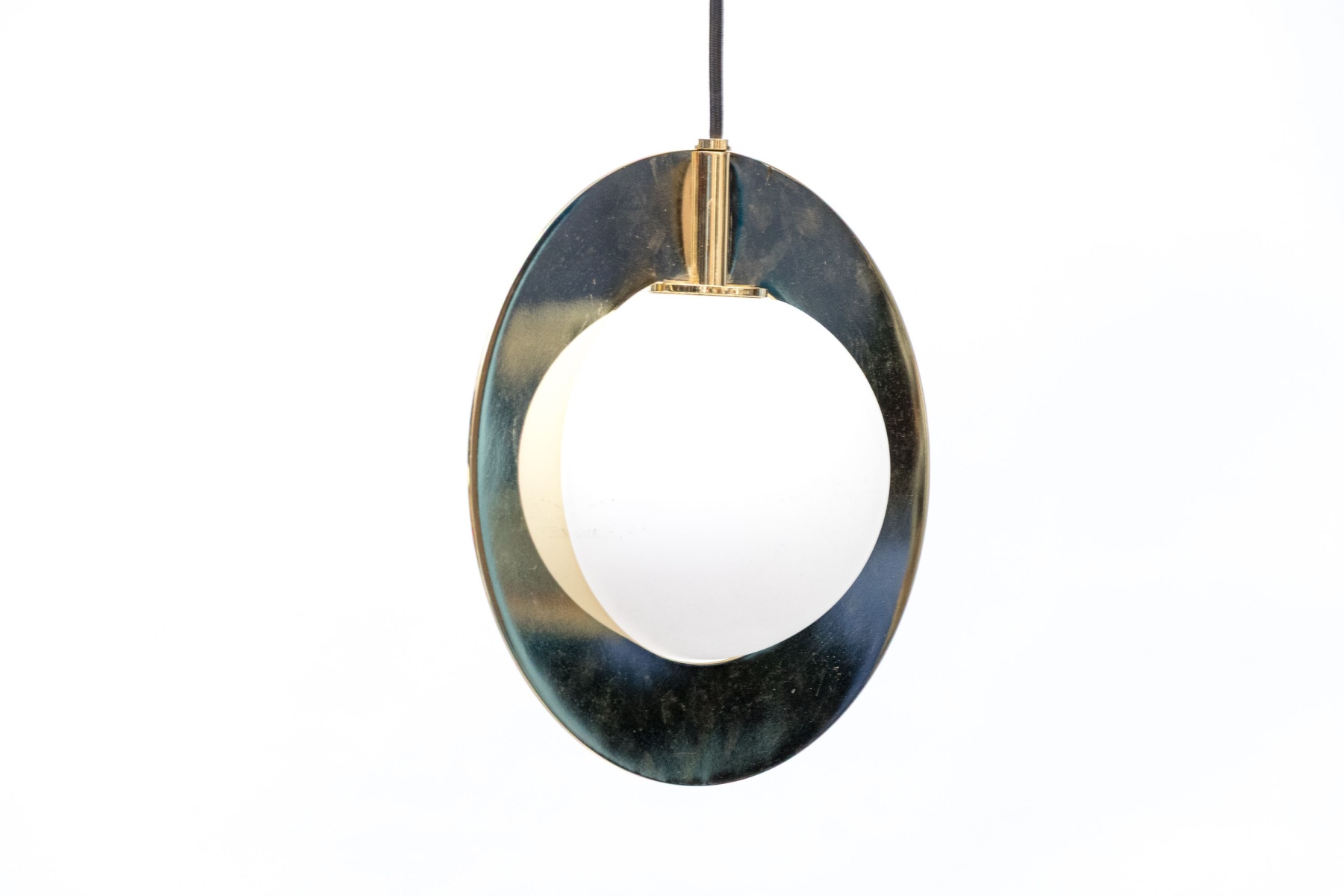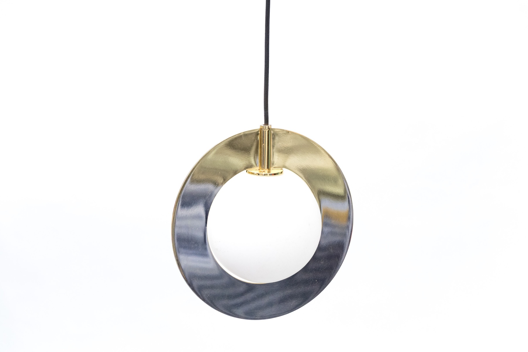 White glass shade with brass finished metallic ring like a planet with conical ceiling flush mount.