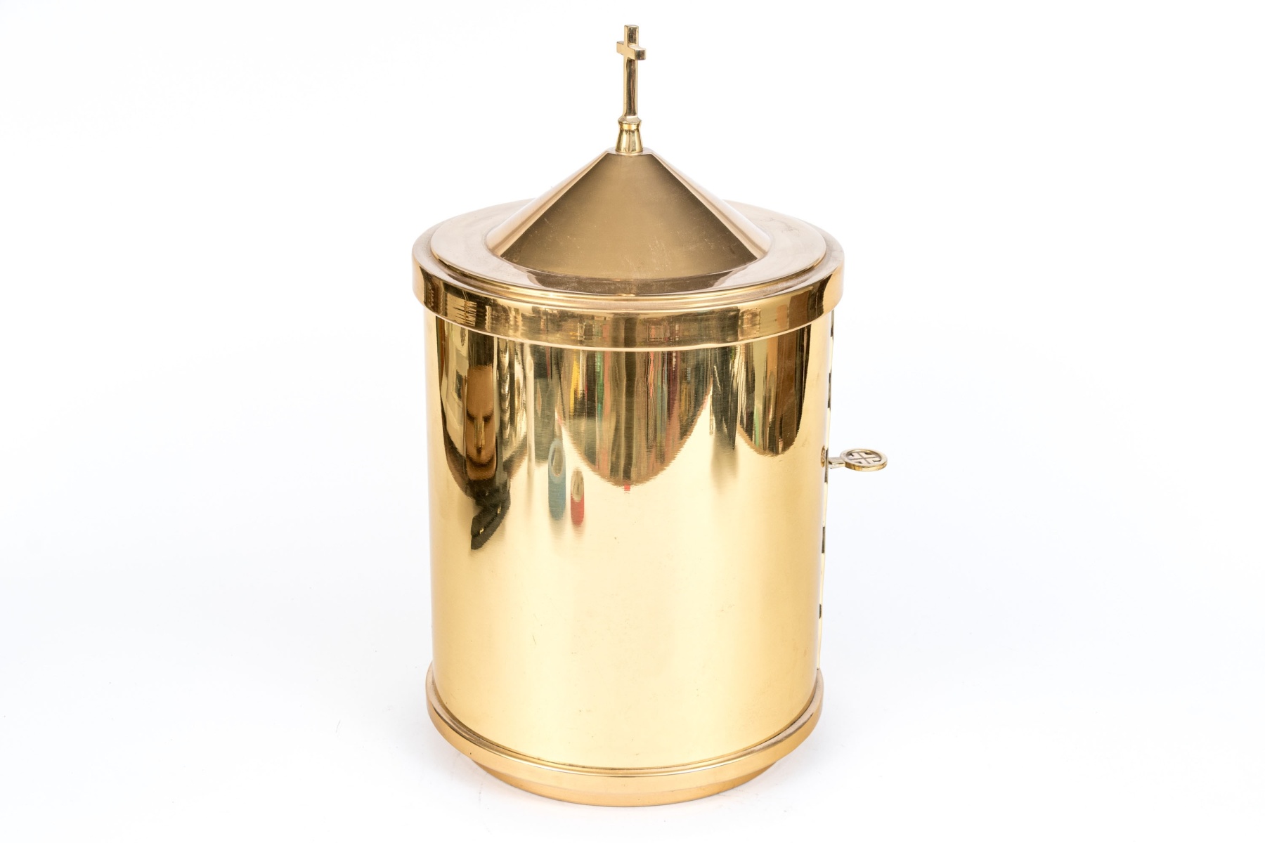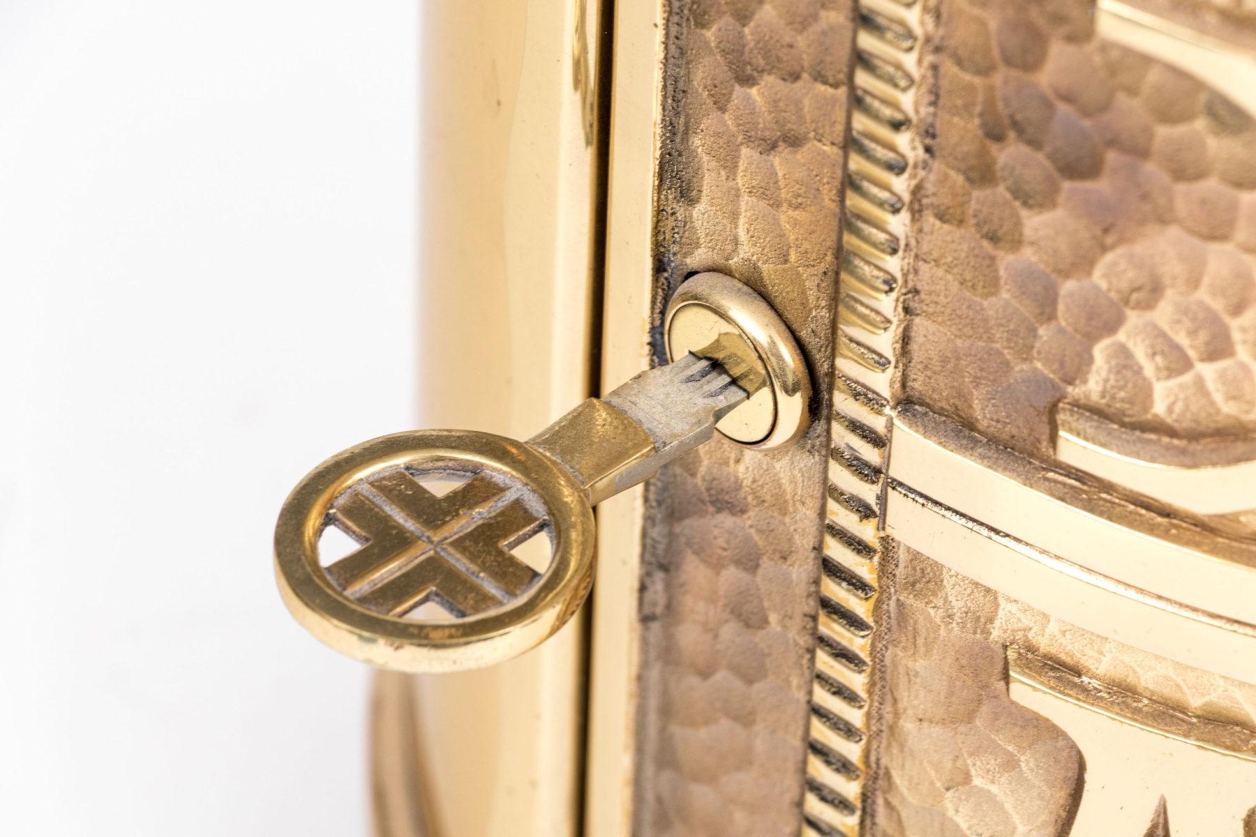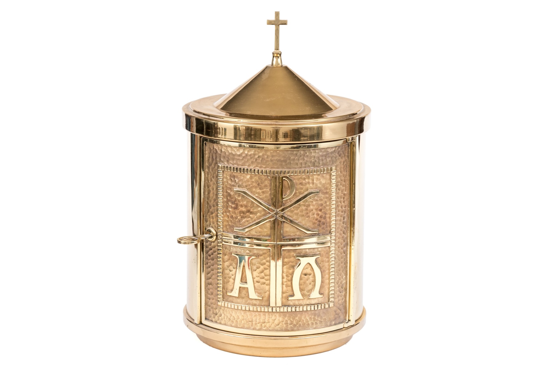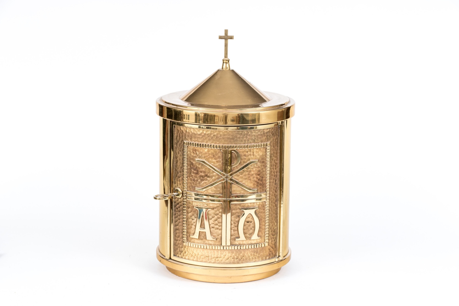 A well decorated brass Christian tabernacle showcasing a cross finial over a circular pyramidal roof over a cylindrical case with a hammered door. The door features a chi-rho, alpha, and omega symbols and opens with a key to a nicely lined interior.