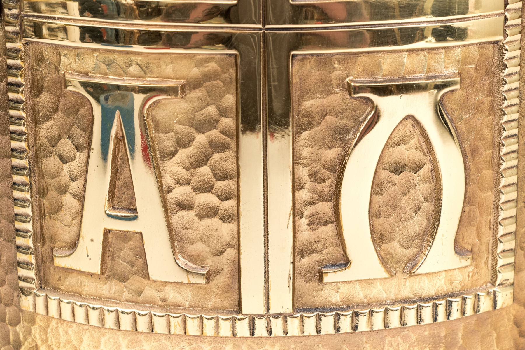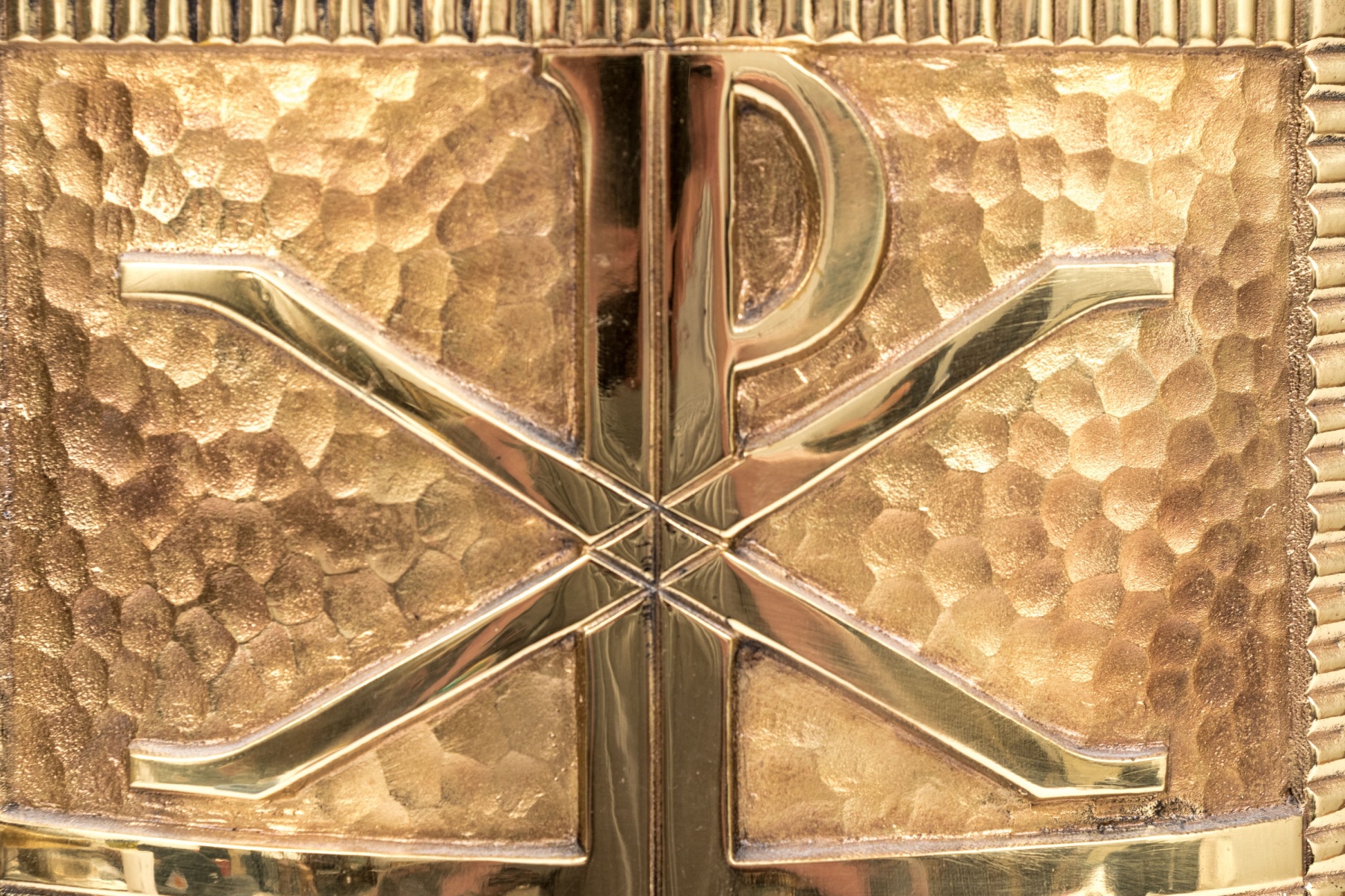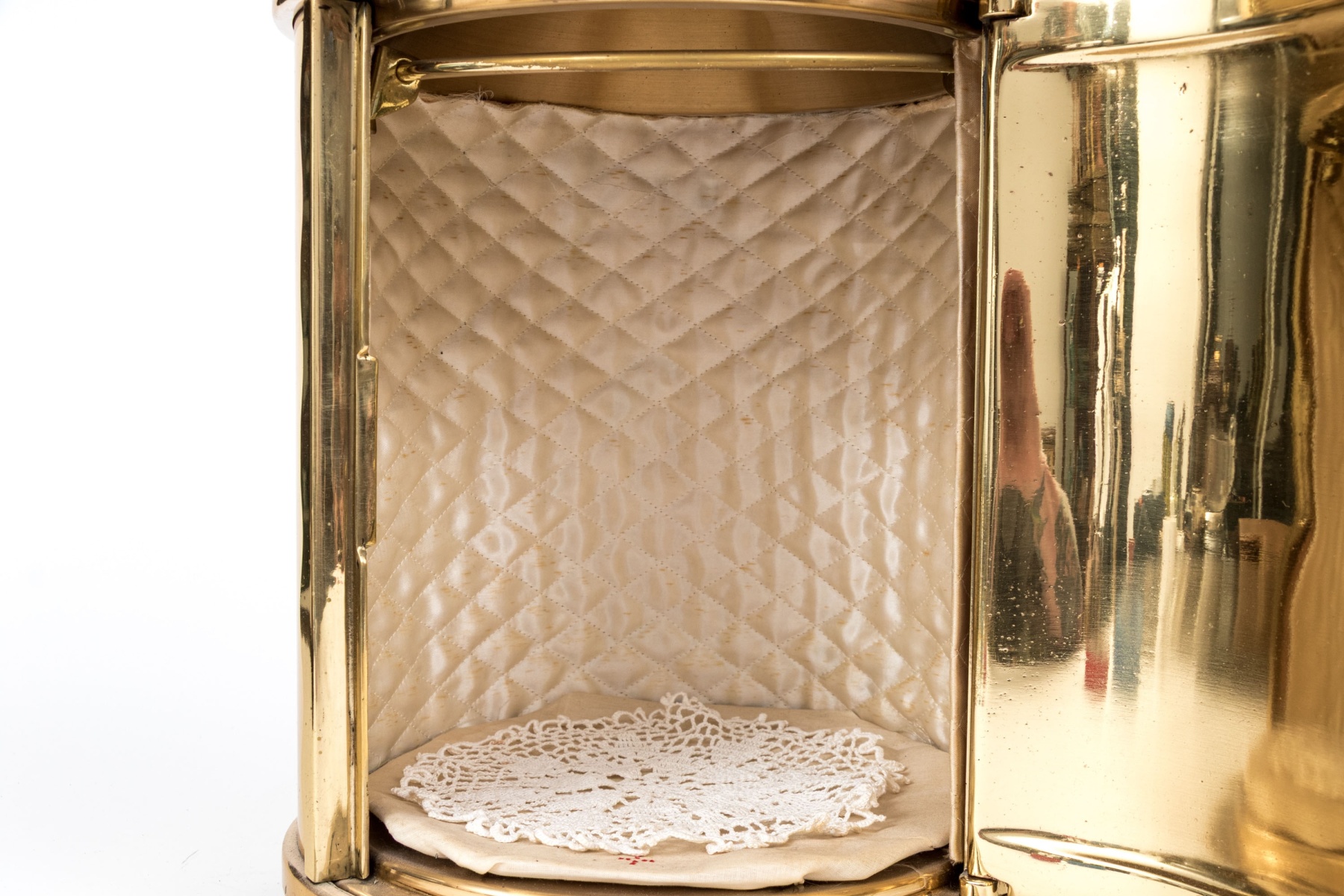 A well decorated brass Christian tabernacle showcasing a cross finial over a circular pyramidal roof over a cylindrical case with a hammered door. The door features a chi-rho, alpha, and omega symbols and opens with a key to a nicely lined interior.