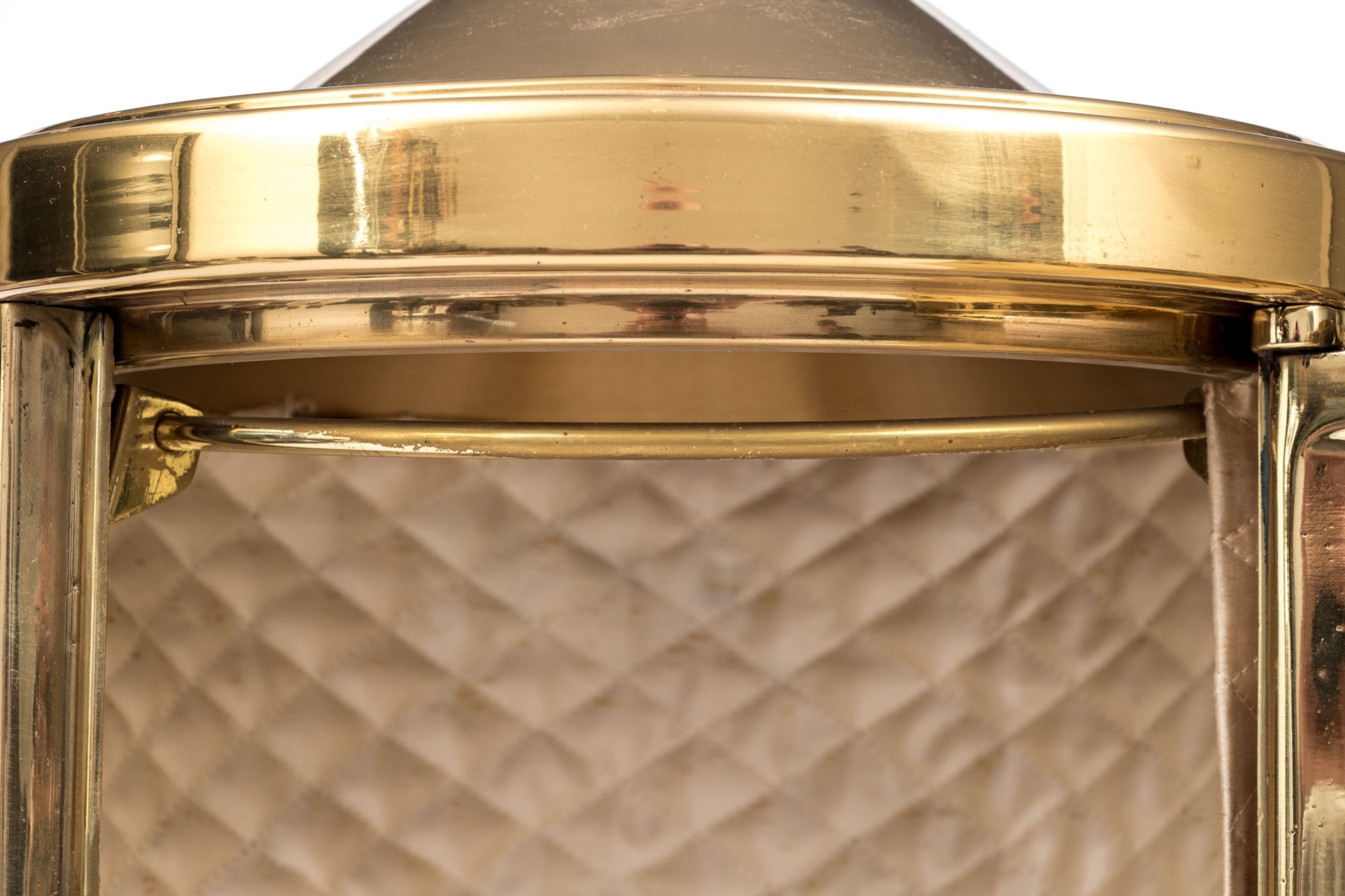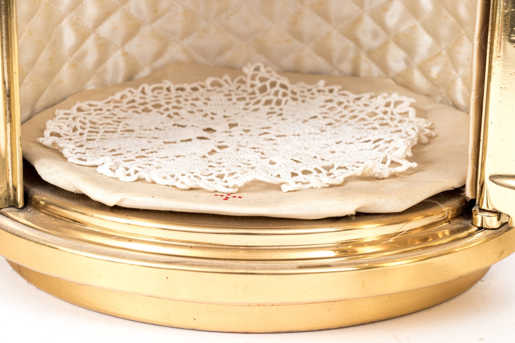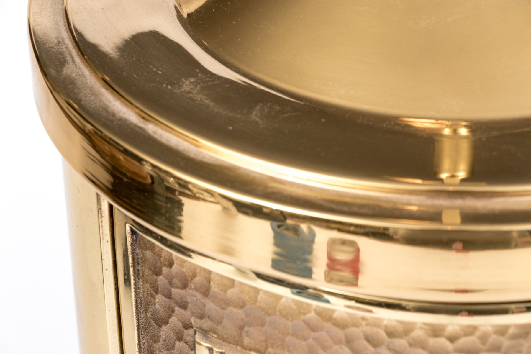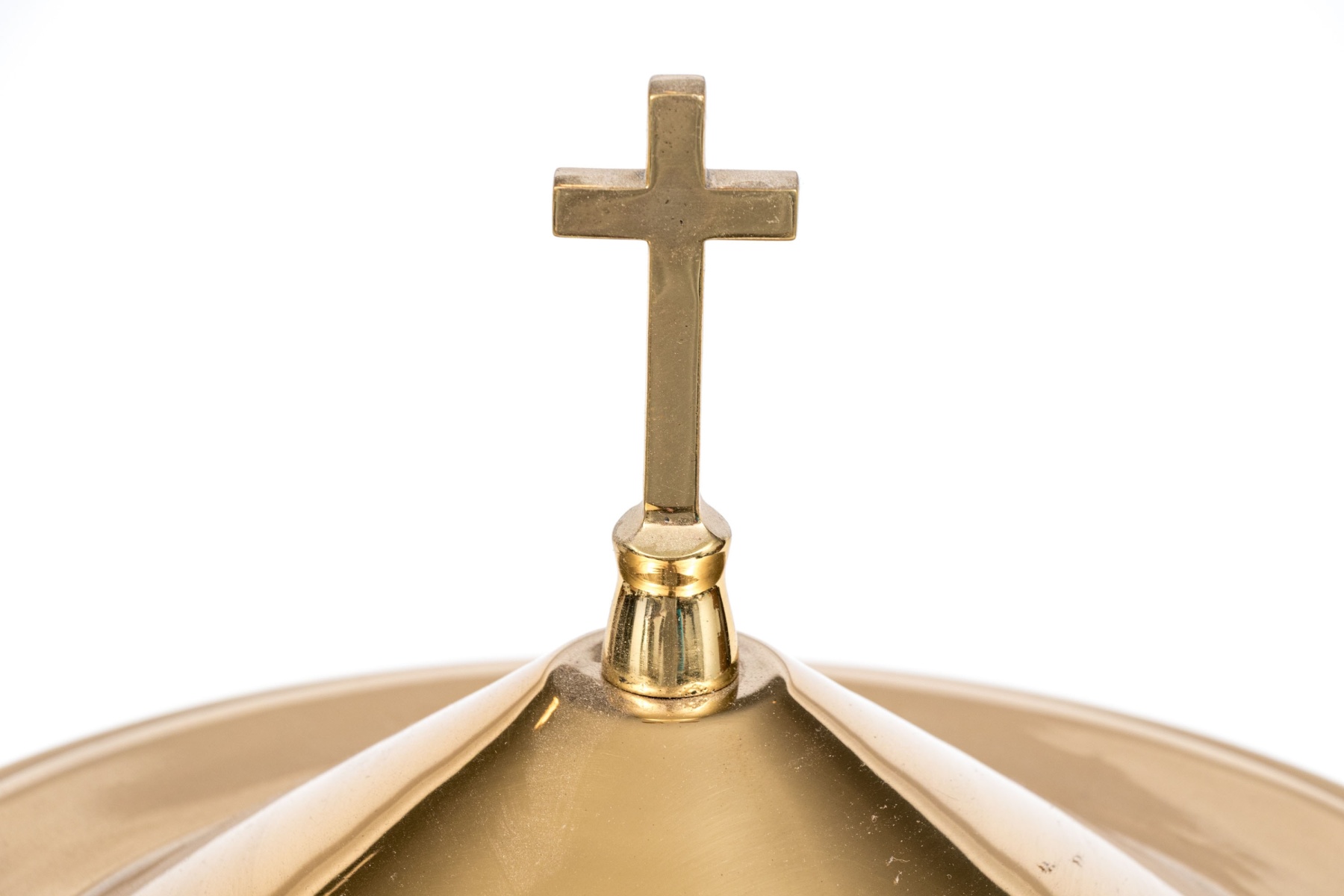 A well decorated brass Christian tabernacle showcasing a cross finial over a circular pyramidal roof over a cylindrical case with a hammered door. The door features a chi-rho, alpha, and omega symbols and opens with a key to a nicely lined interior.