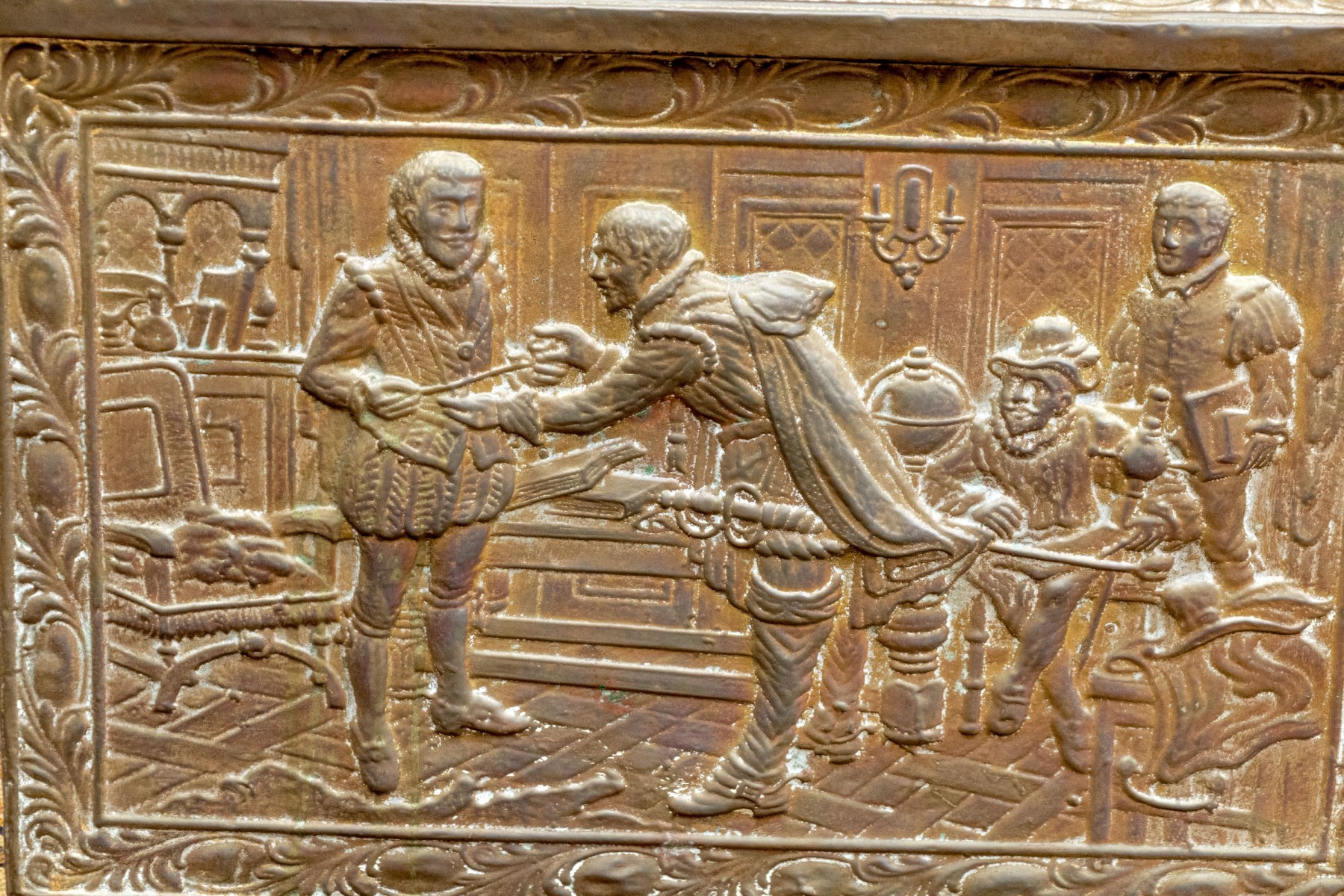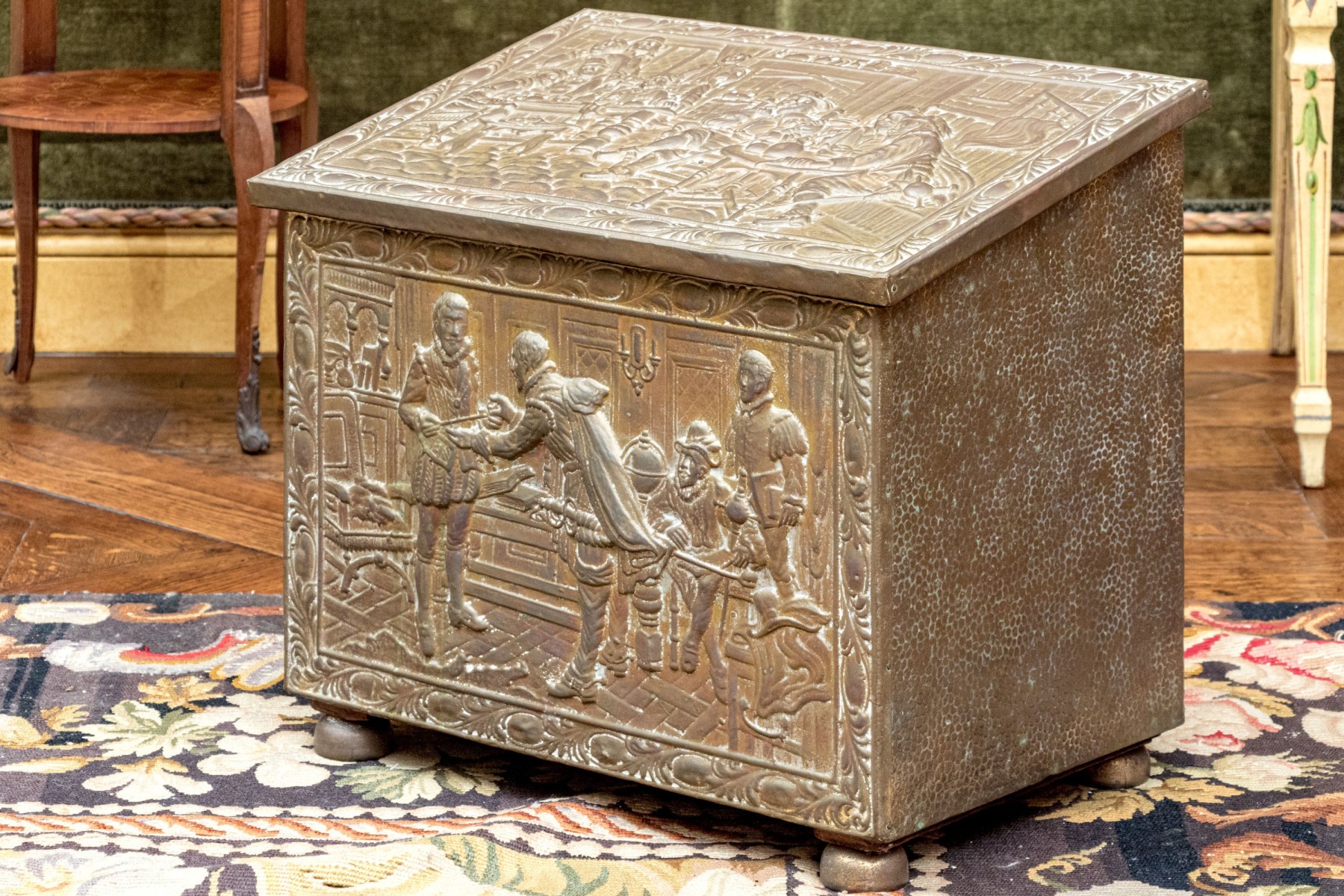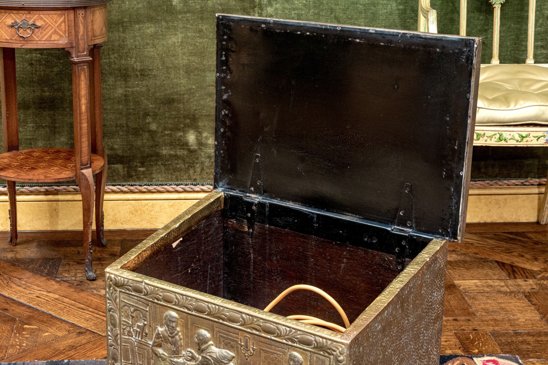 A fabulous brass coal or log box, likely English or Dutch. The box features a hinged slanted lid over a rectangular body on bun feet, decorated with figural repousse scenes on the lid and body front with pebbled textures across the sides. Wood lined on the interior.