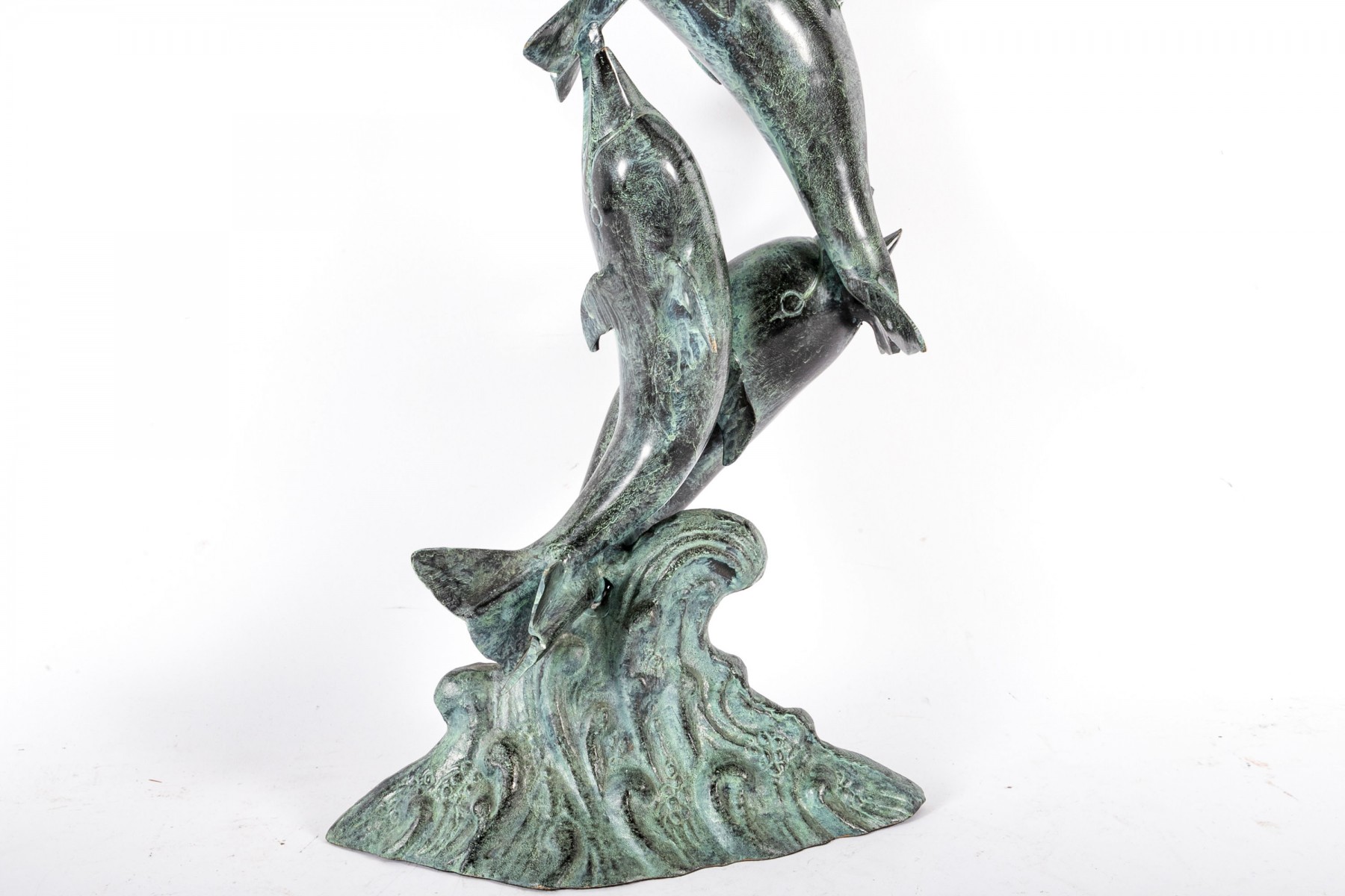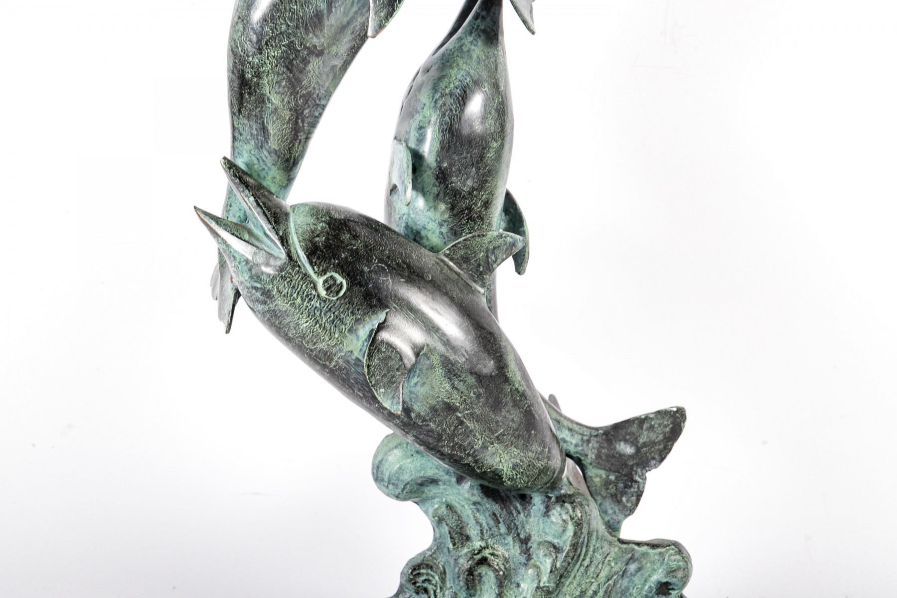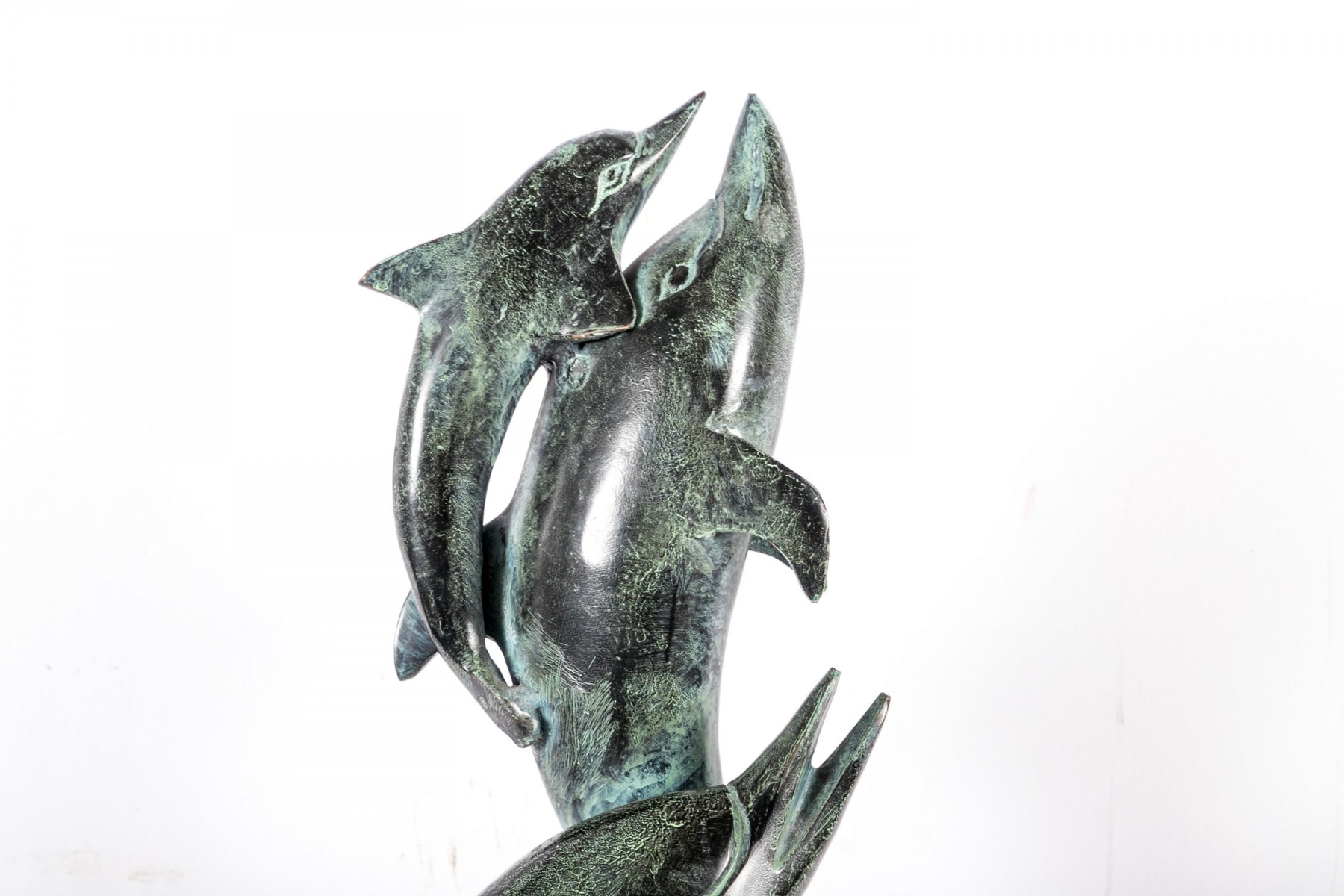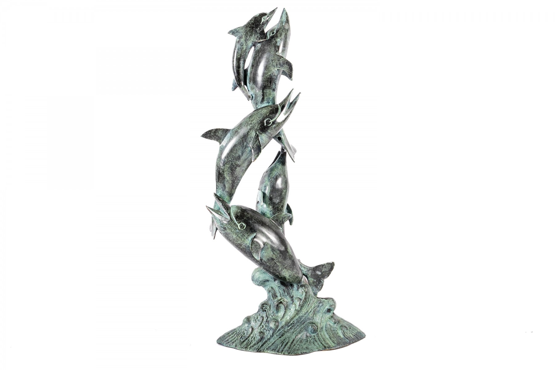 A fun brass sculpture of a pod of dolphins swimming in an upwards dance from a marquise base of scrolling waves. Finished in black and sea foam green.