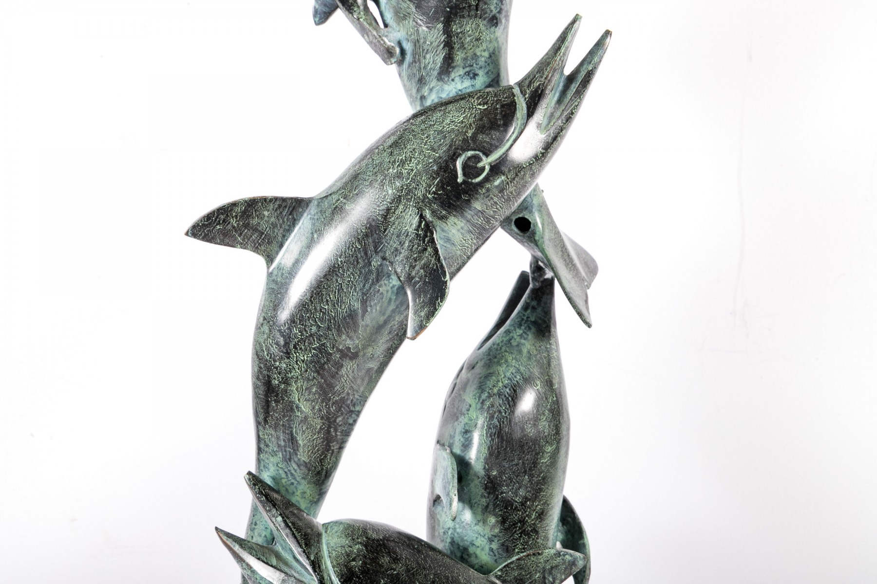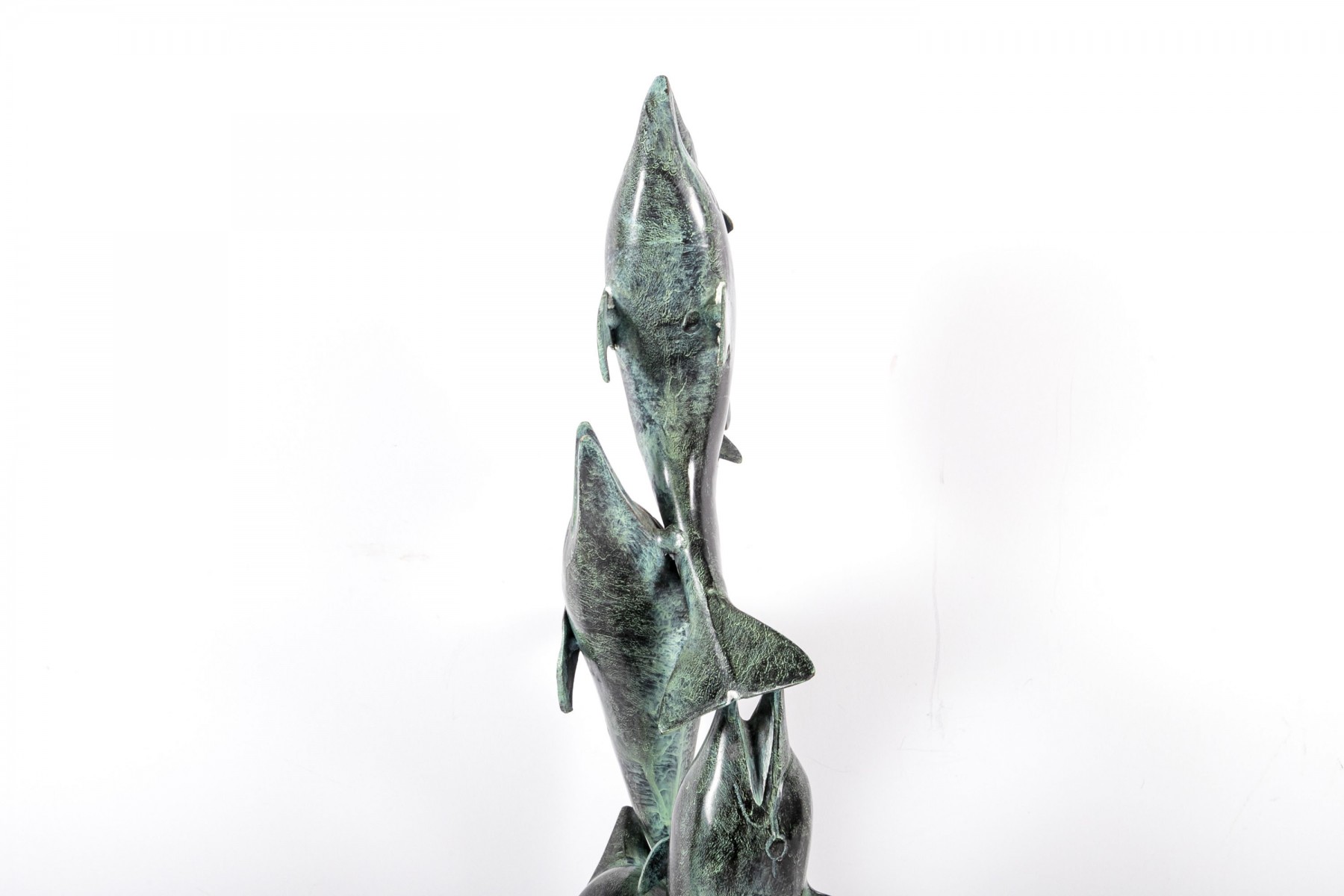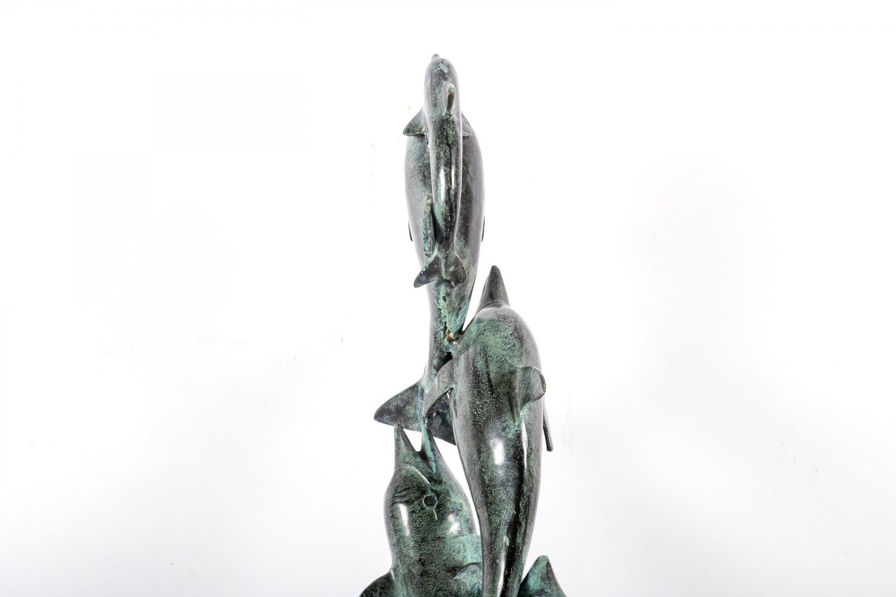 A fun brass sculpture of a pod of dolphins swimming in an upwards dance from a marquise base of scrolling waves. Finished in black and sea foam green.