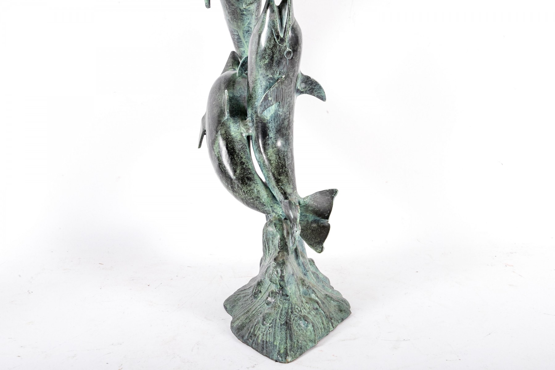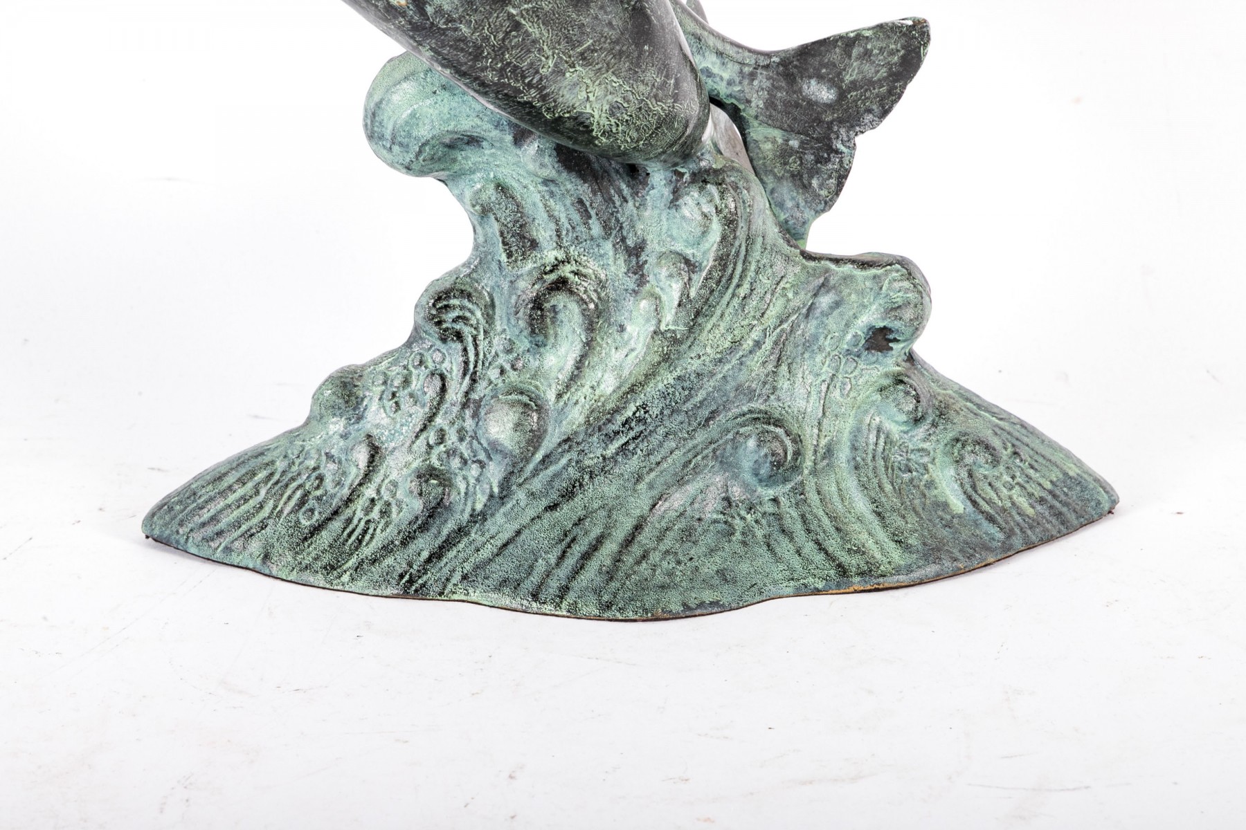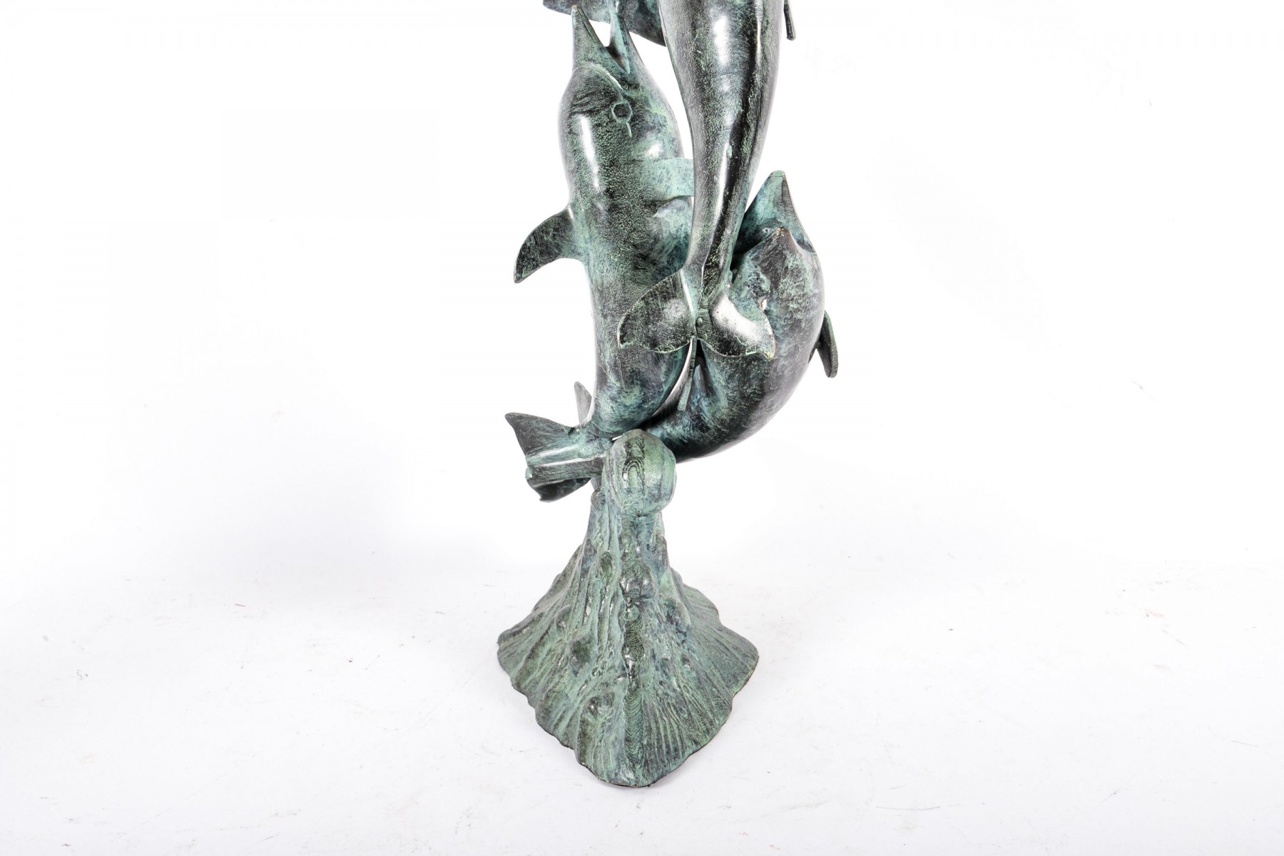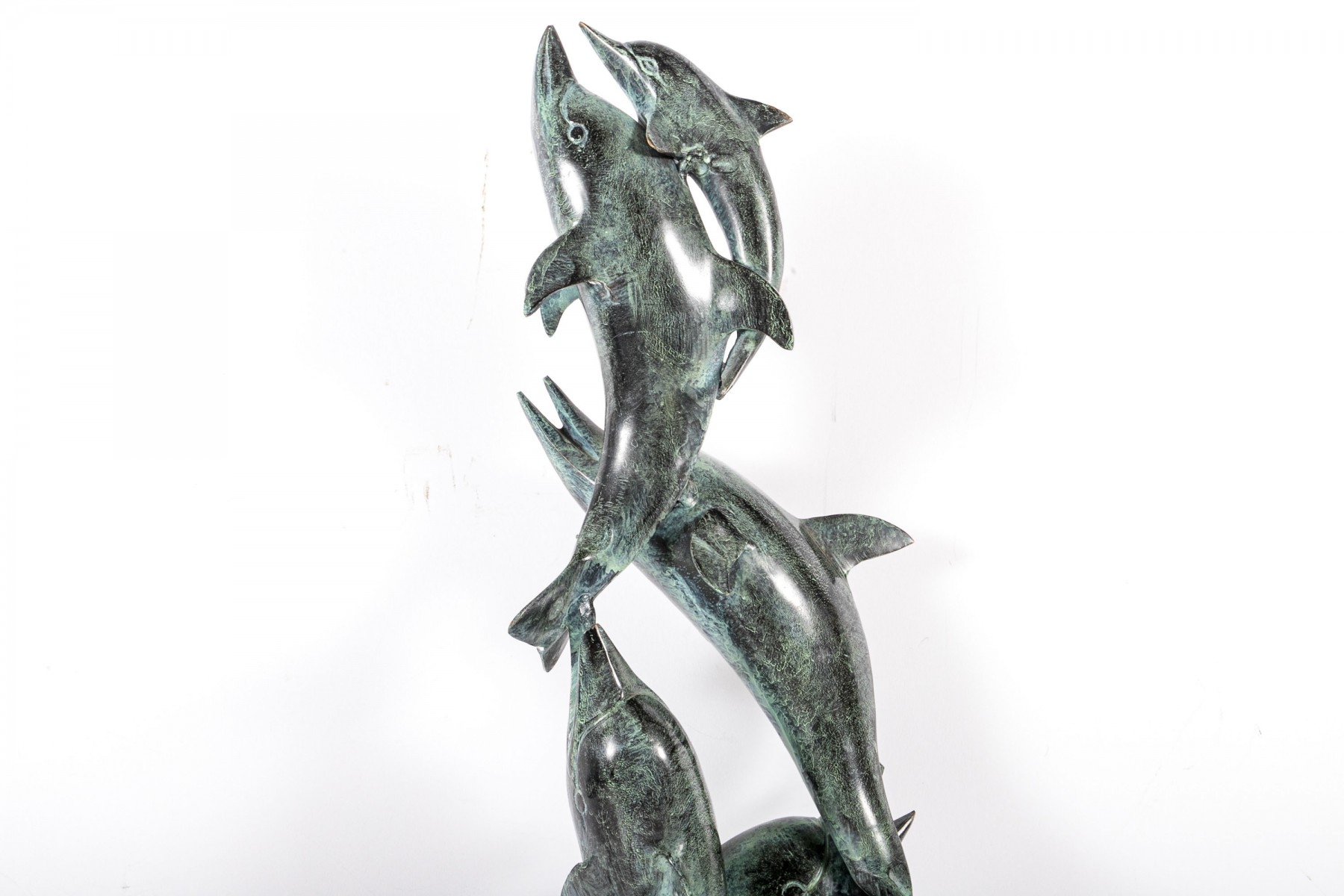 A fun brass sculpture of a pod of dolphins swimming in an upwards dance from a marquise base of scrolling waves. Finished in black and sea foam green.