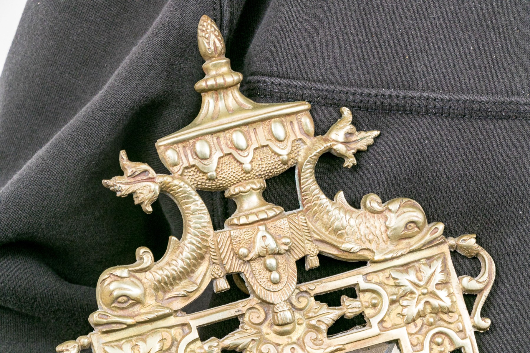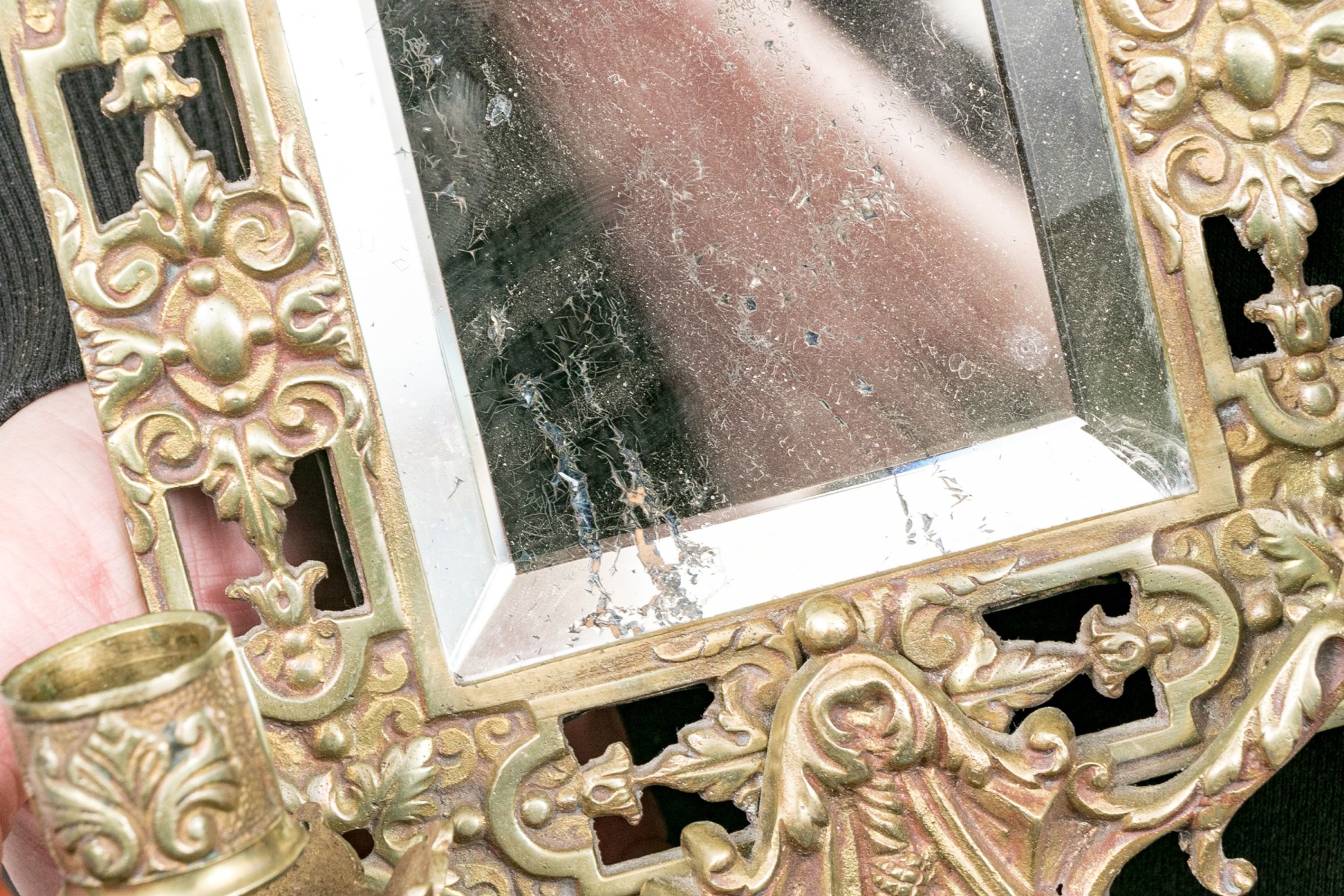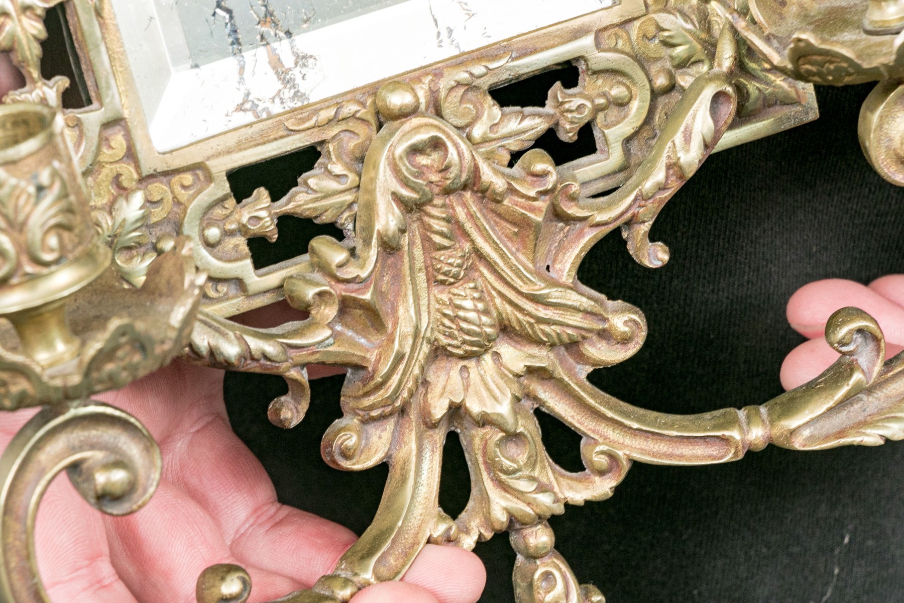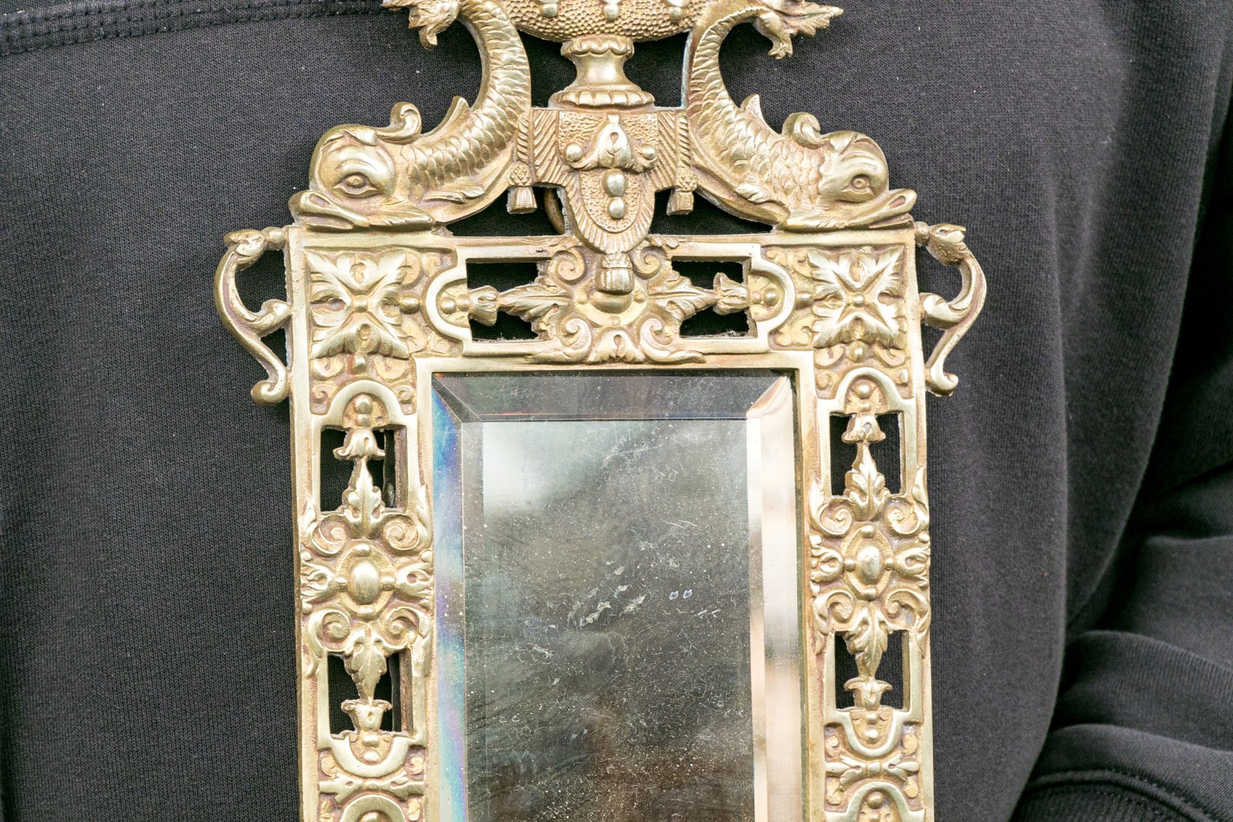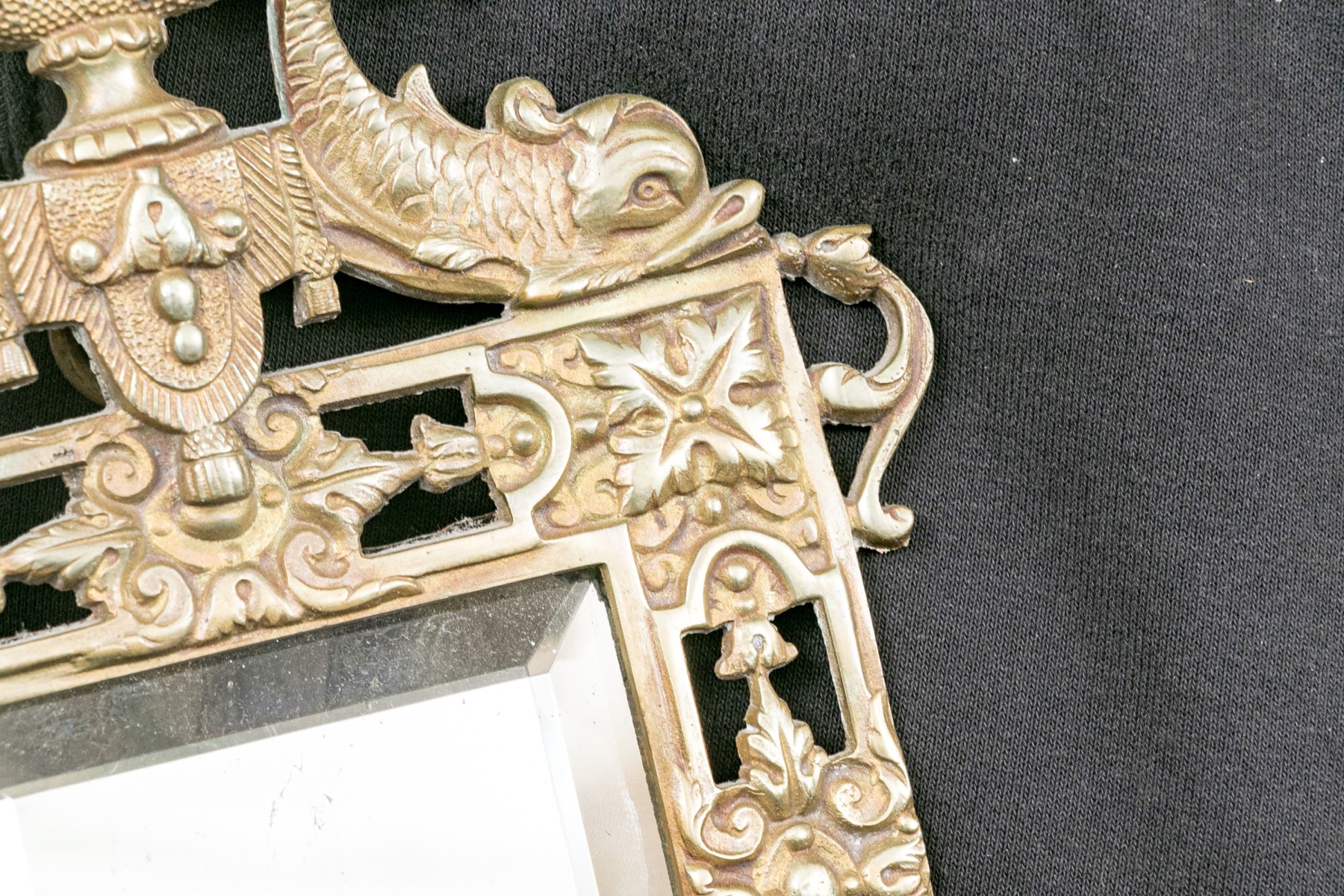 Decorated with vaseform finial with twin fish and an openwork brass border around the beveled edge mirror/