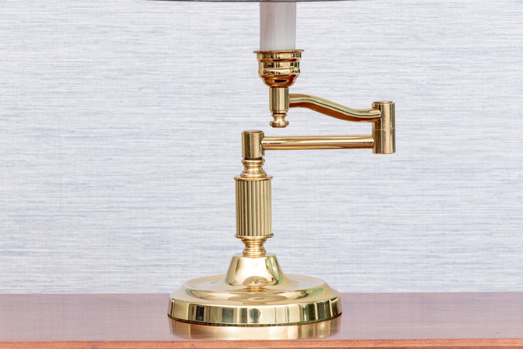 A brass plated student desk lamp with single light having a paper clip on shade. The lamp is designed with a swing arm, reeded standard, and a round base.