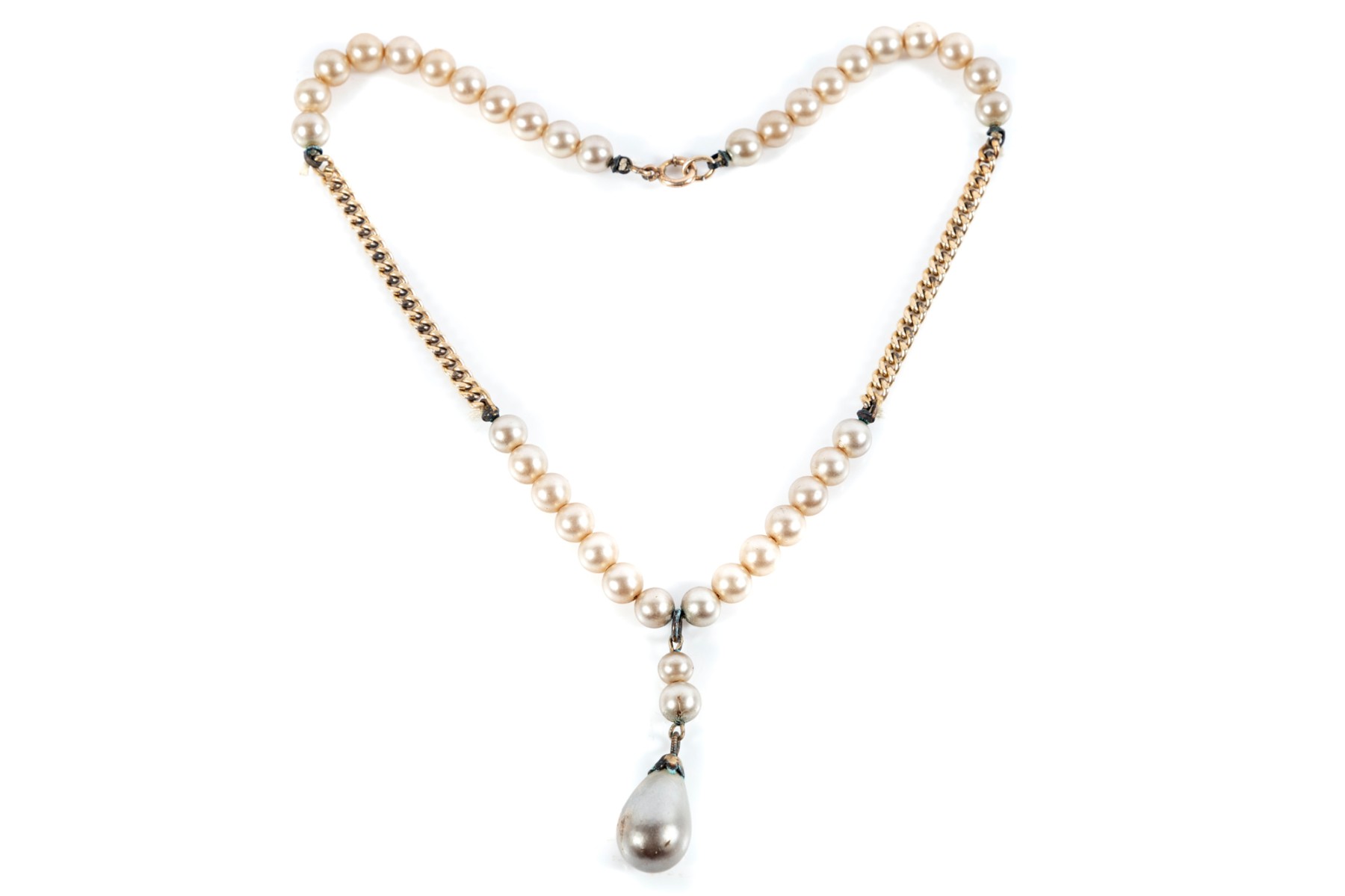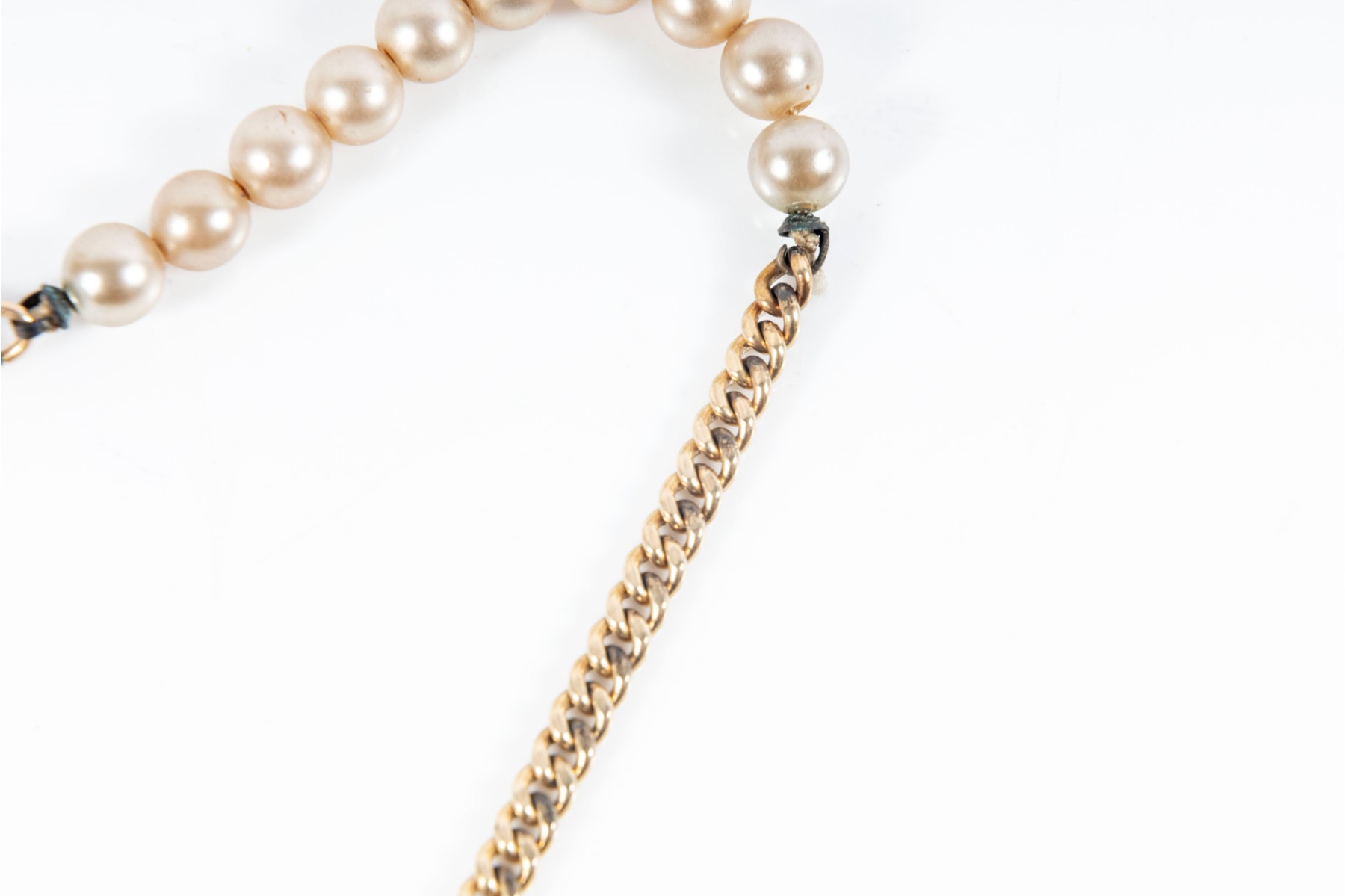 A small and elegant pearl necklace focusing a larger teardrop pearl and interconnected by brass plated metal chains for a lovely ensemble.
