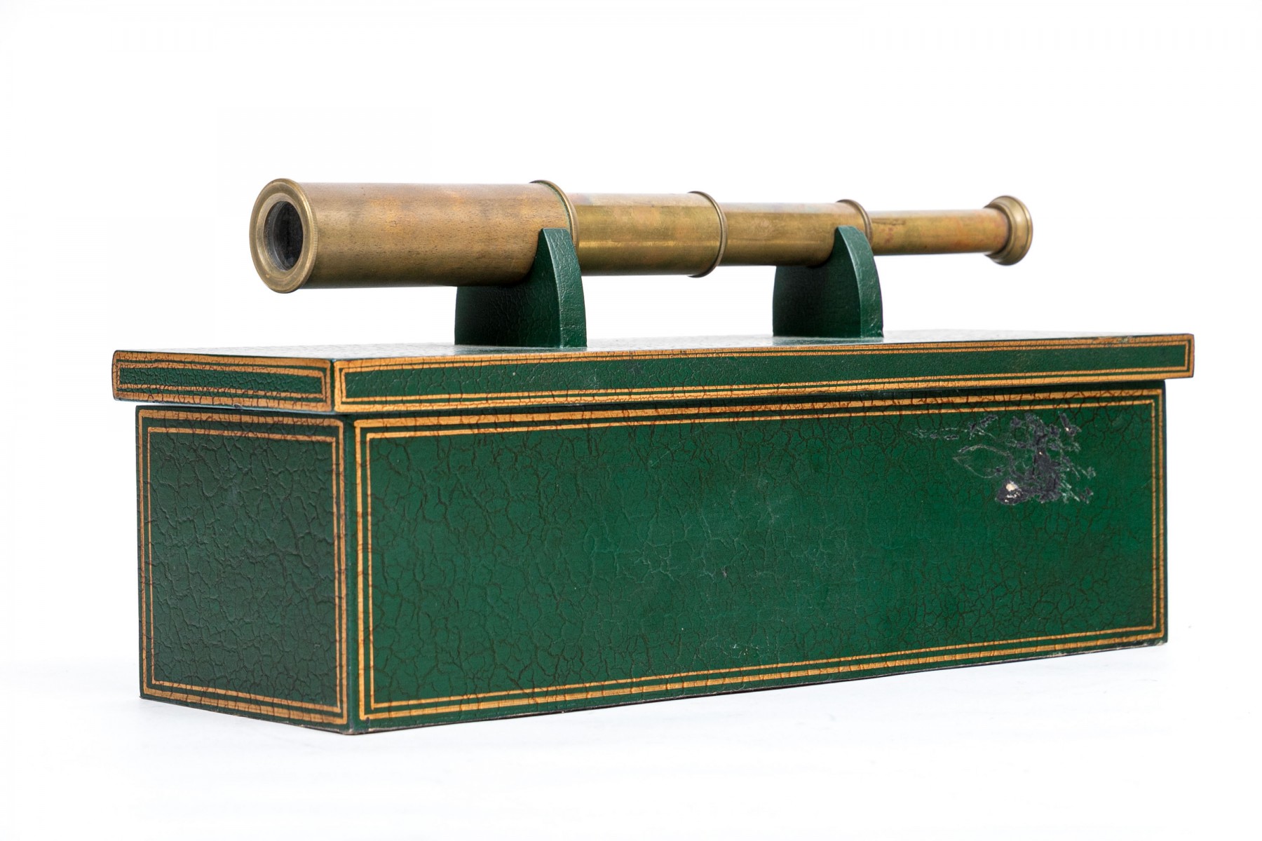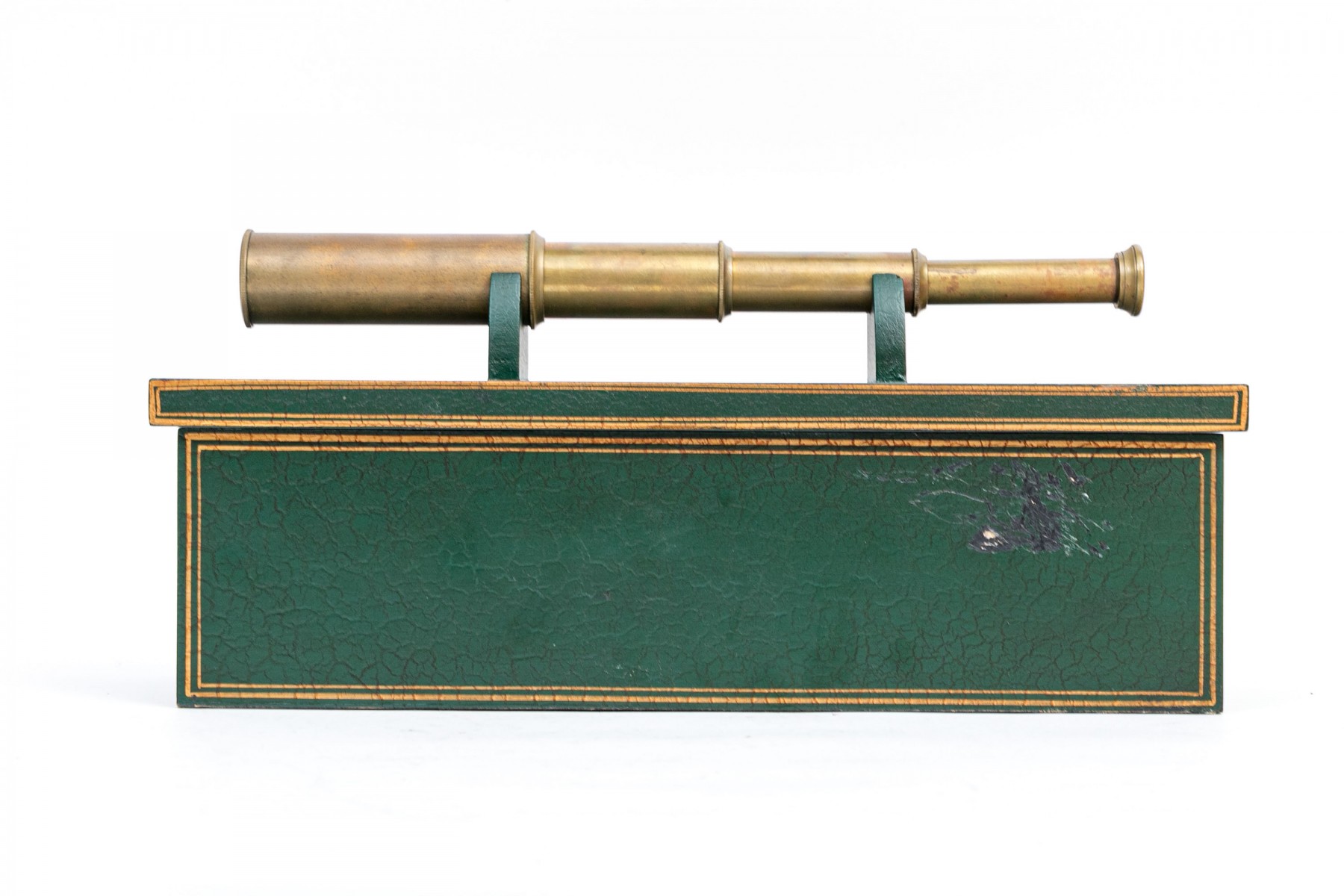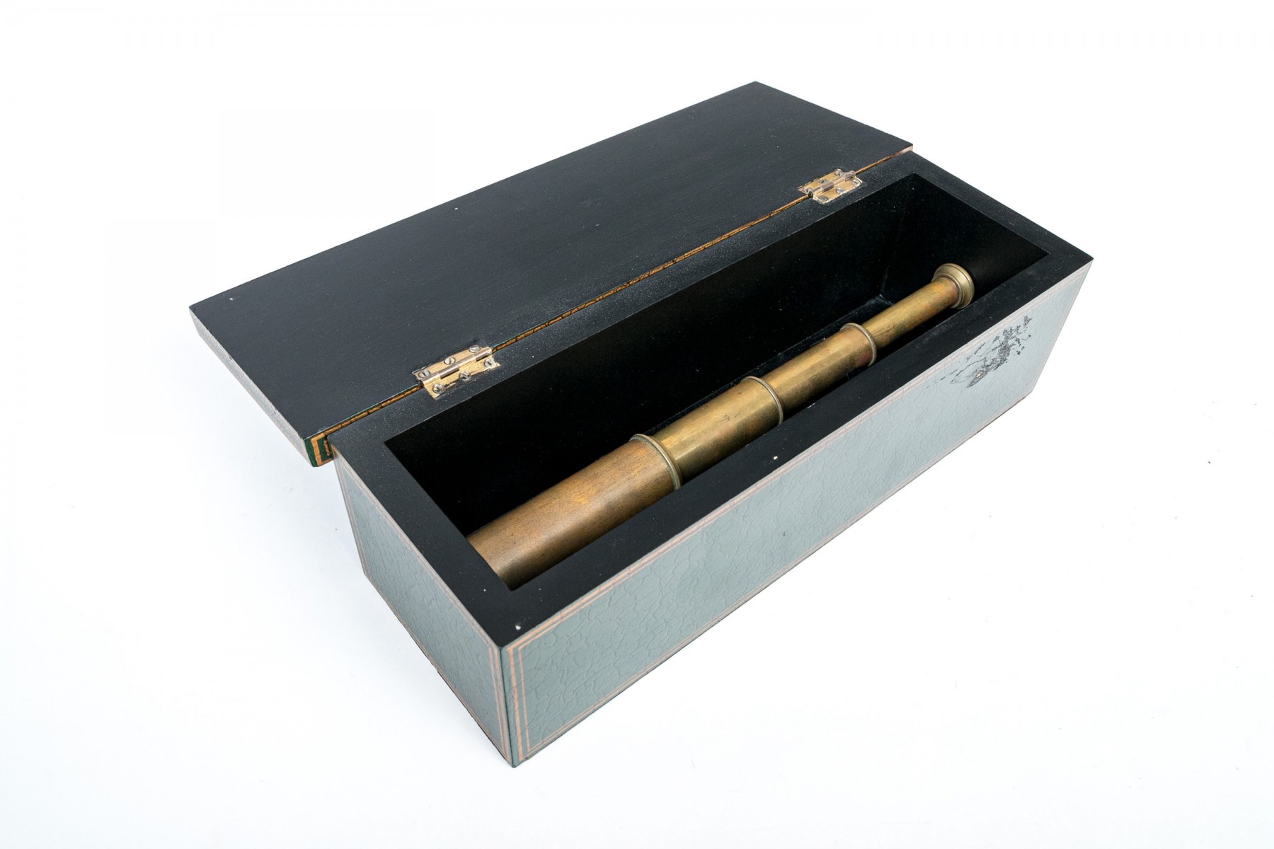 A collapsible spy glass in brass. With a green faux leather covered black wooden box with gilt trim and top and inner supports for the instrument.