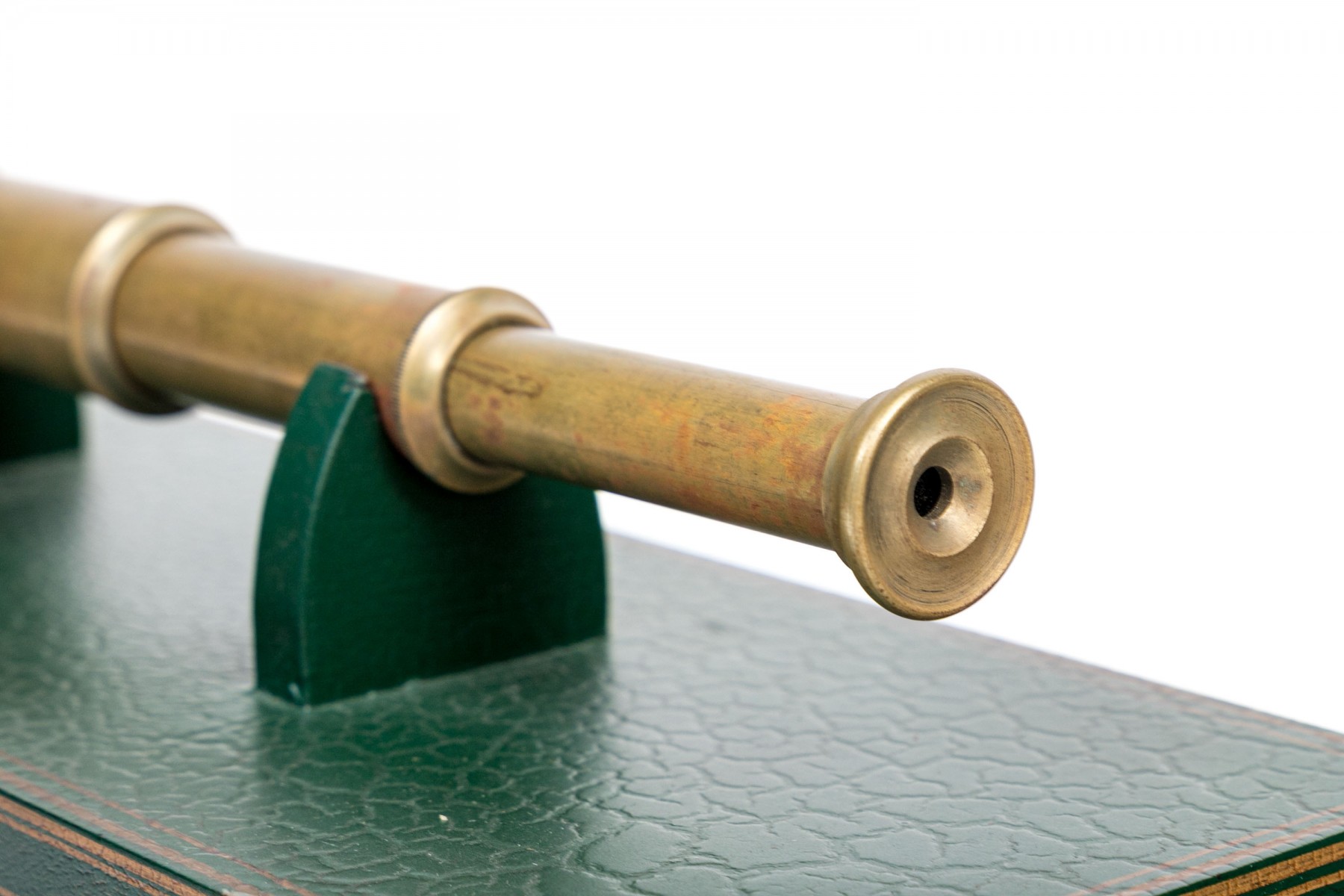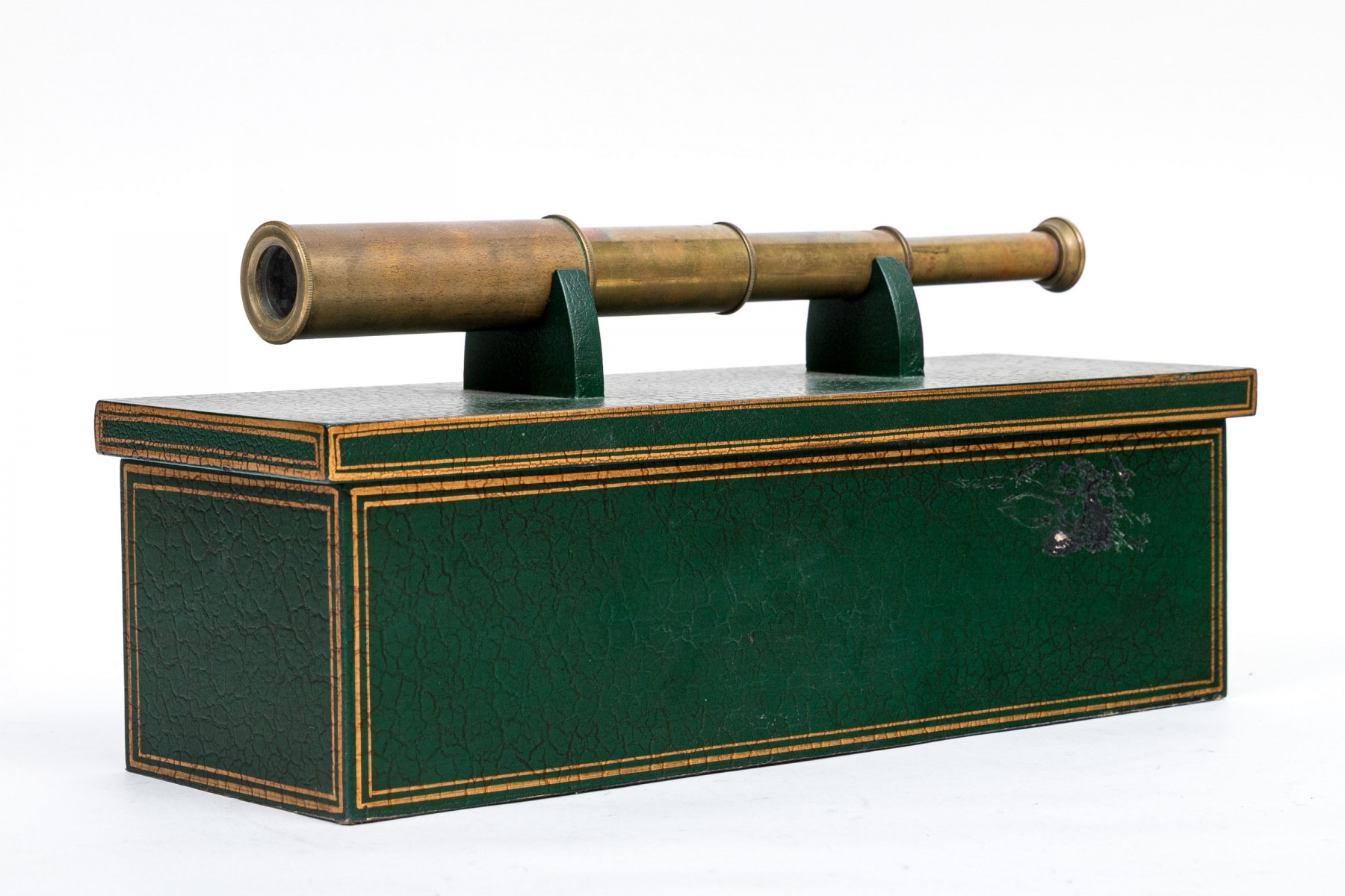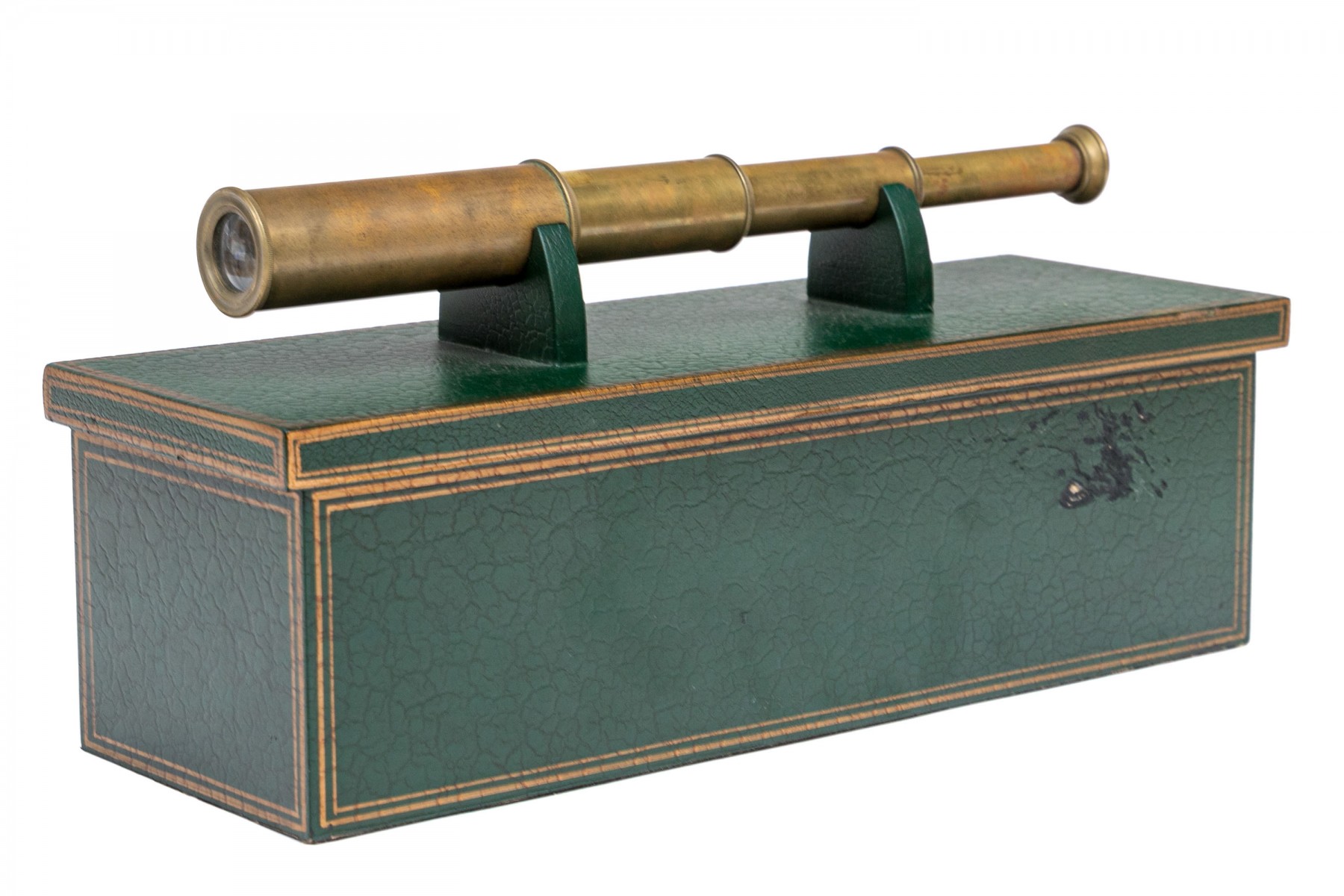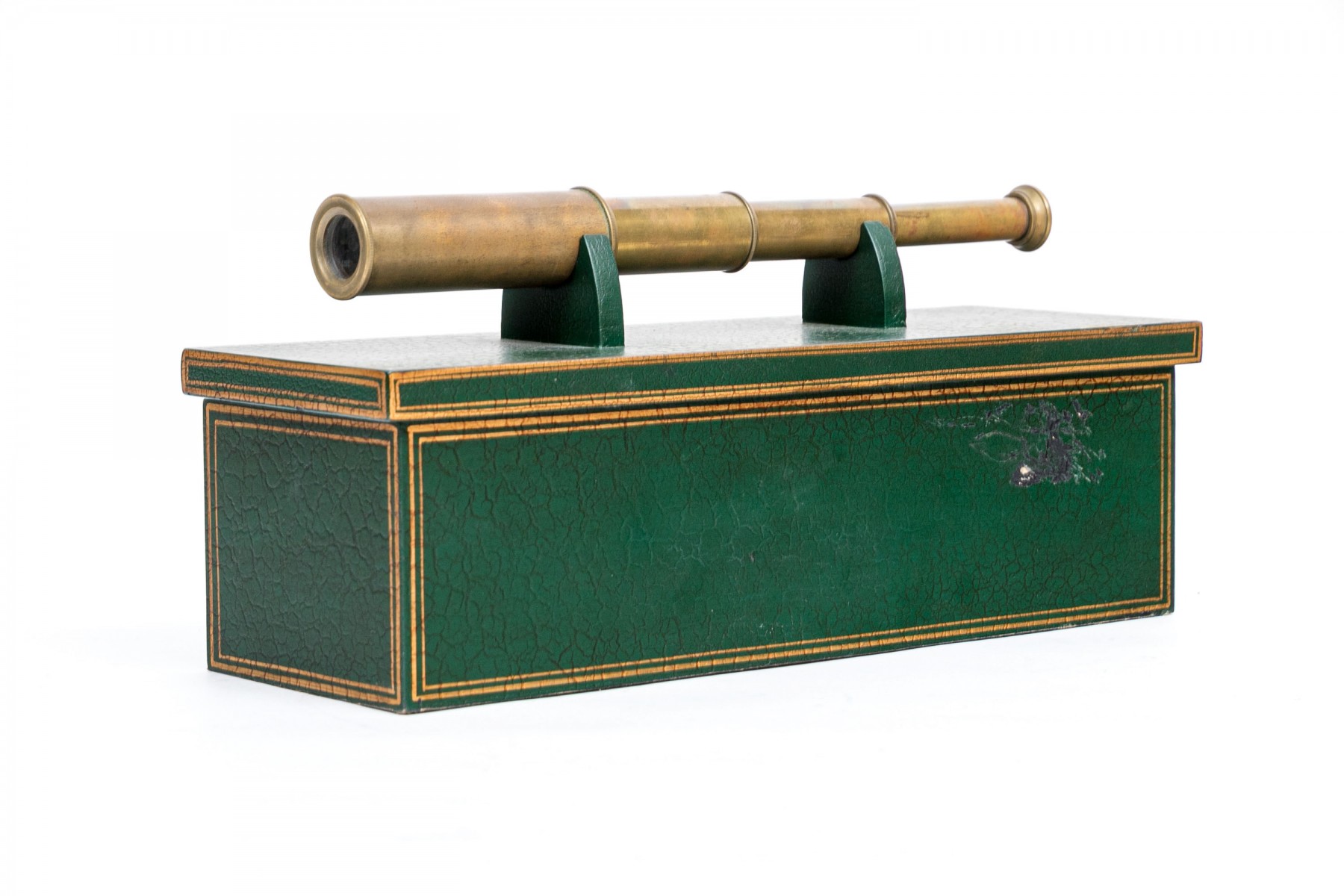 A collapsible spy glass in brass. With a green faux leather covered black wooden box with gilt trim and top and inner supports for the instrument.