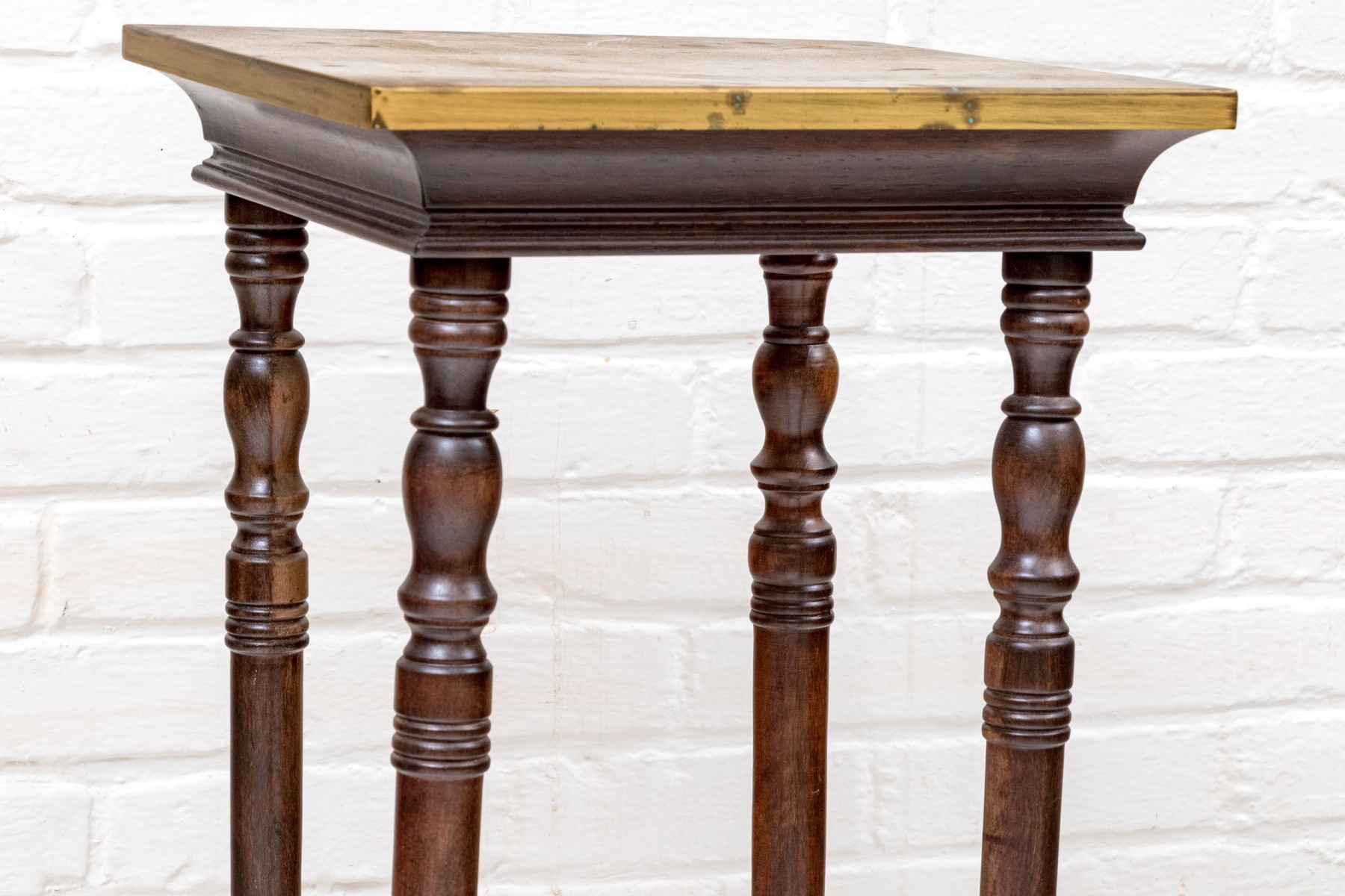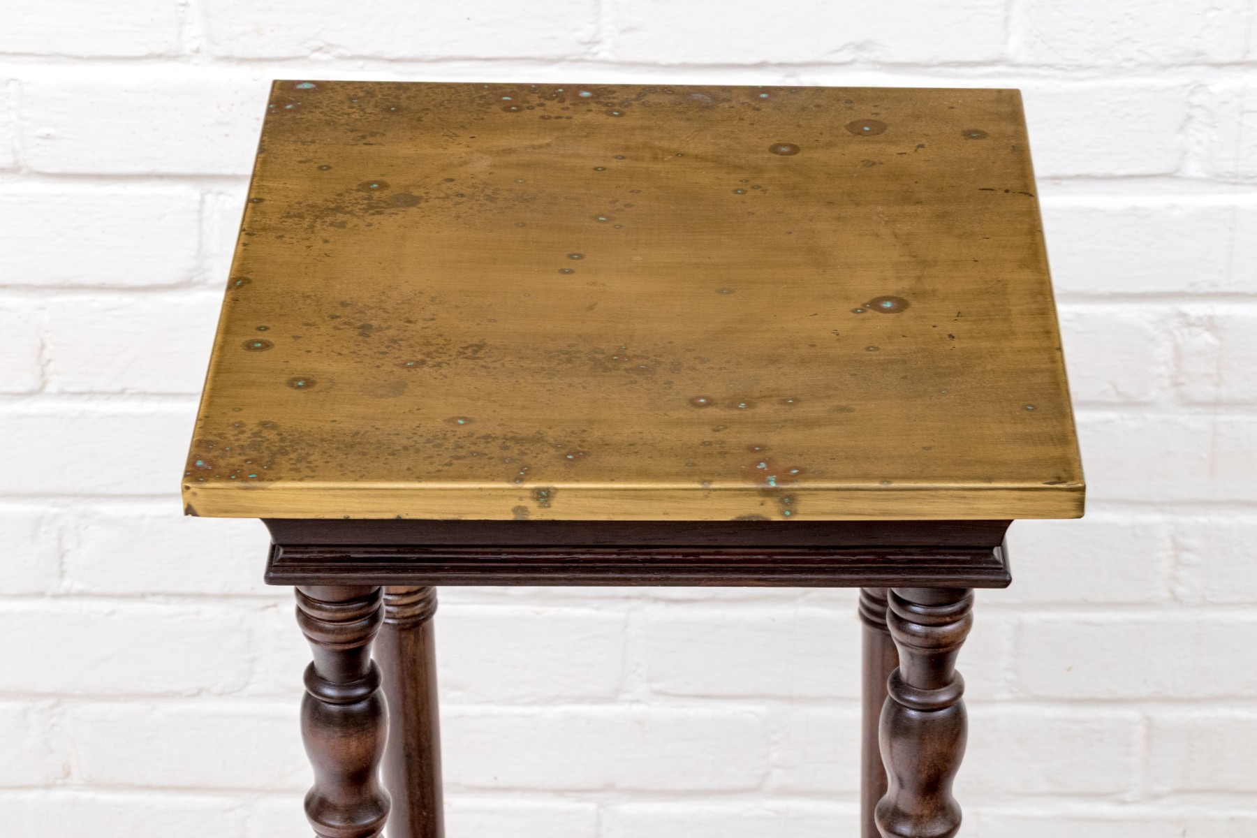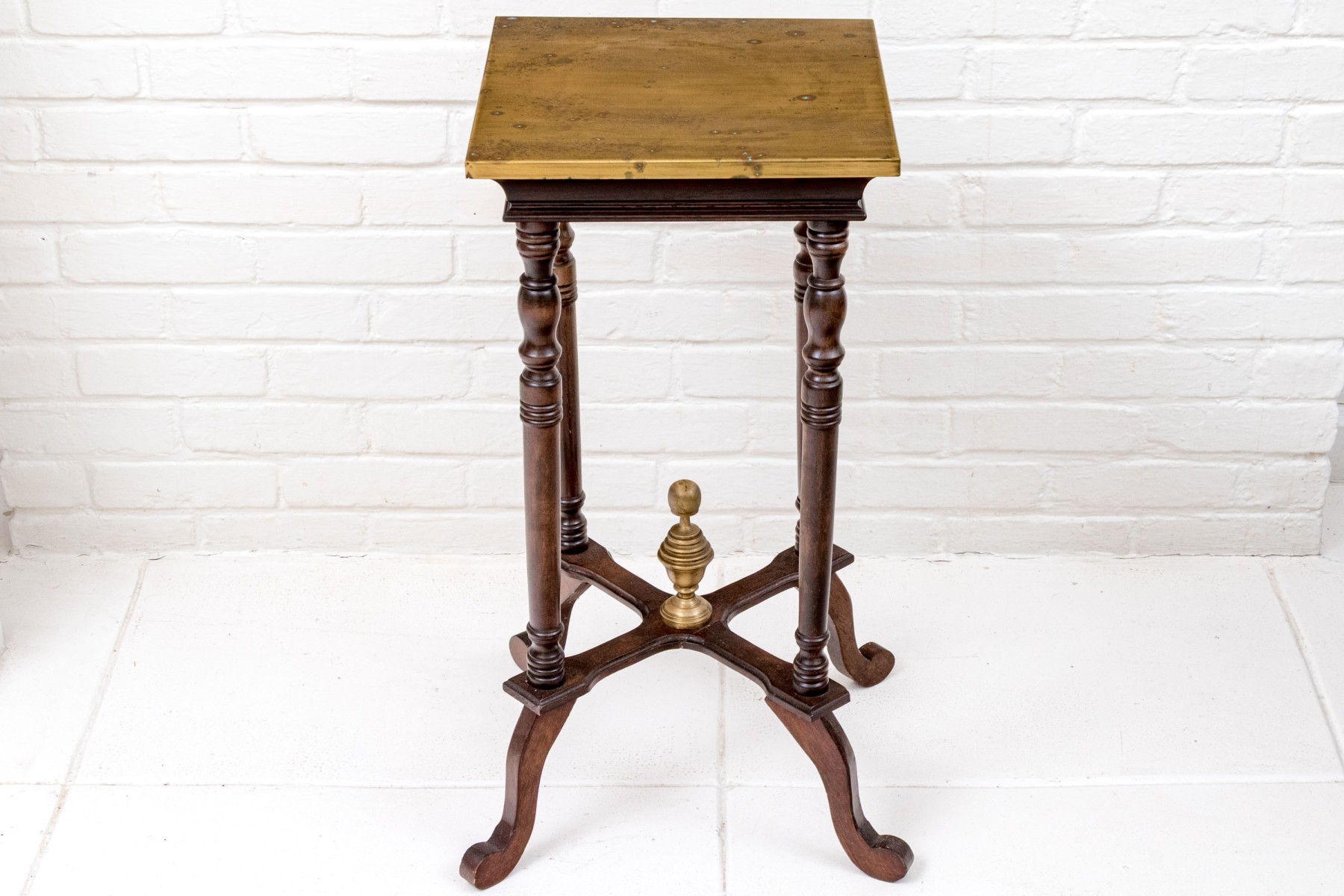 A stately accent table or plant stand with great Eastlake style, showcasing a brass clad square top over four beautifully turned dark brown wood legs with bobbin accents leading to an X-stretcher with a gilt statement finial at the center, raised over cabriole legs.
