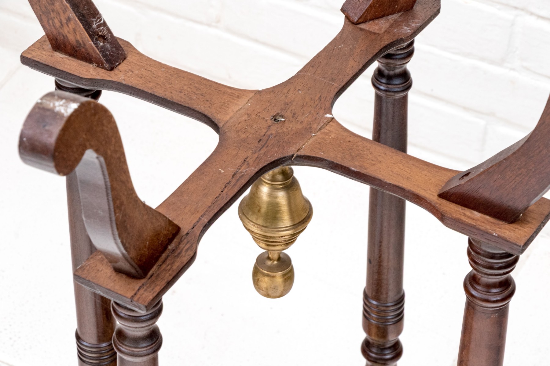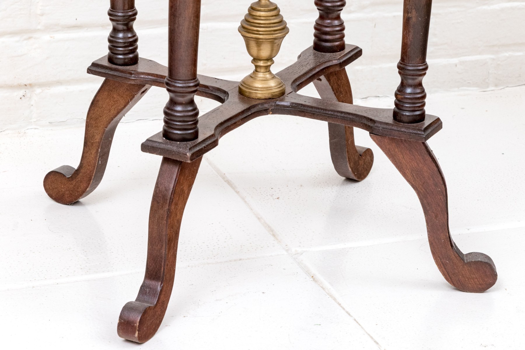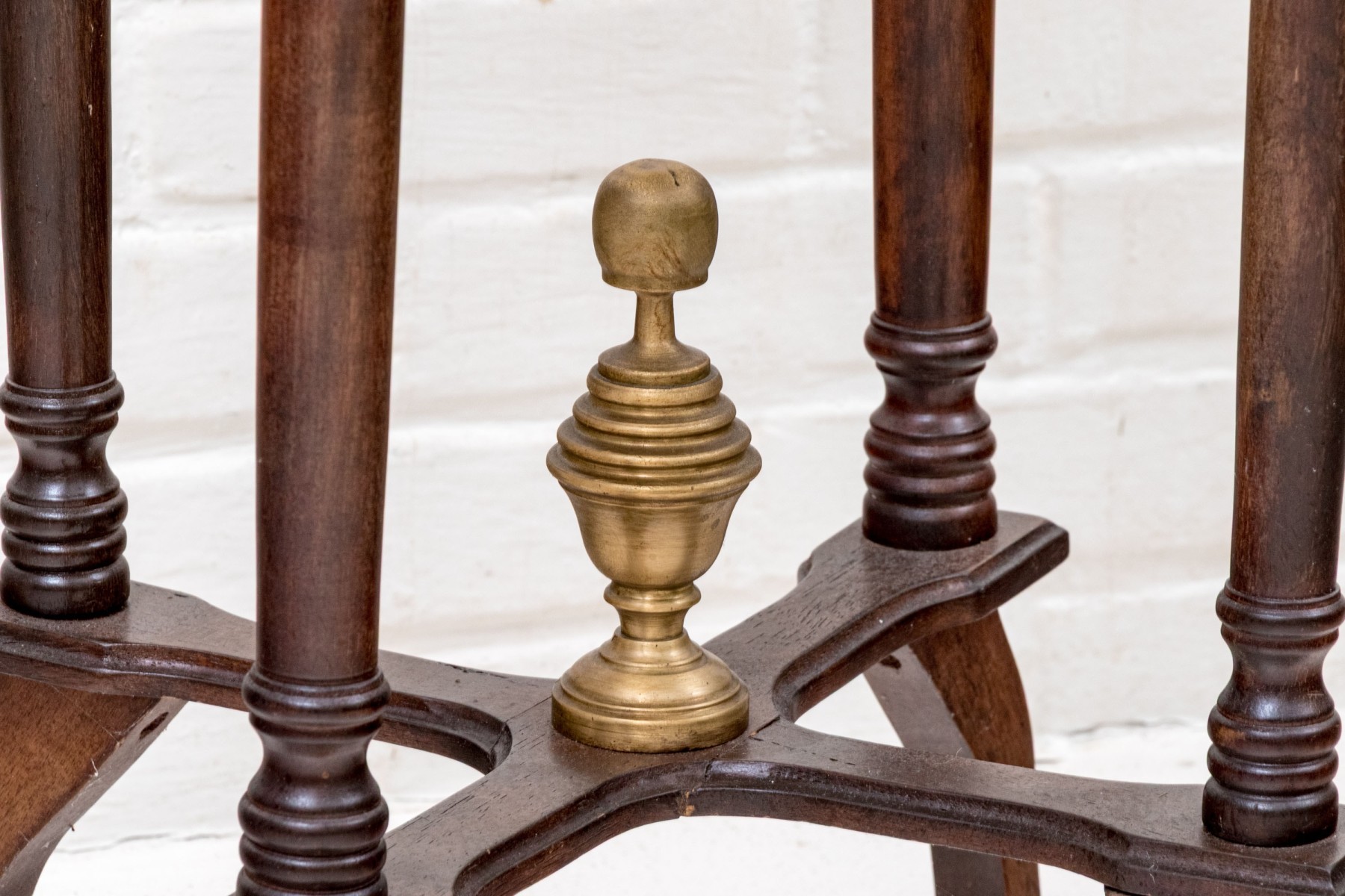 A stately accent table or plant stand with great Eastlake style, showcasing a brass clad square top over four beautifully turned dark brown wood legs with bobbin accents leading to an X-stretcher with a gilt statement finial at the center, raised over cabriole legs.