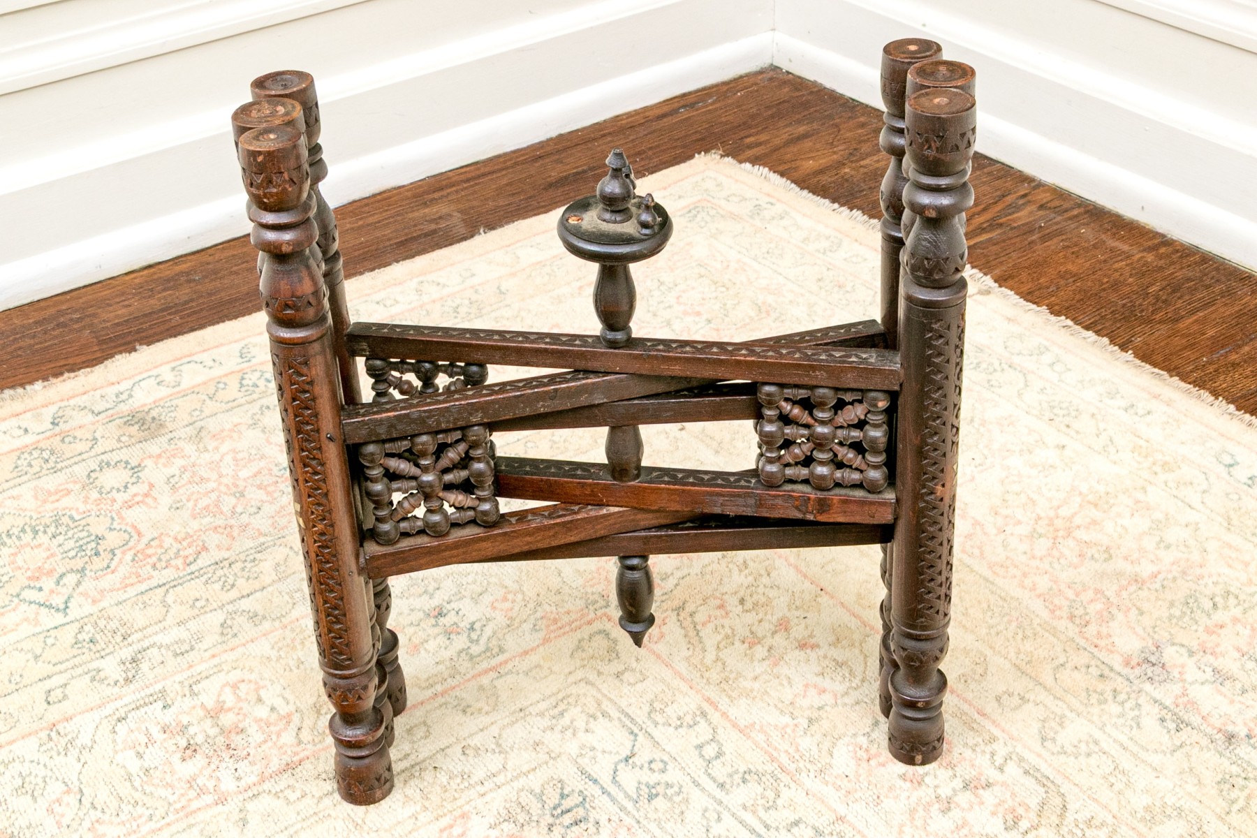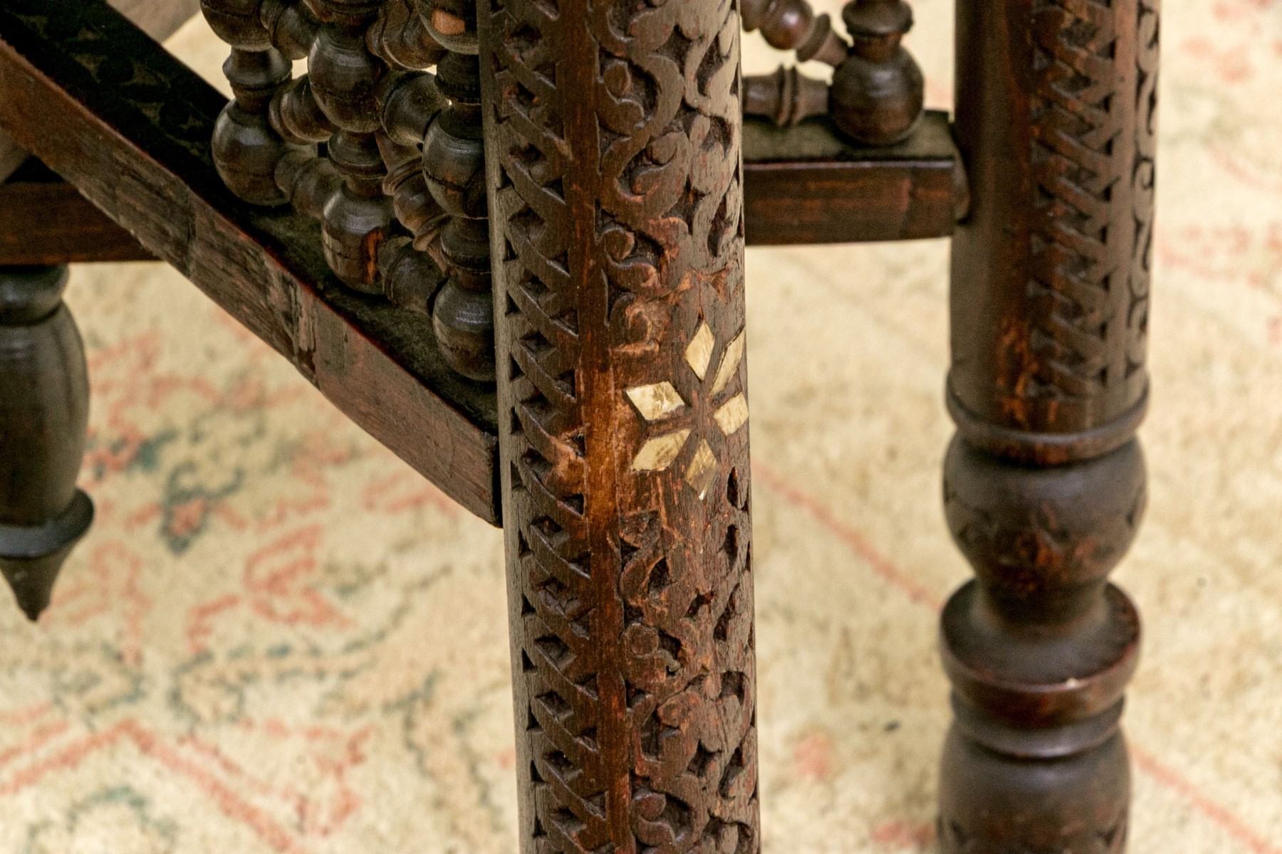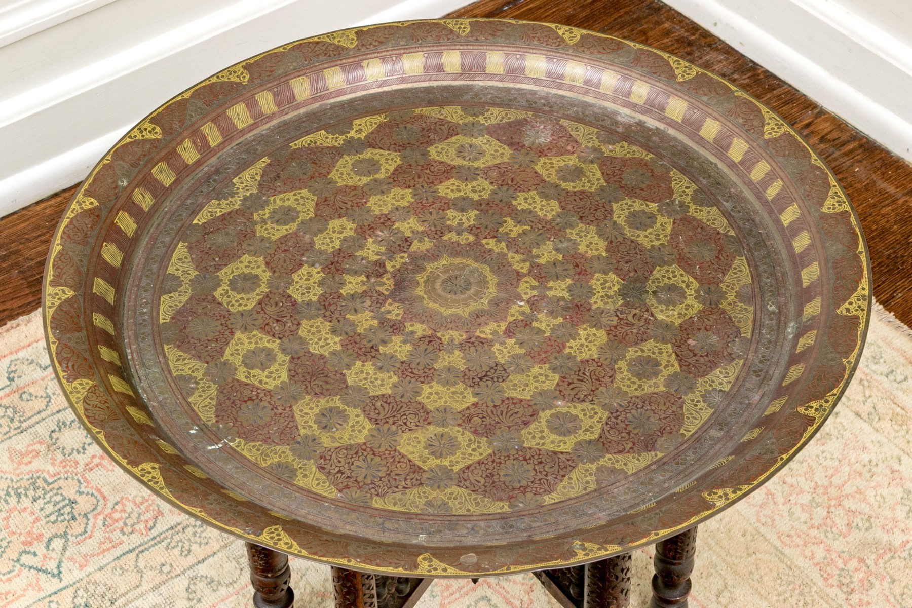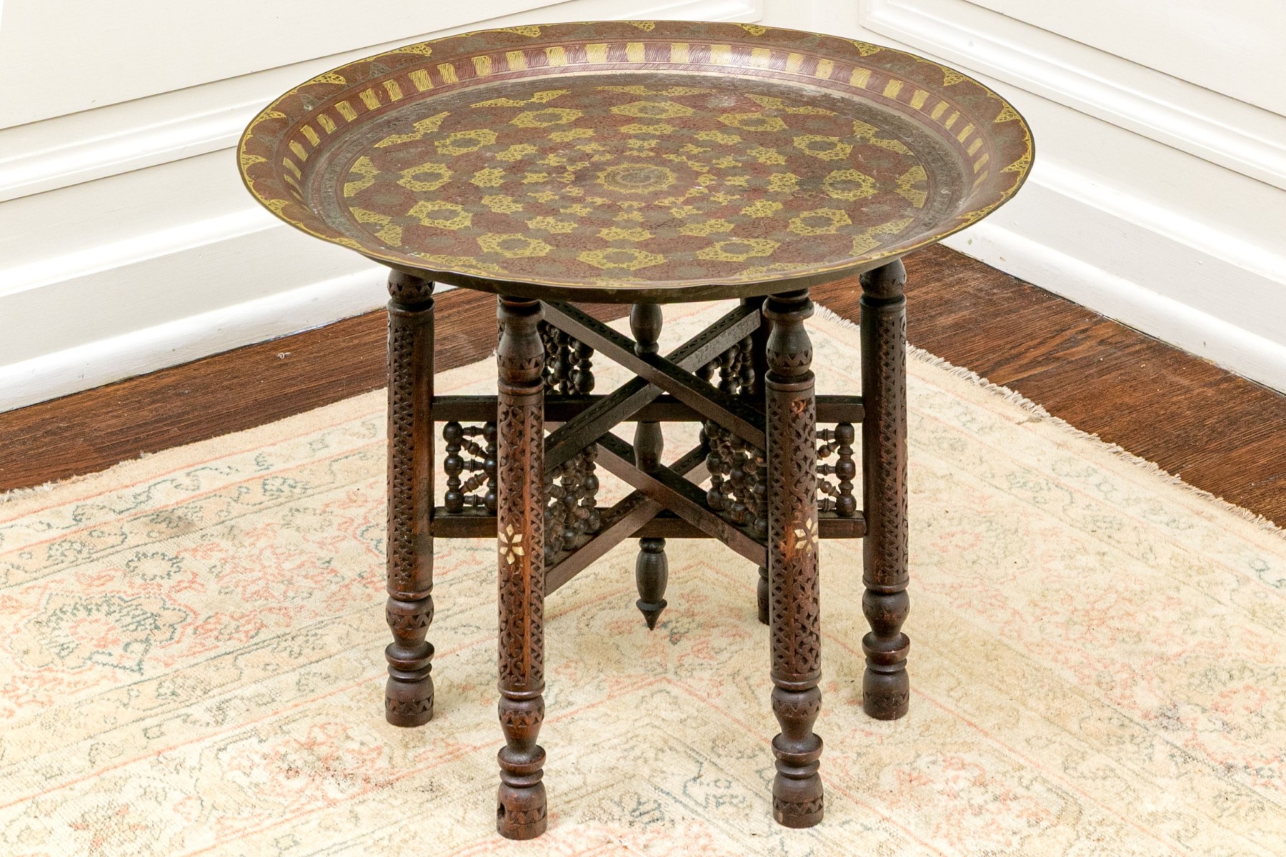 A handsome accent table sporting a large and impressively detailed circular brass tray top lavishly decorated with a concentric ring of red navette medallions. The tray is set atop a well carved wood base with six cylindrical legs carved with scrolls, lattices, and inlaid star motifs. The collapsable frame is finished with turned rails leading to the center, making for an eye-catching design.