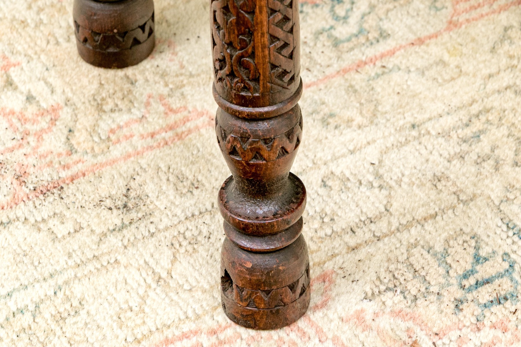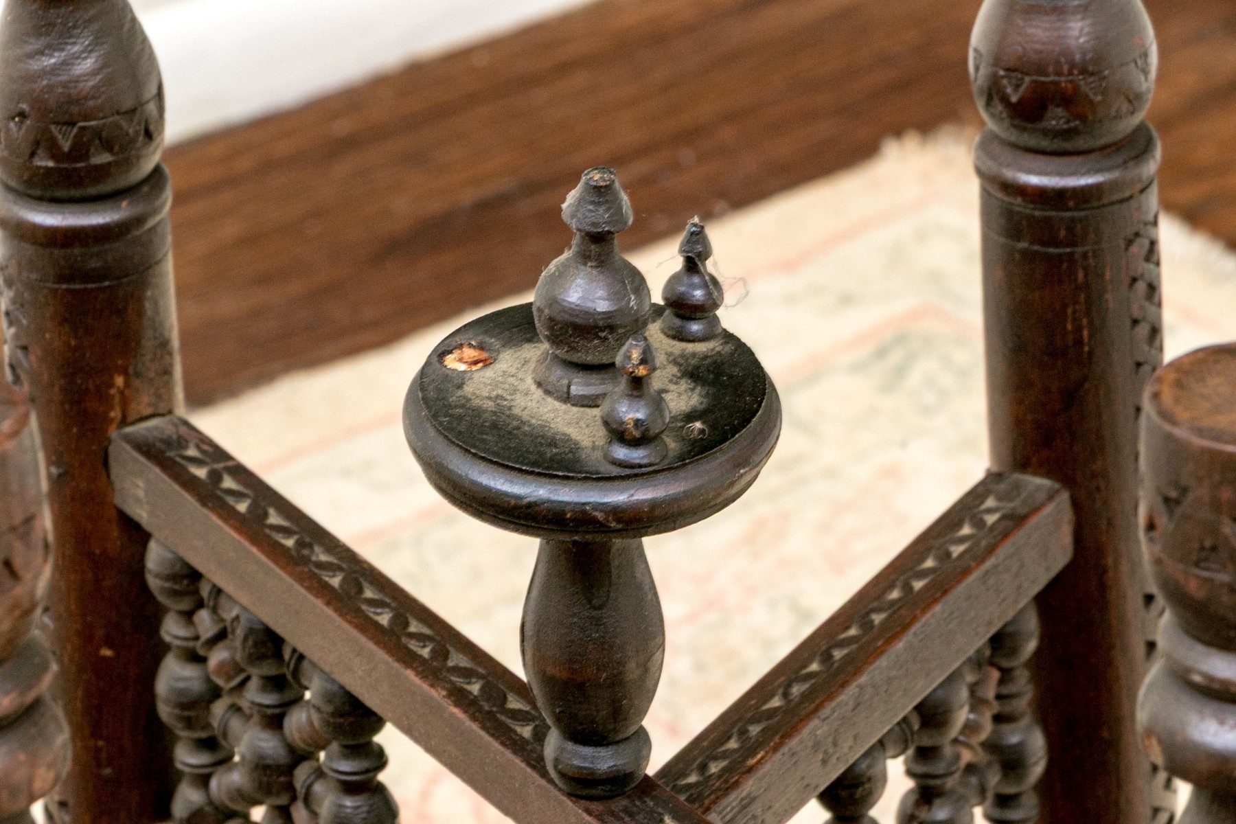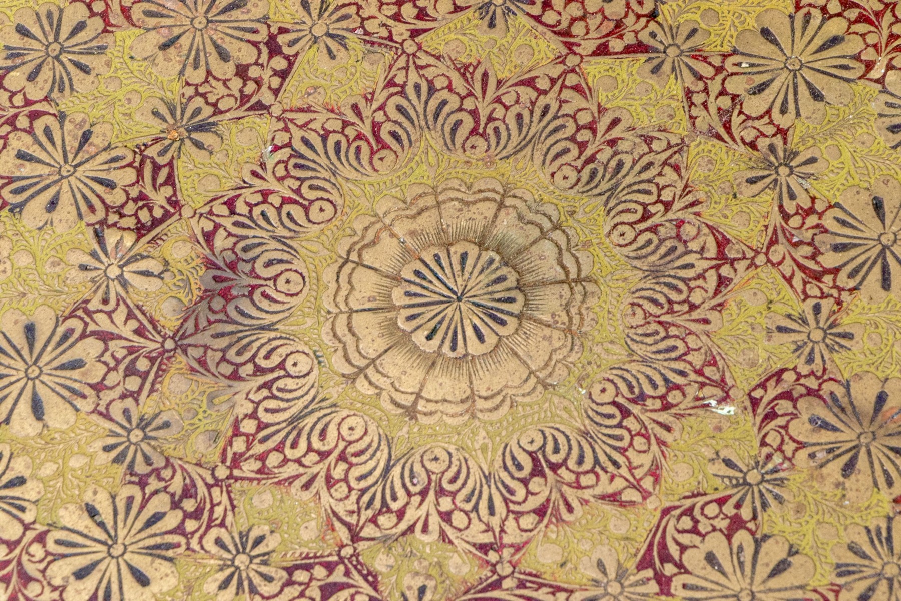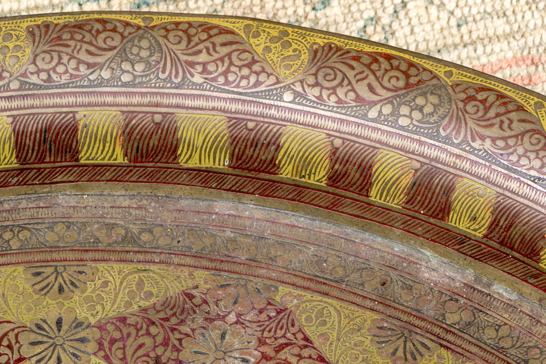 A handsome accent table sporting a large and impressively detailed circular brass tray top lavishly decorated with a concentric ring of red navette medallions. The tray is set atop a well carved wood base with six cylindrical legs carved with scrolls, lattices, and inlaid star motifs. The collapsable frame is finished with turned rails leading to the center, making for an eye-catching design.