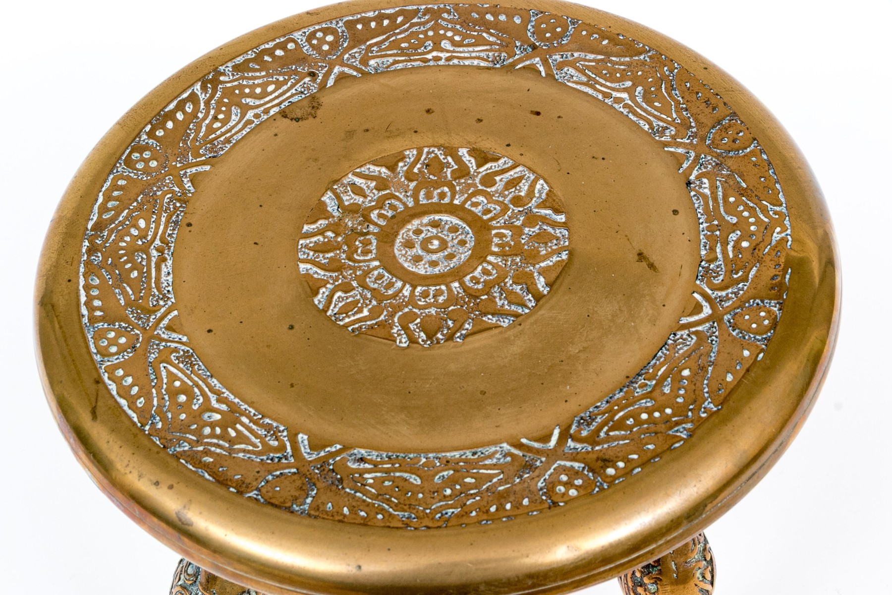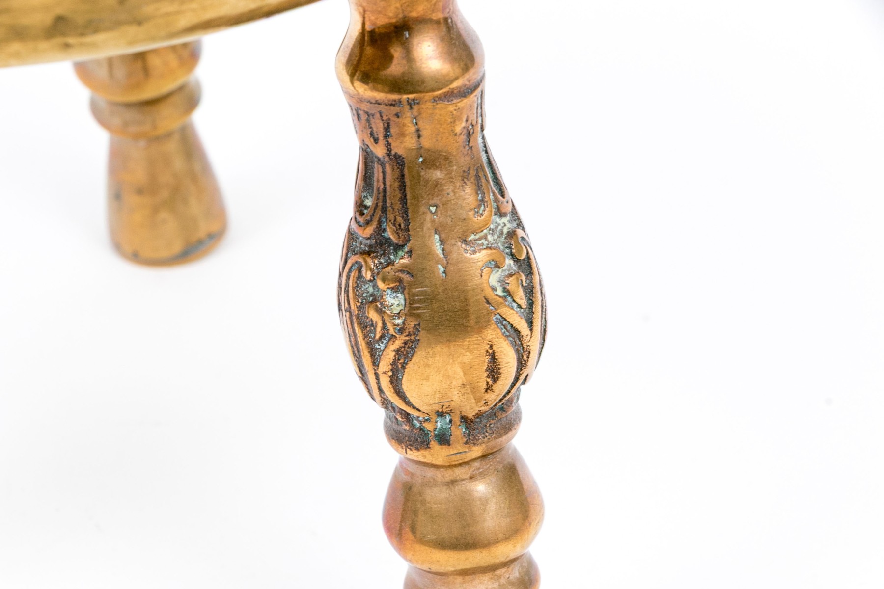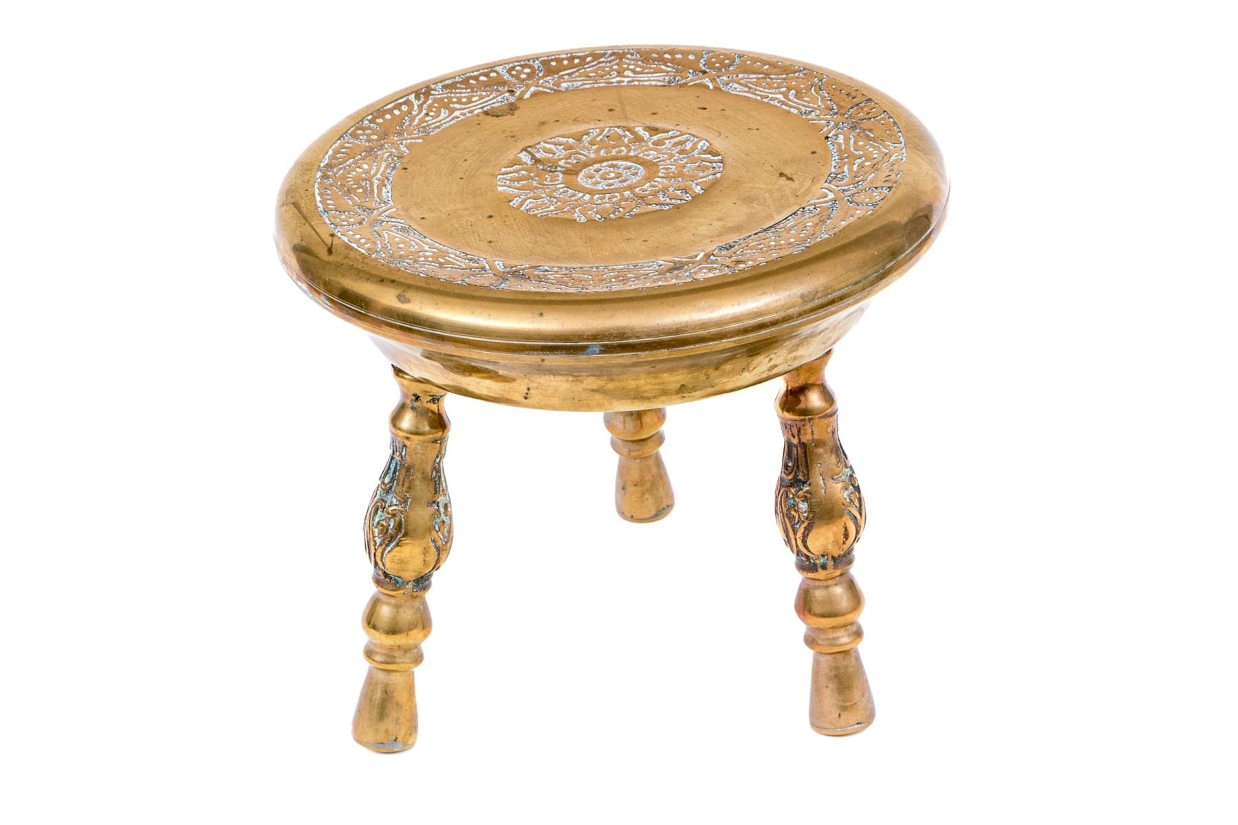 A well aged and nicely designed brass chowki foot stool with a circular top lavish decorated with debossed geometric and dotted borders. Raised on a tripod of shapely baluster legs with gently tapered and rounded feet.