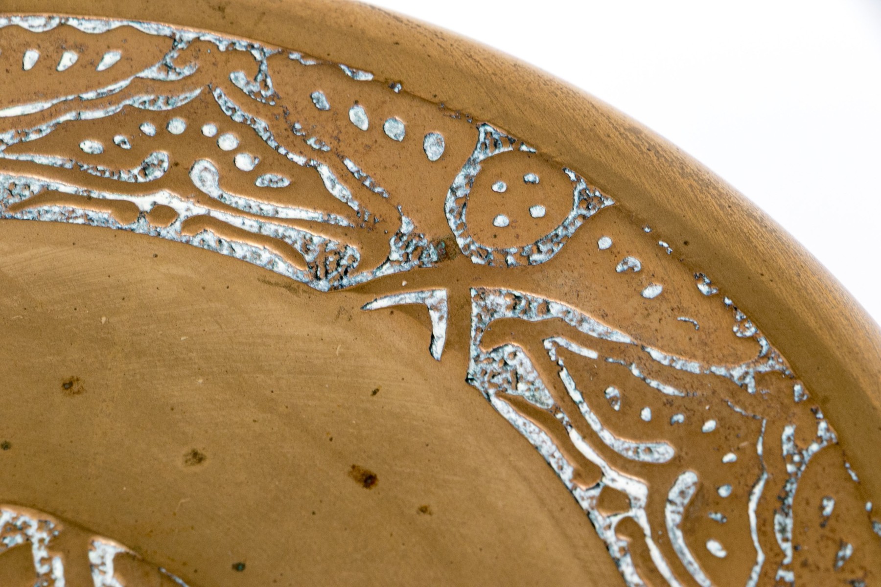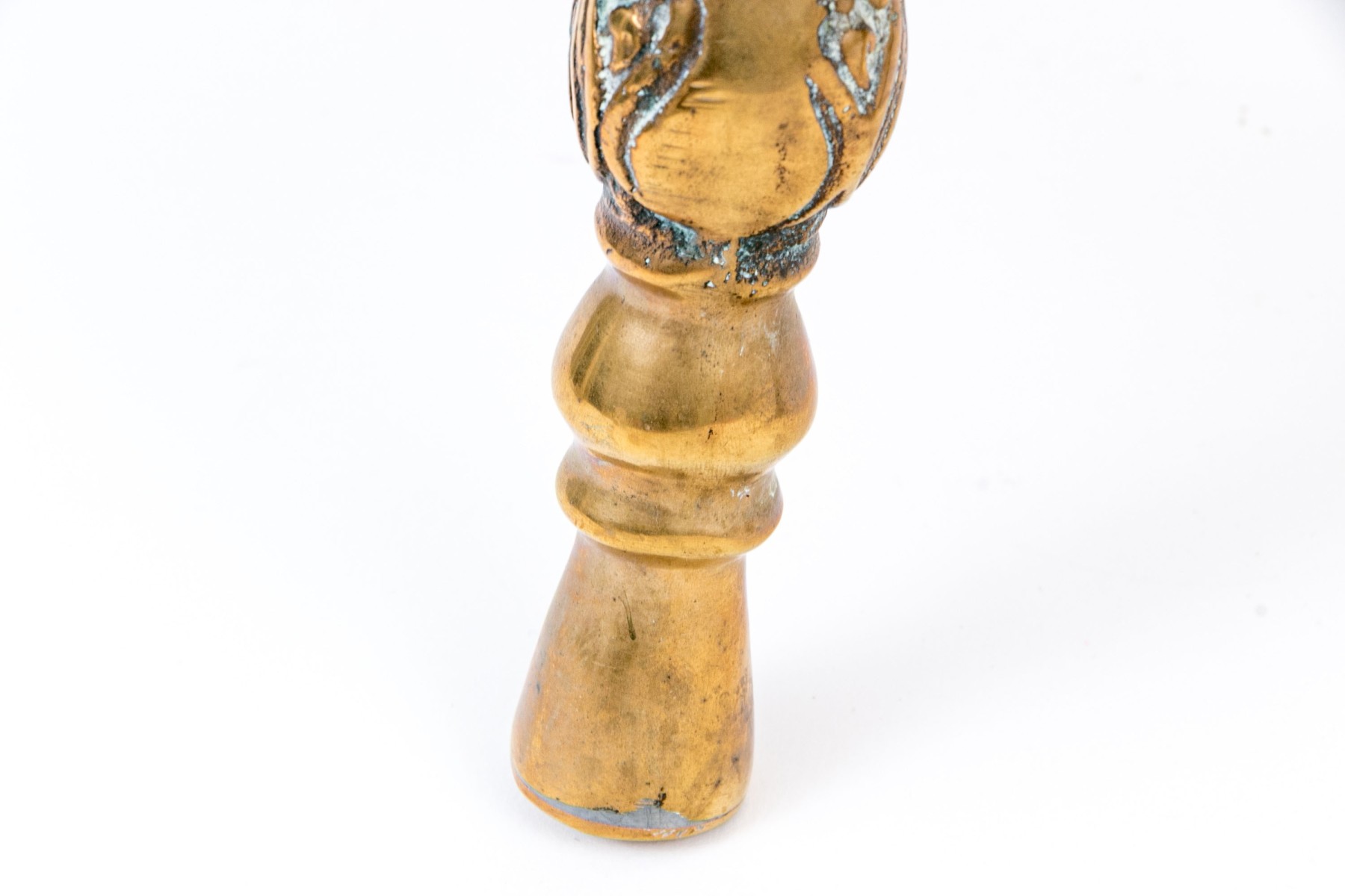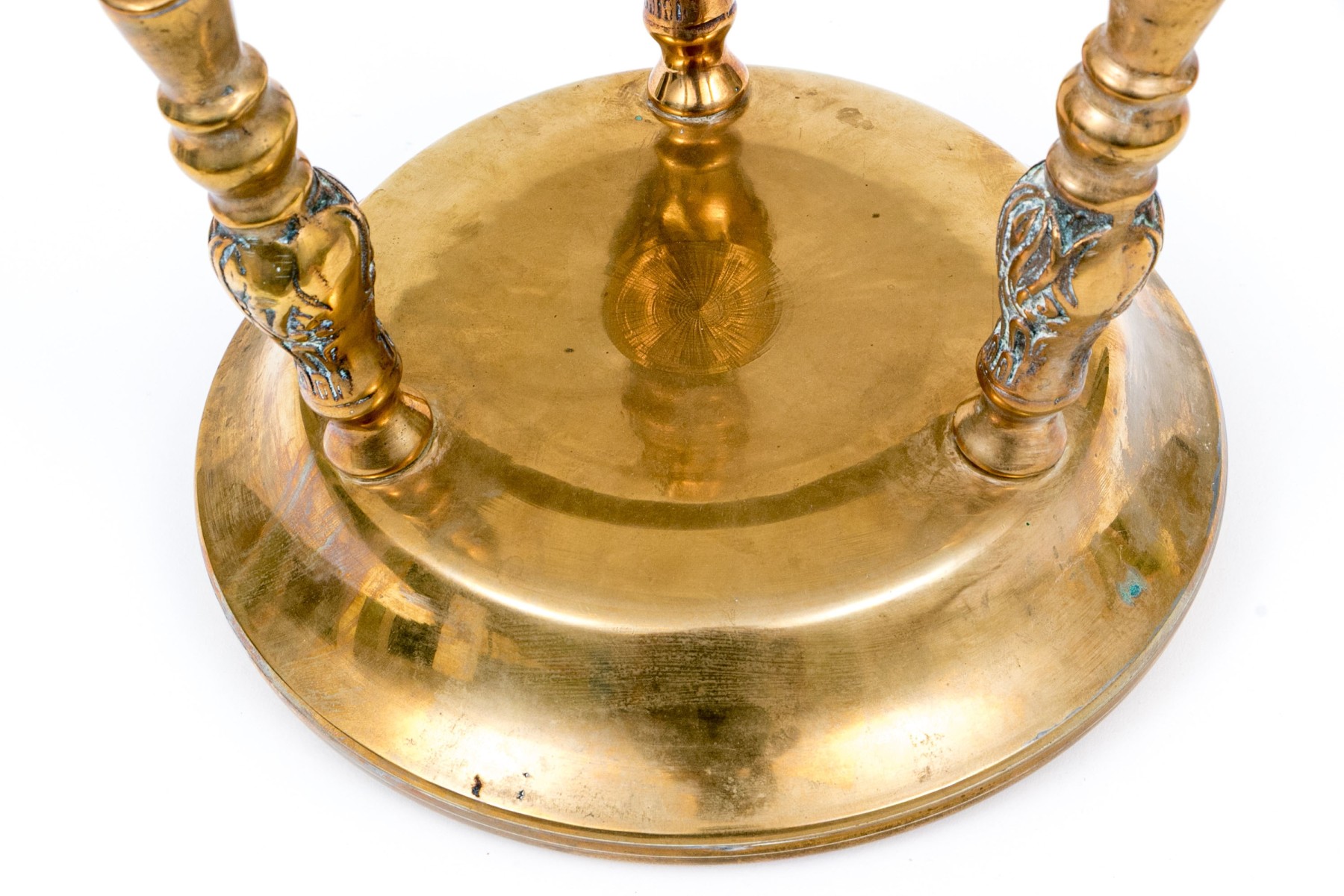 A well aged and nicely designed brass chowki foot stool with a circular top lavish decorated with debossed geometric and dotted borders. Raised on a tripod of shapely baluster legs with gently tapered and rounded feet.