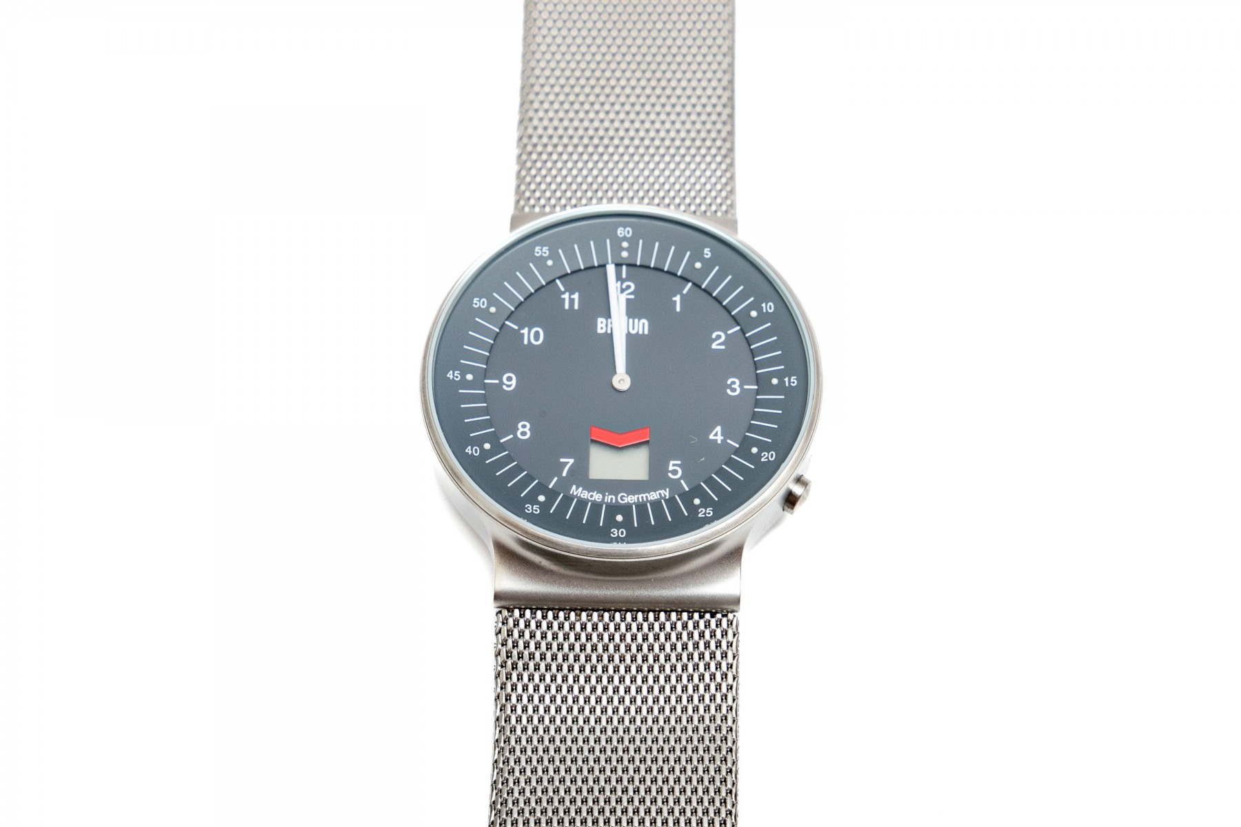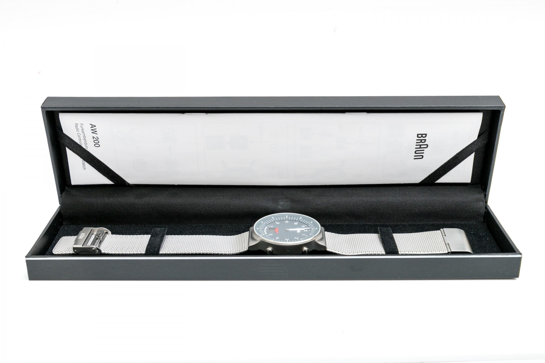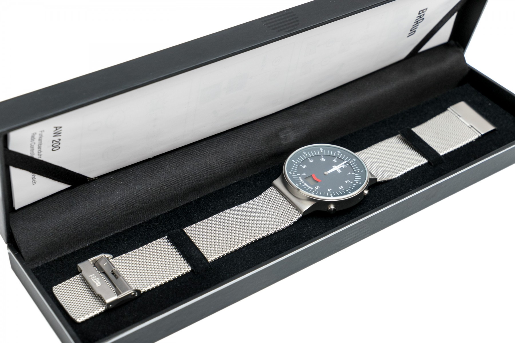 Braun AW200 stylish stainless steel wristwatch displaying a large gray dial with a beveled exterior ring of second markers. Stout, integrated lugs provide a sleek transition to a wide mesh strap. Includes the original box and manual.