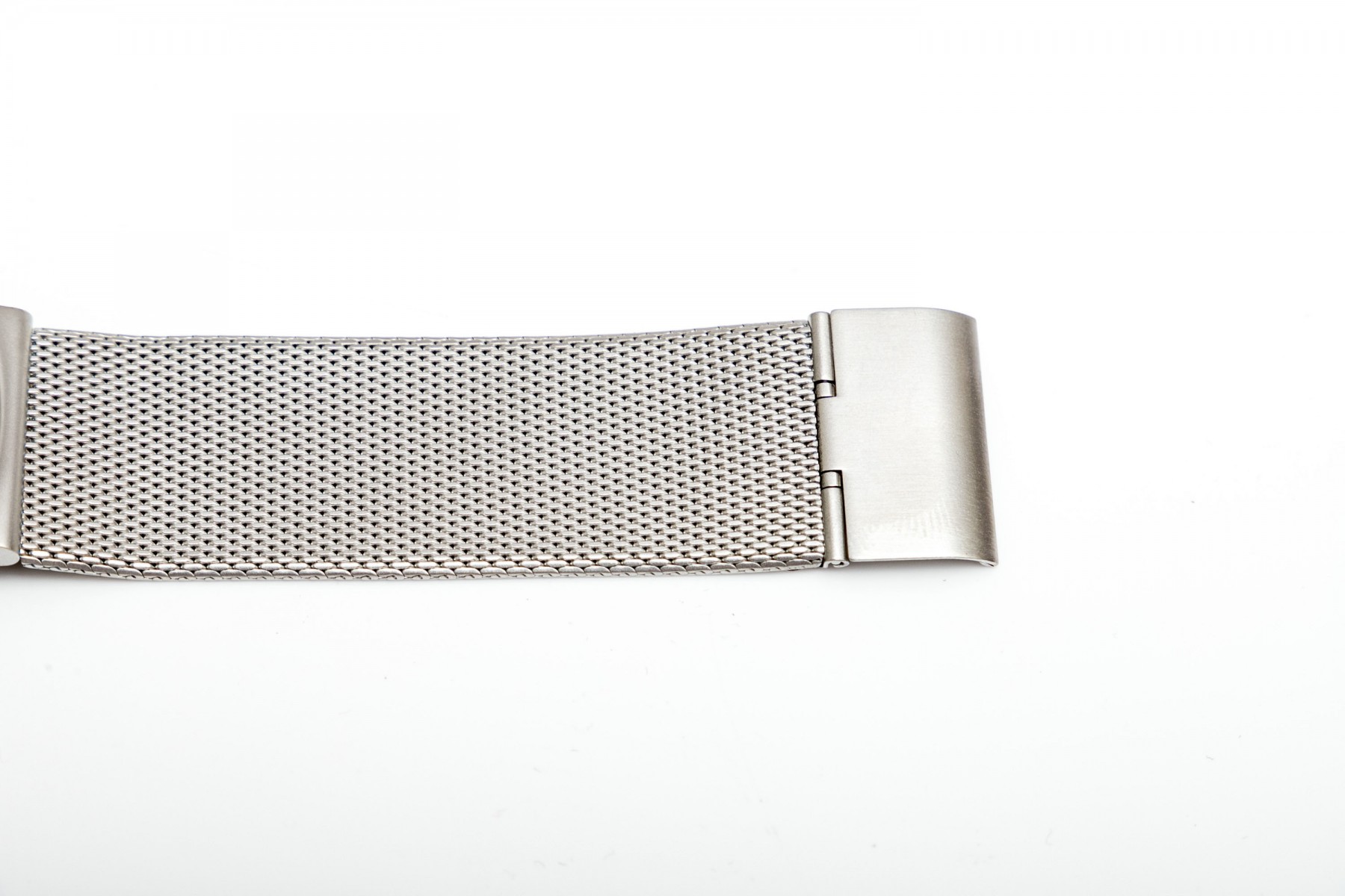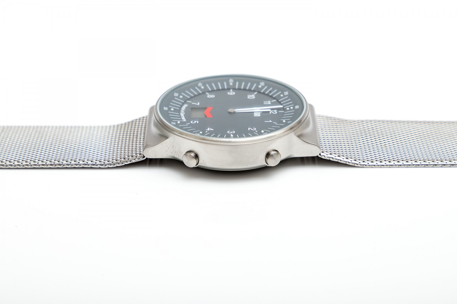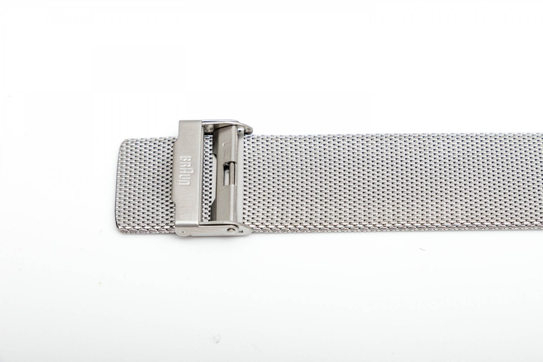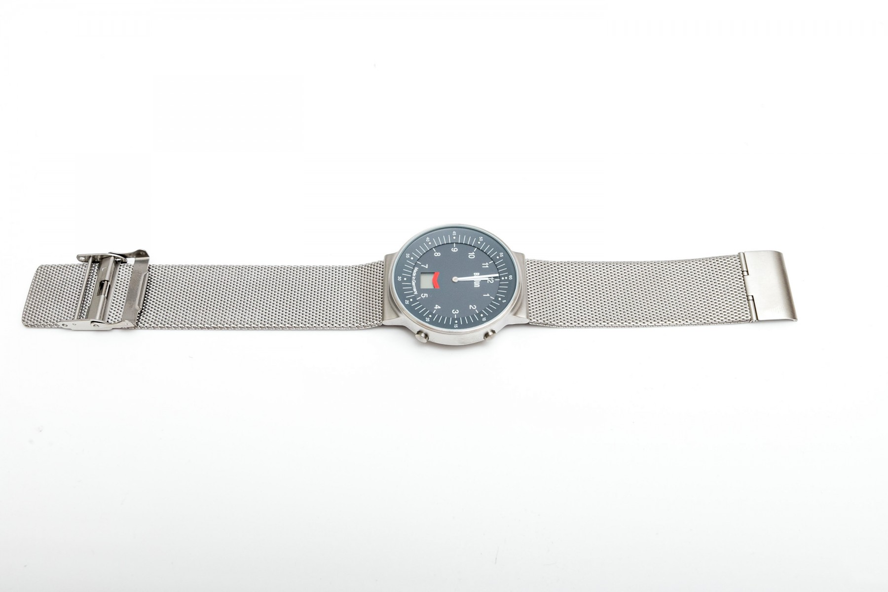 Braun AW200 stylish stainless steel wristwatch displaying a large gray dial with a beveled exterior ring of second markers. Stout, integrated lugs provide a sleek transition to a wide mesh strap. Includes the original box and manual.
