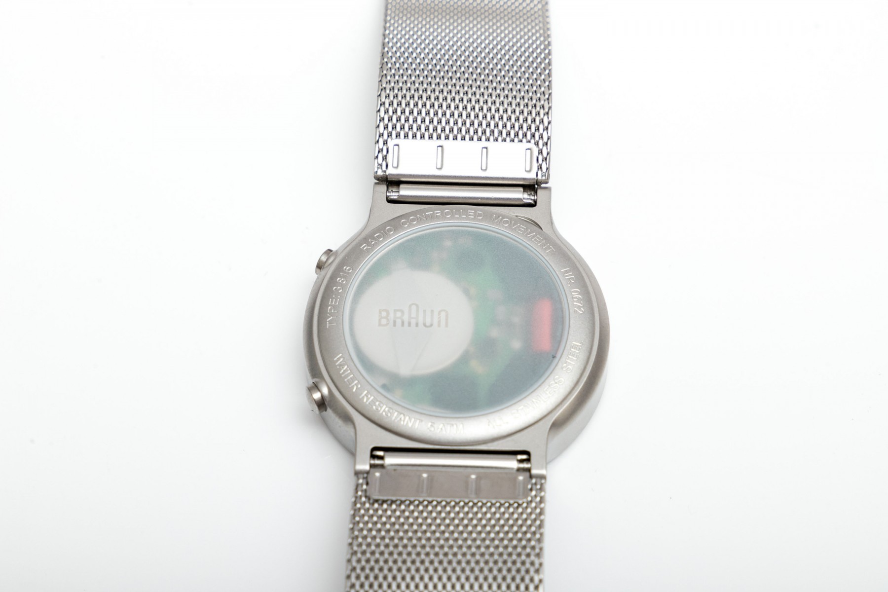 The back of the case is marked: Radio controlled movement, NR 0669, All stainless steel, Water resistant 5 ATM, Type 3816.
