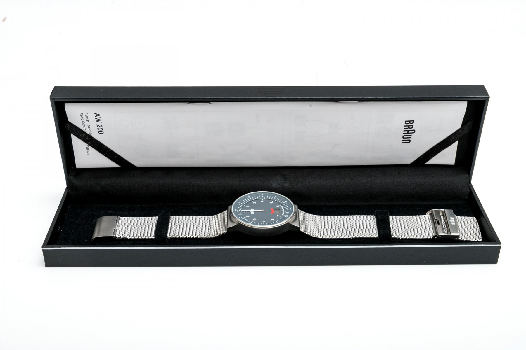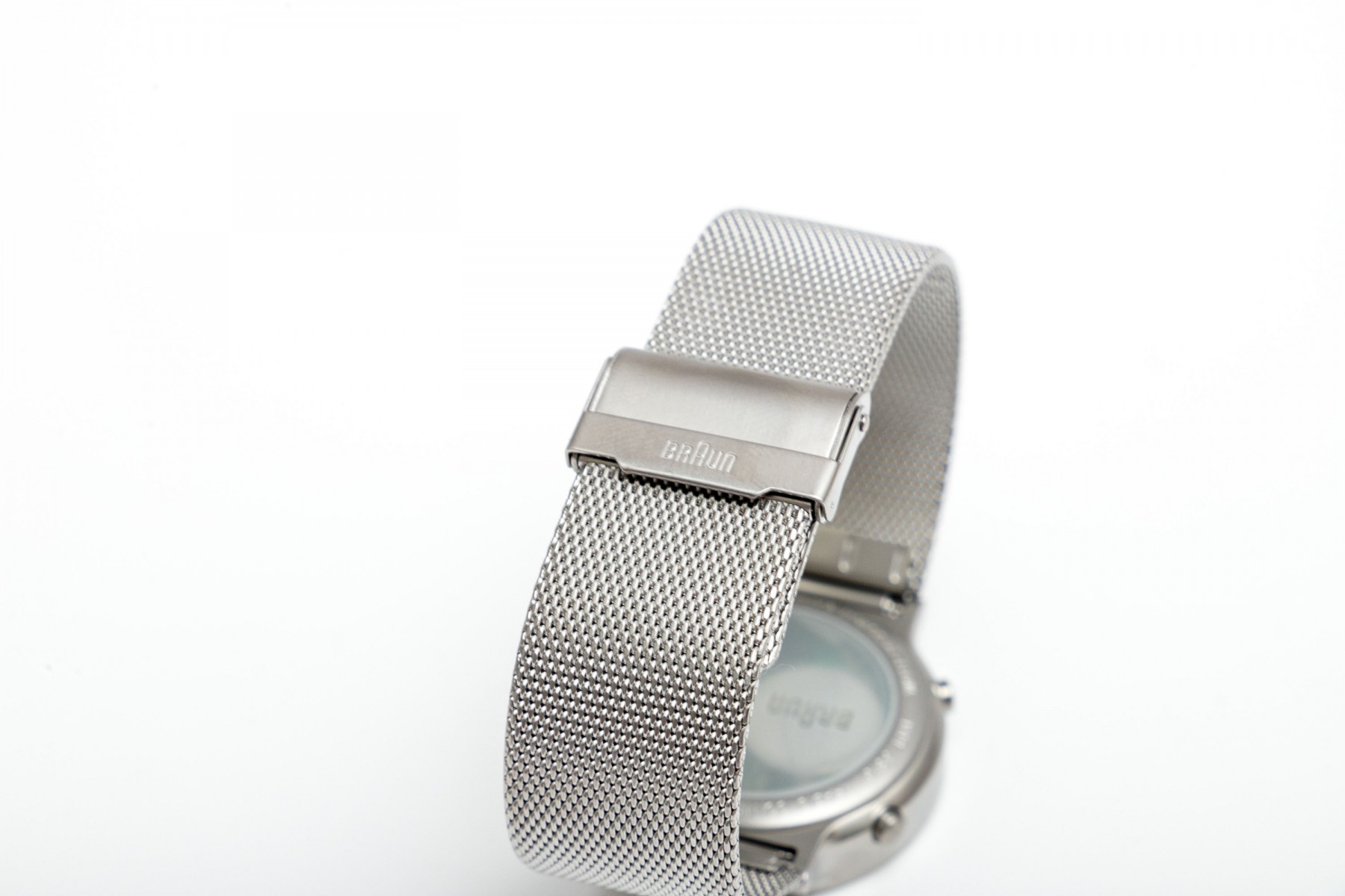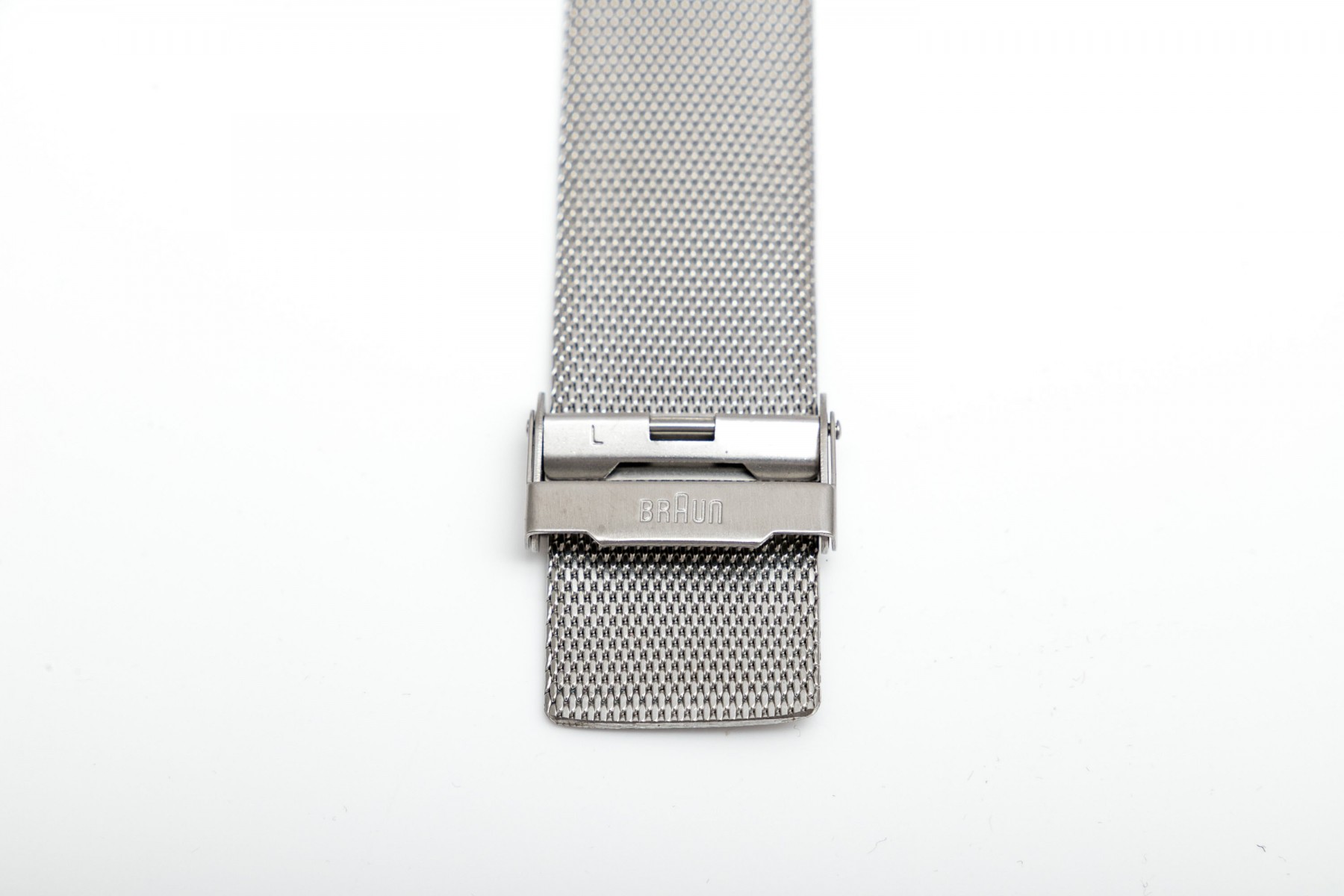 Braun AW200 stylish stainless steel wristwatch displaying a large gray dial with a beveled exterior ring of second markers. Stout, integrated lugs provide a sleek transition to a wide mesh strap. Battery operated. Includes the original box and manual.