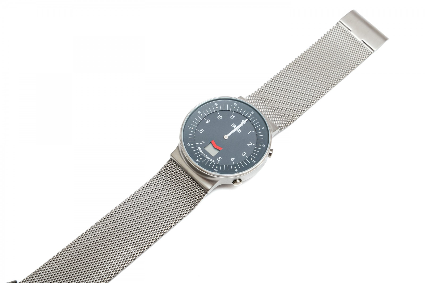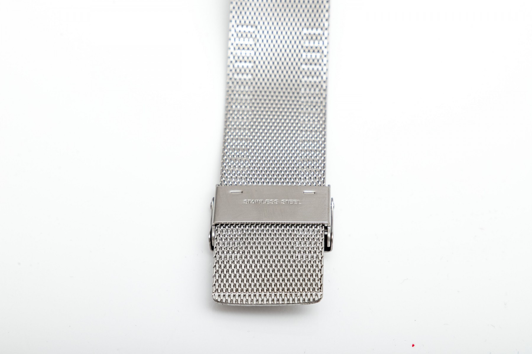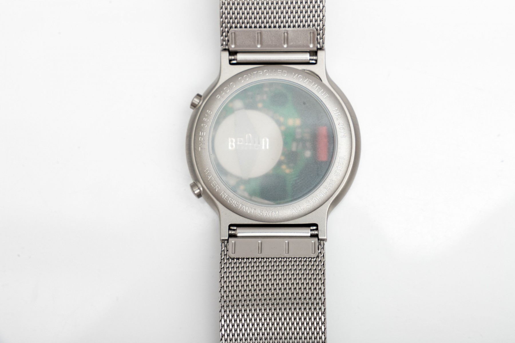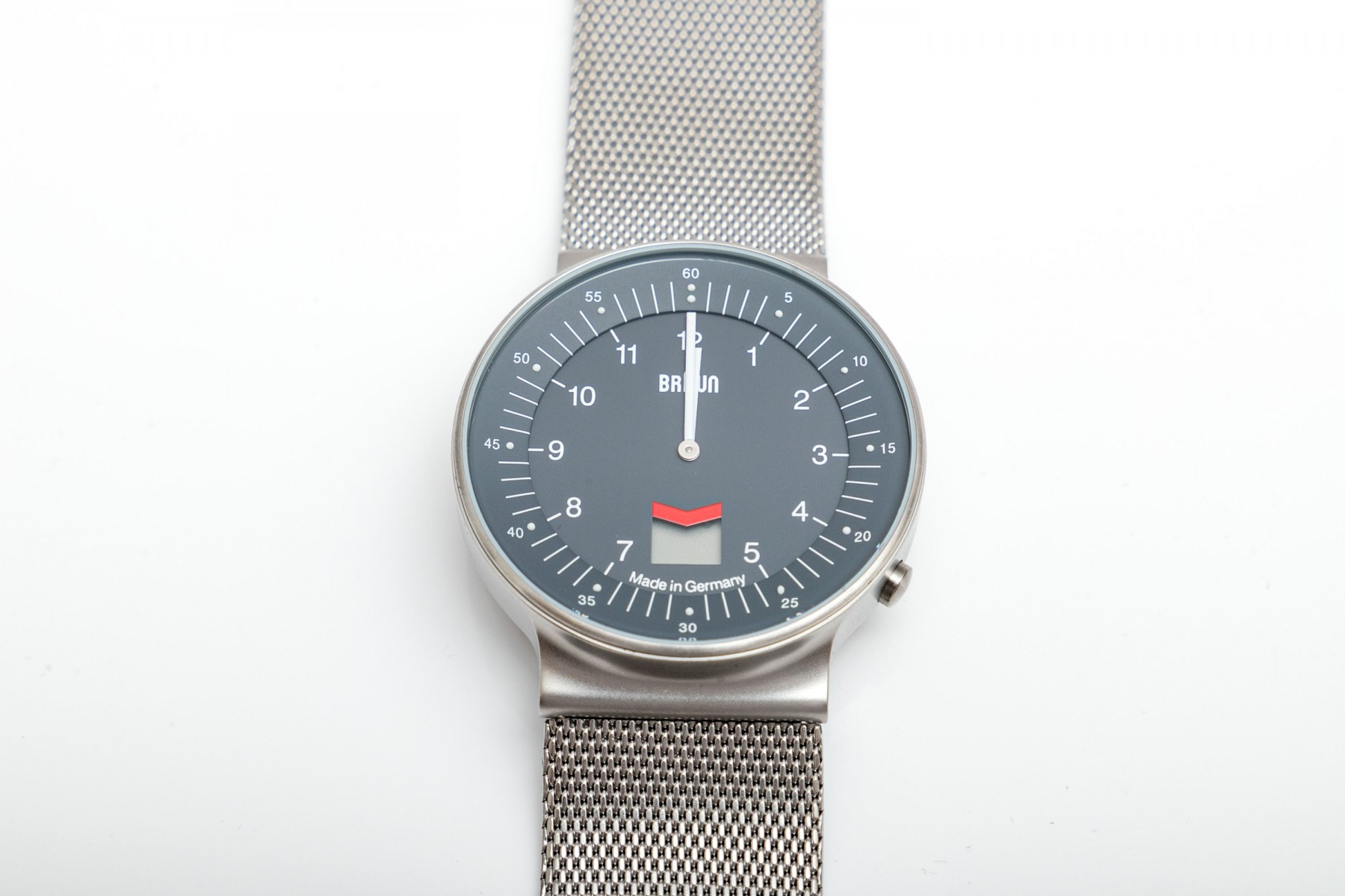 Braun AW200 stylish stainless steel wristwatch displaying a large gray dial with a beveled exterior ring of second markers. Stout, integrated lugs provide a sleek transition to a wide mesh strap. Battery operated. Includes the original box and manual.