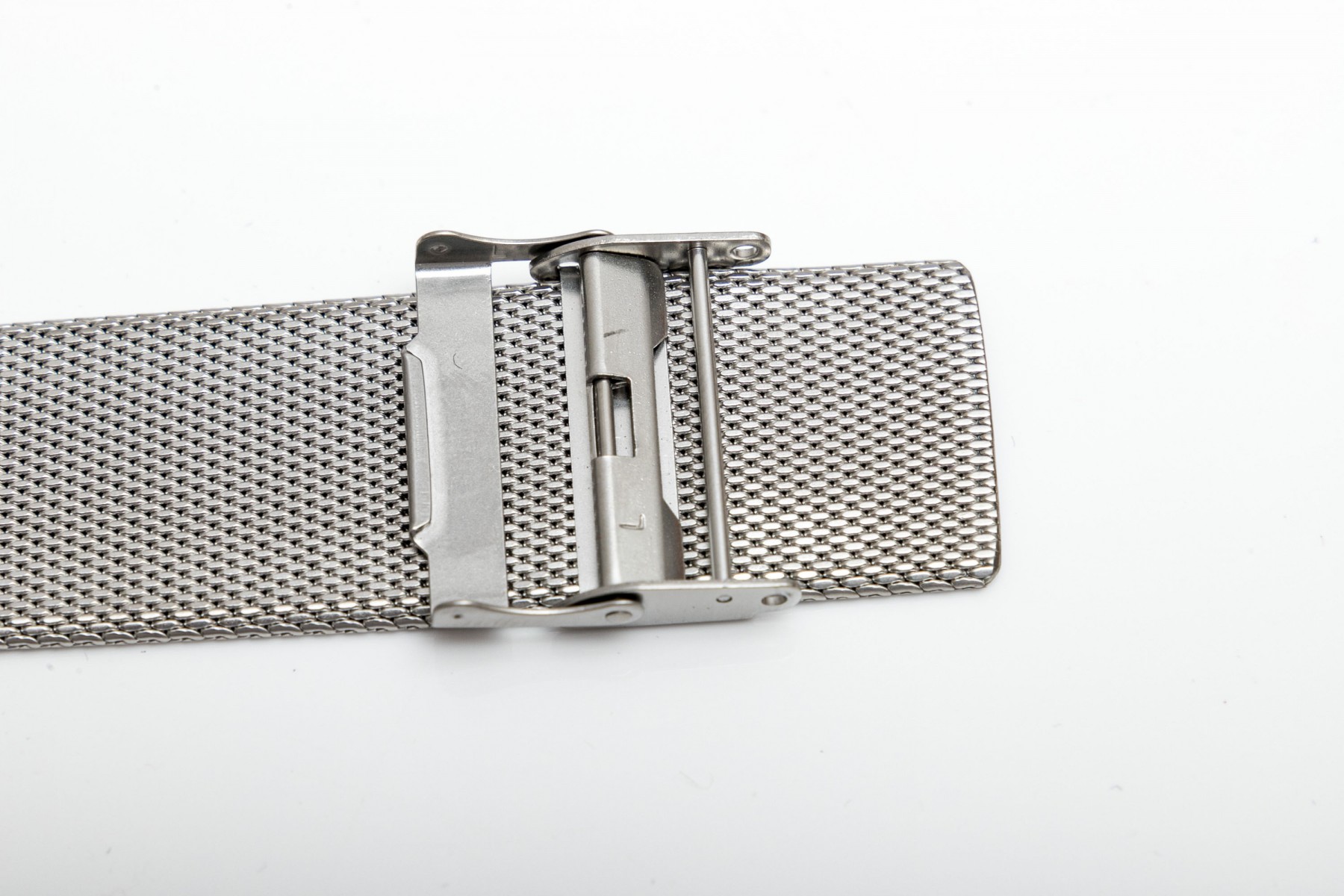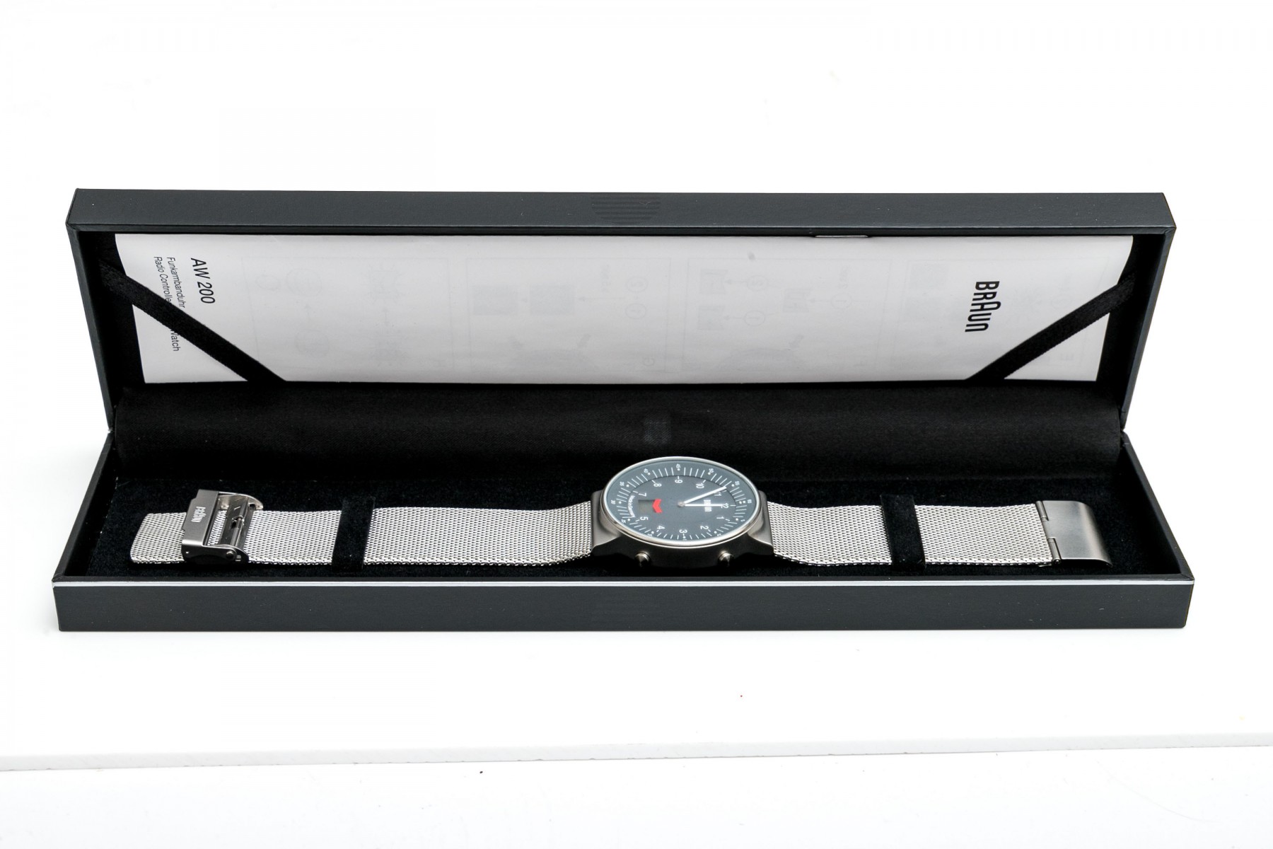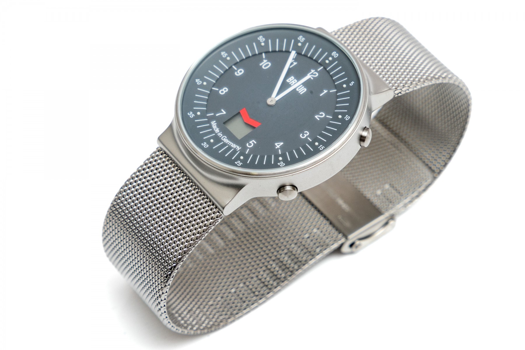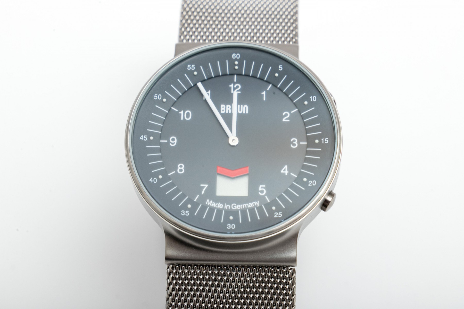 Braun AW200 stylish stainless steel wristwatch displaying a large gray dial with a beveled exterior ring of second markers. Stout, integrated lugs provide a sleek transition to a wide mesh strap. Battery operated. Includes the original box and manual.