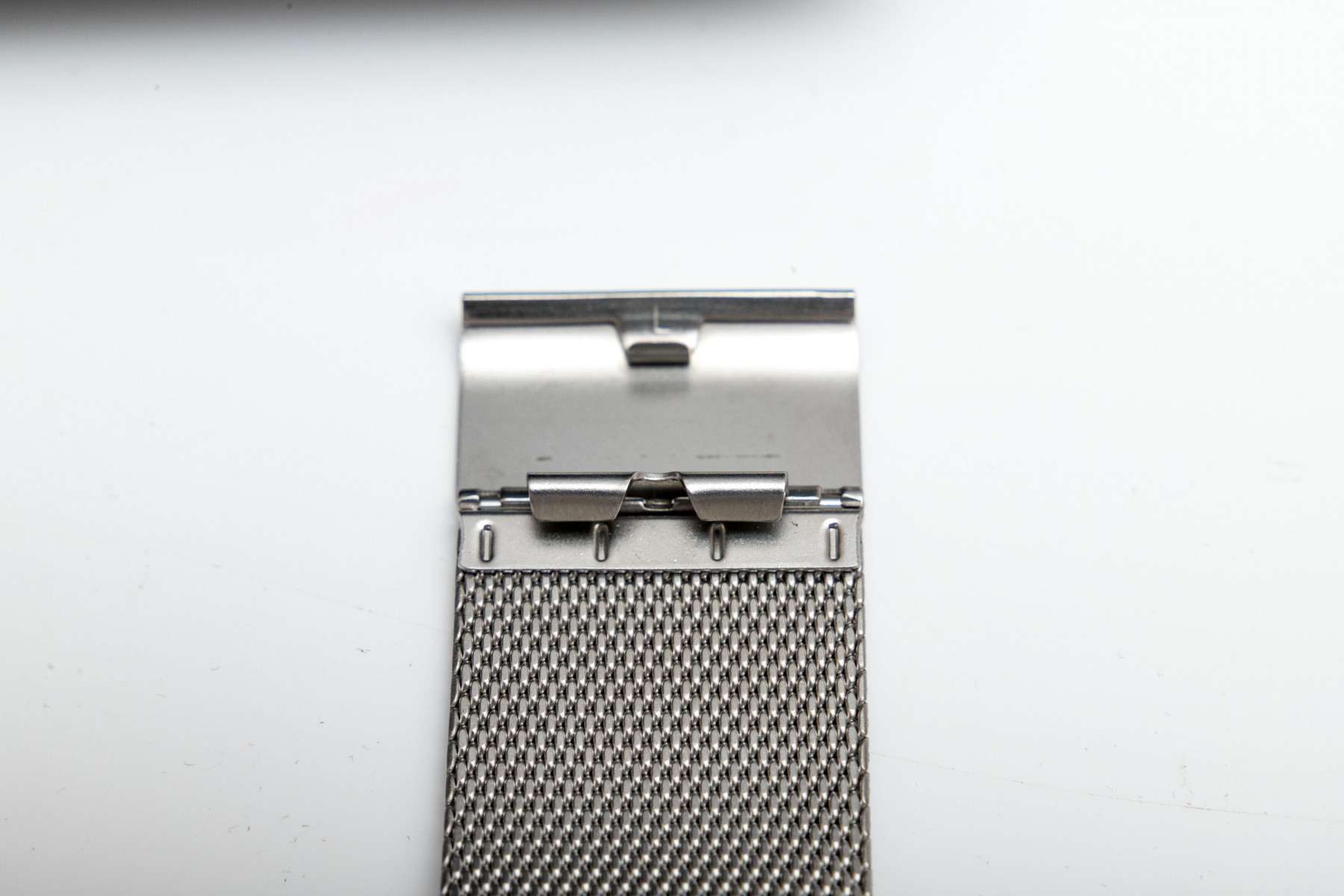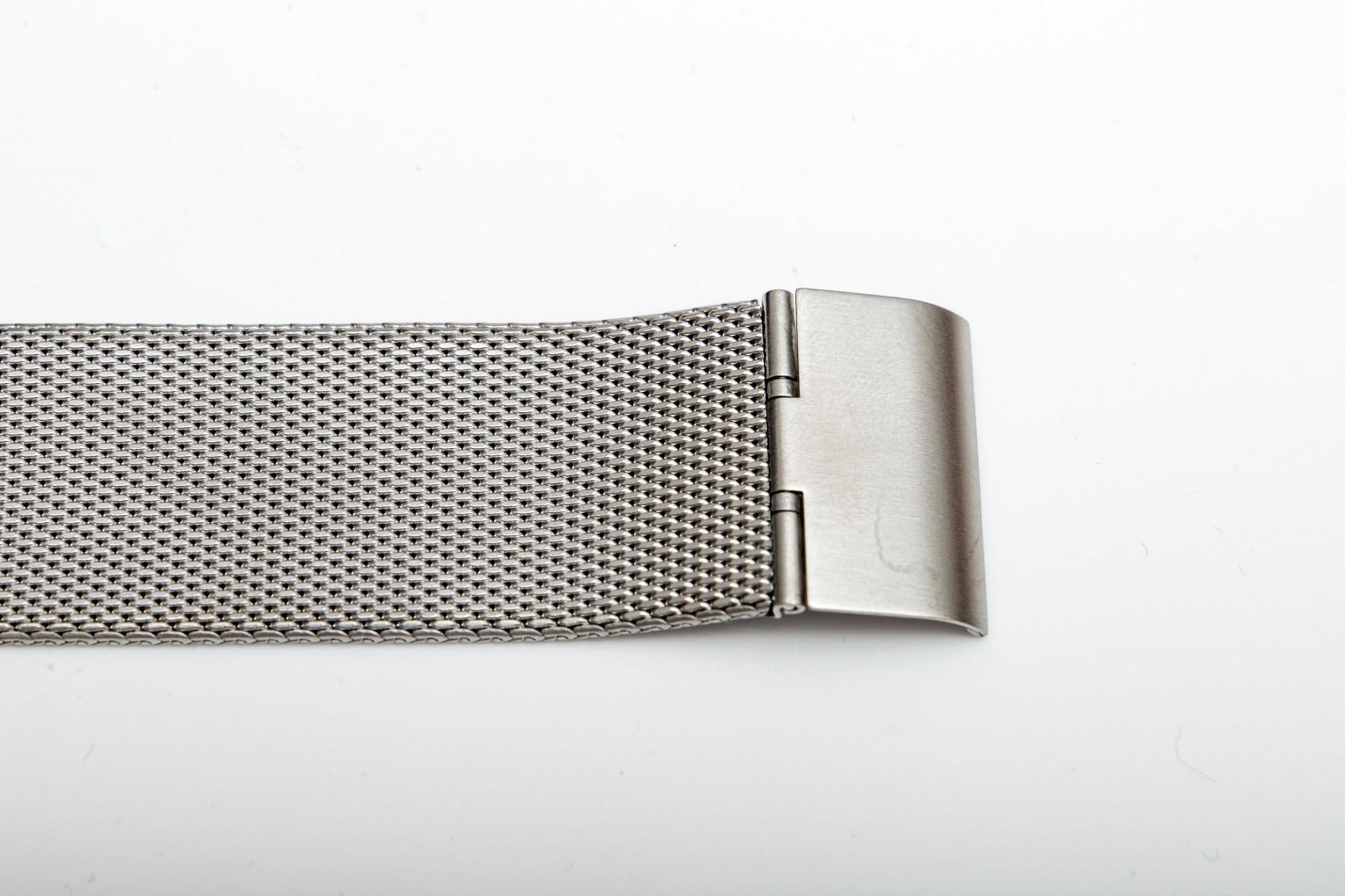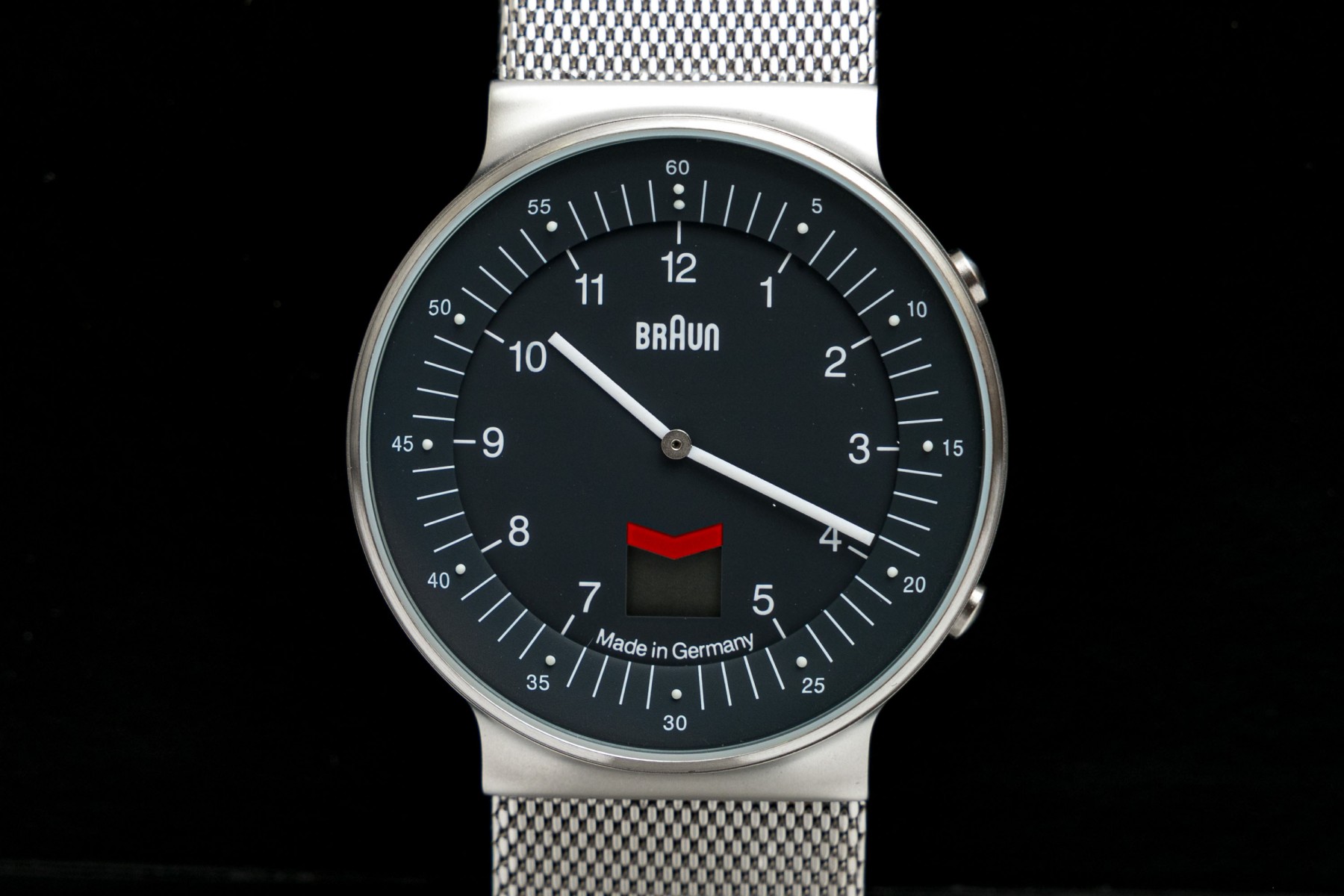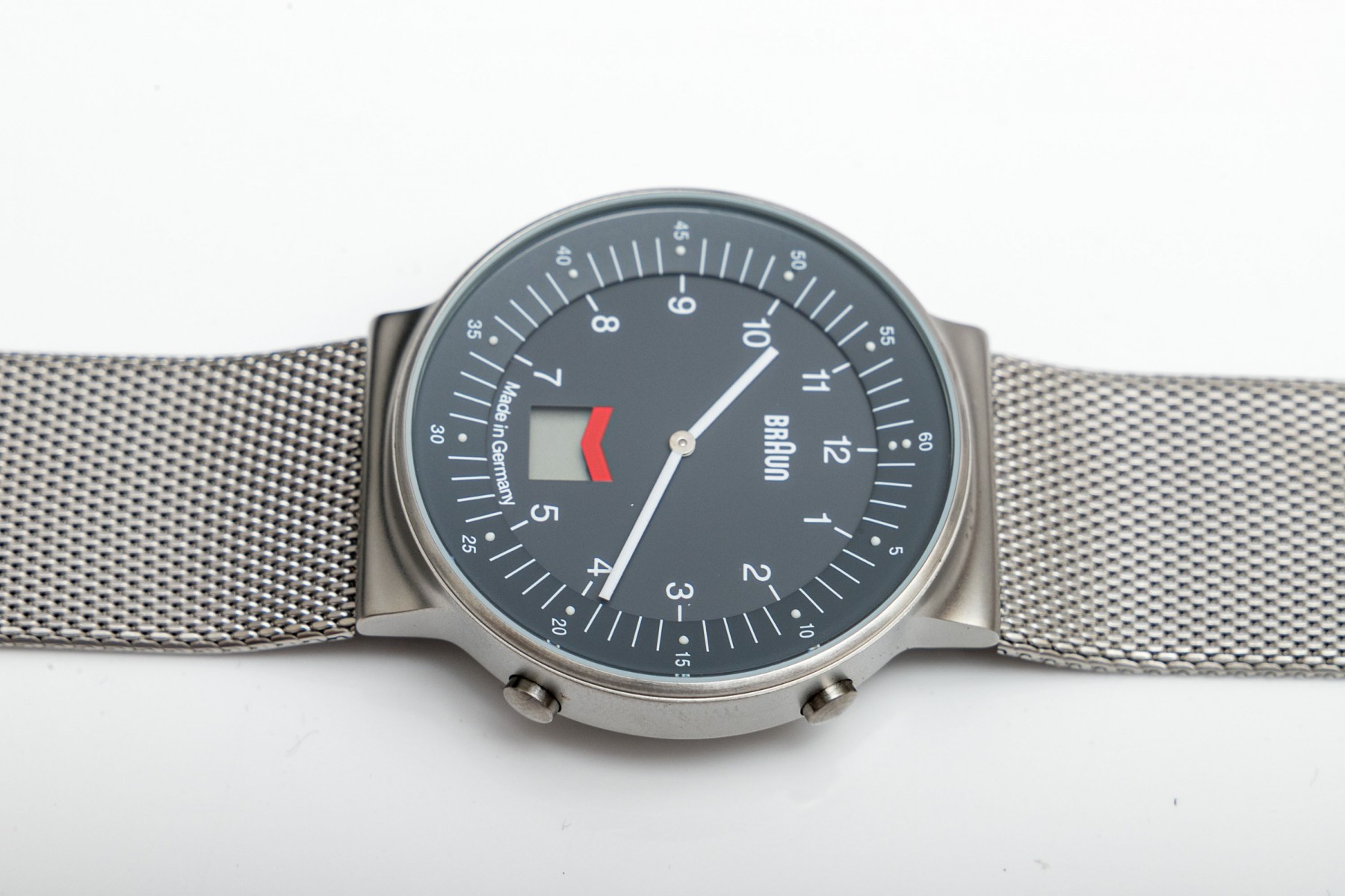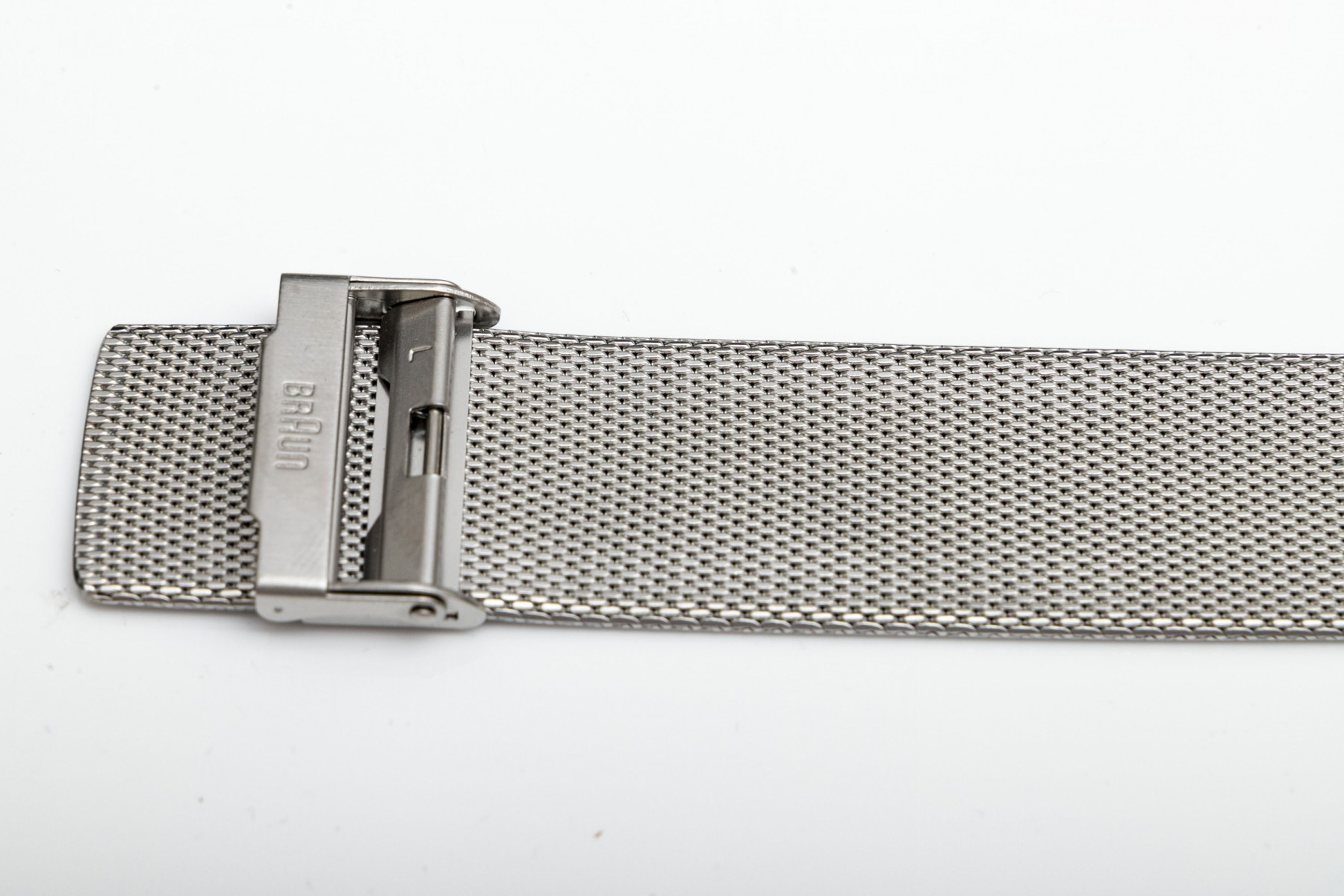 Braun AW200 stylish stainless steel wristwatch displaying a large gray dial with a beveled exterior ring of second markers. Stout, integrated lugs provide a sleek transition to a wide mesh strap. Battery operated. Includes the original box and manual.