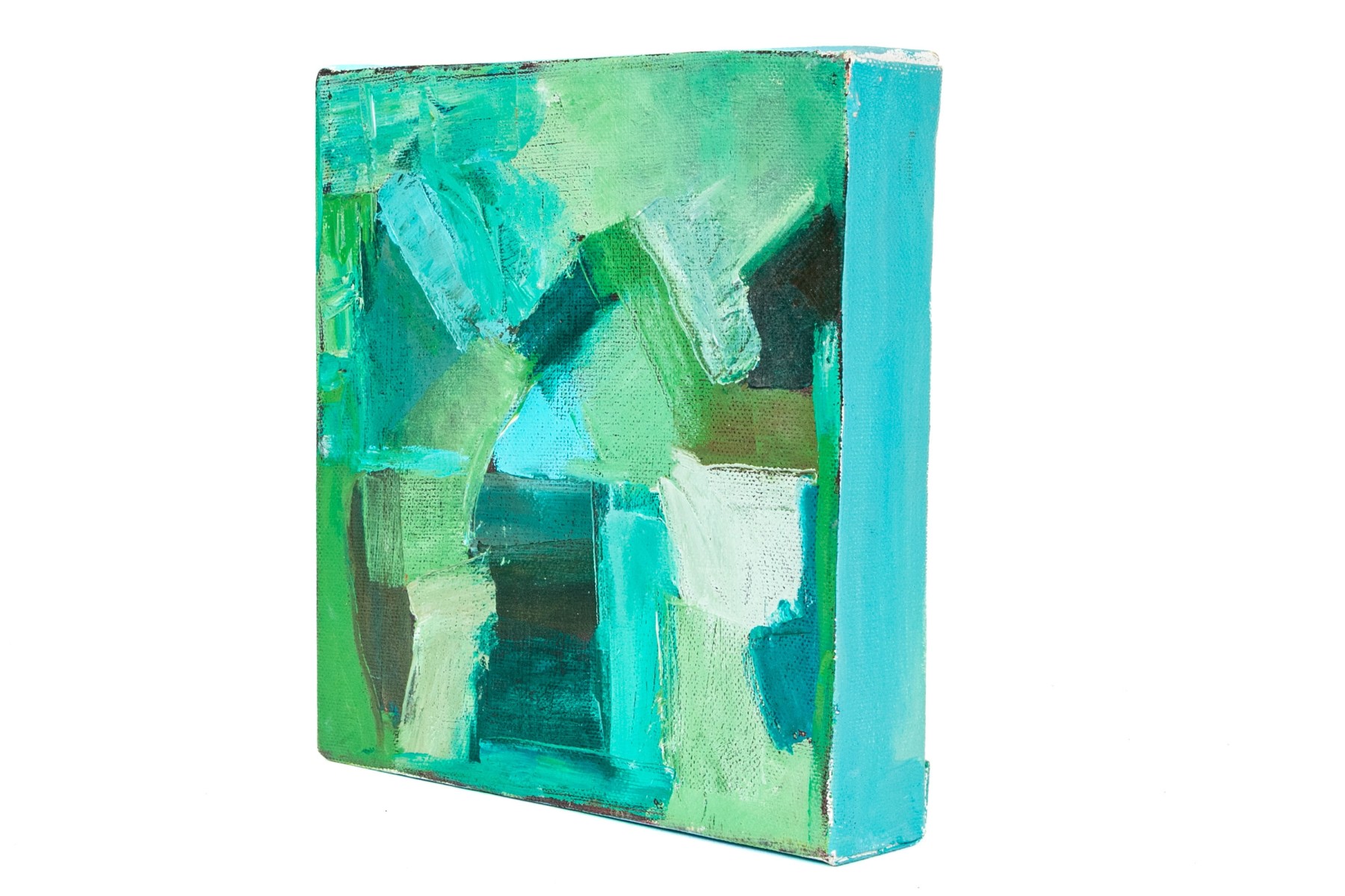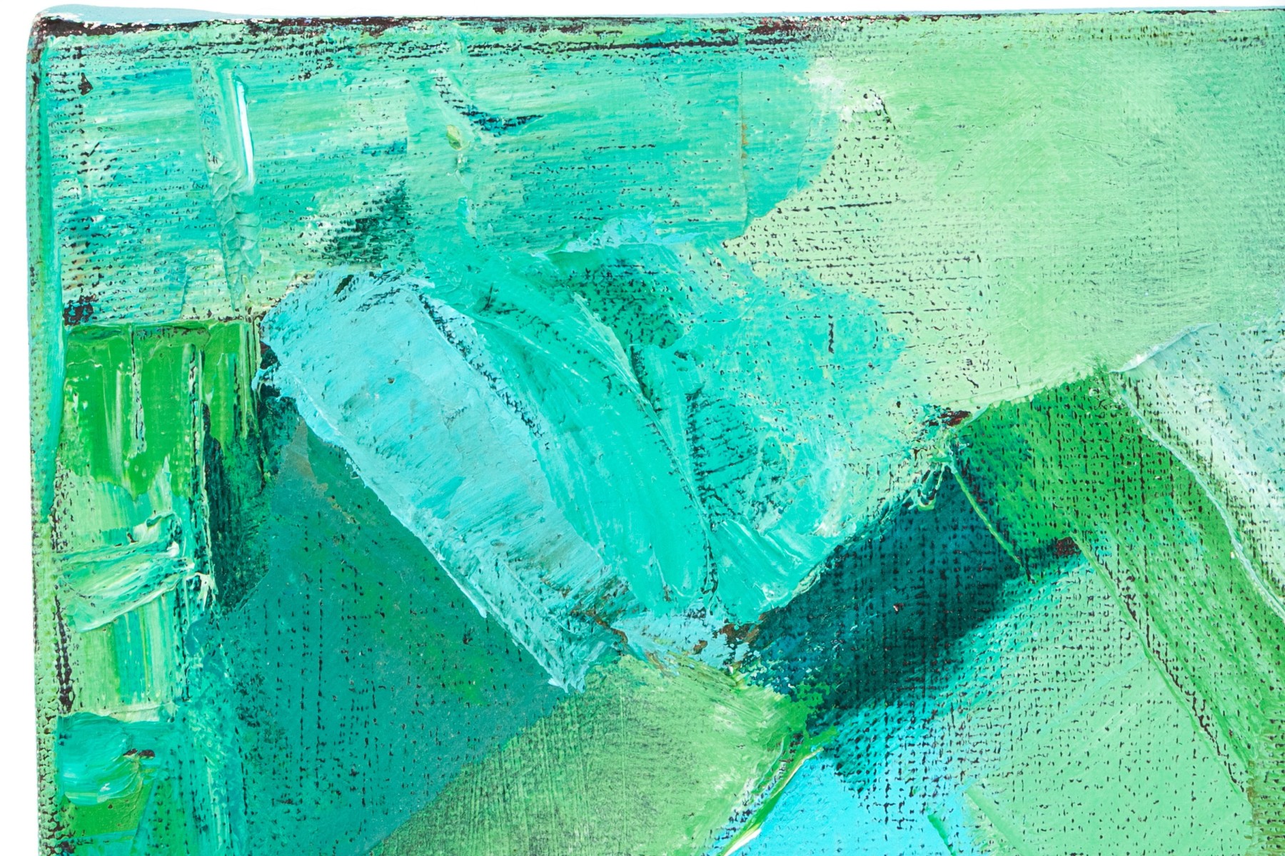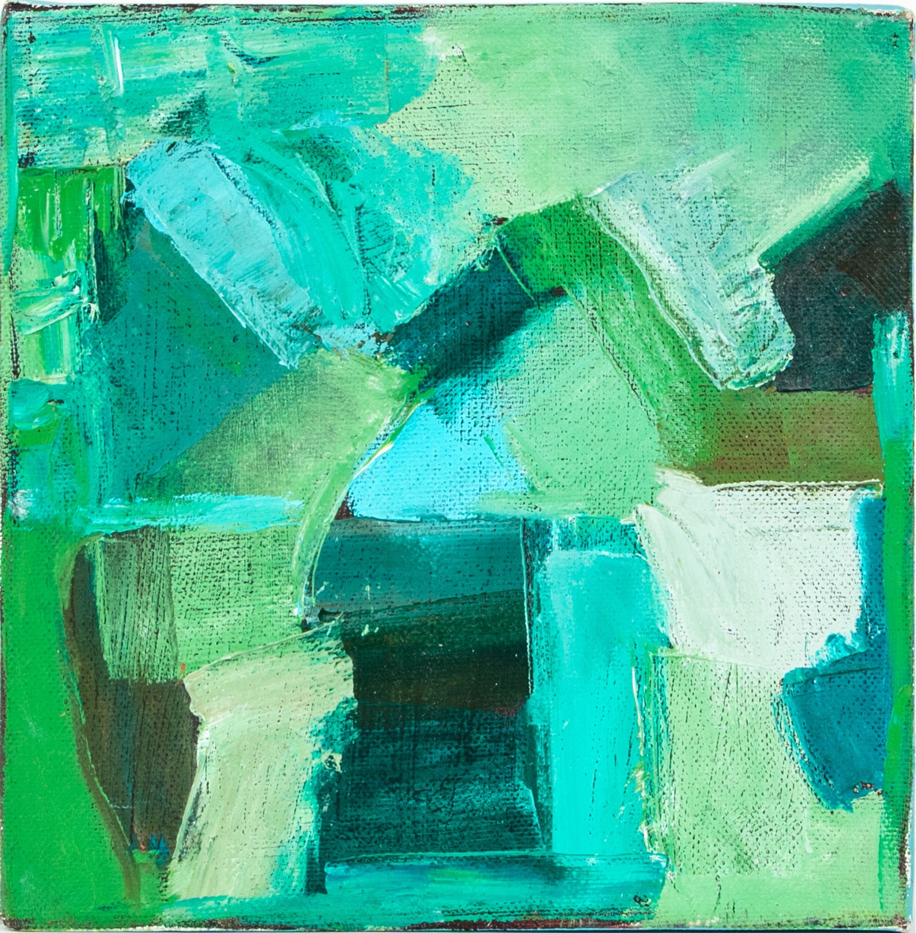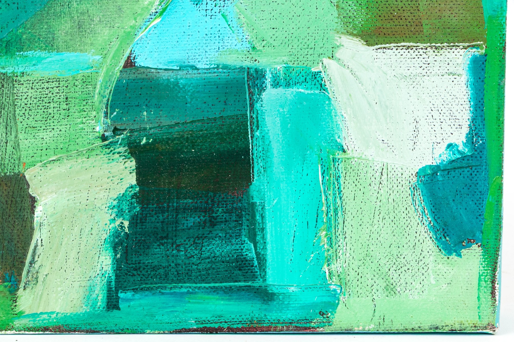 Brenda Jacobsen (Canadian-American [CT], b. 1961) "Teatime" oil painting on canvas depicting an abstract composition in green, blue, teal, and white with subtle diagonal forms at the center giving the piece a sense of gentle energy and movement. Signed, titled, and dated 2014 on the verso. The canvas is mounted to a stretcher, unframed.