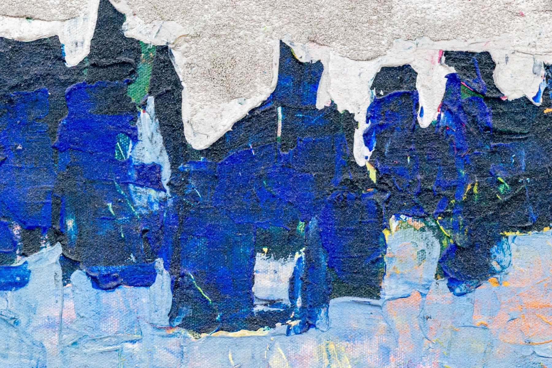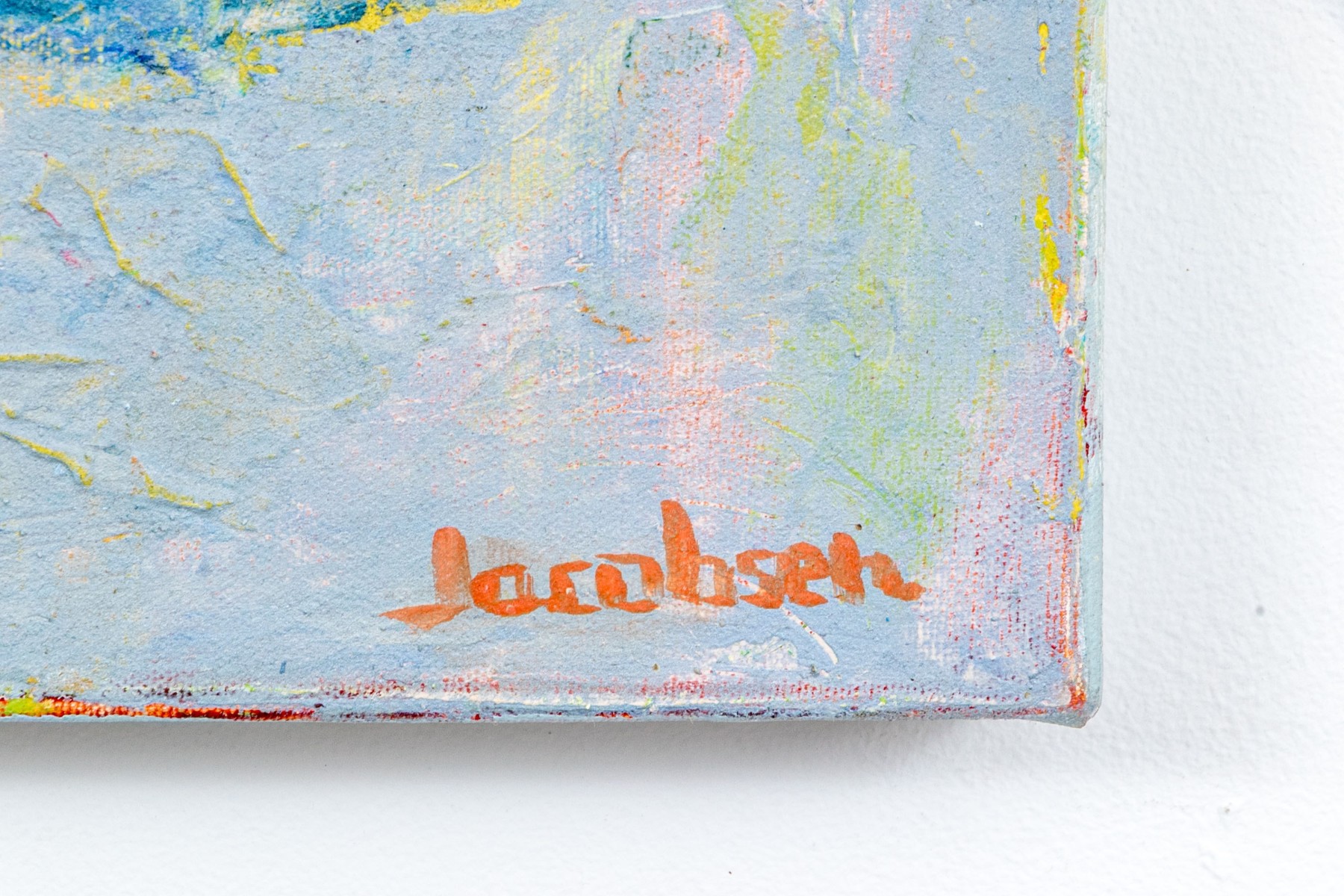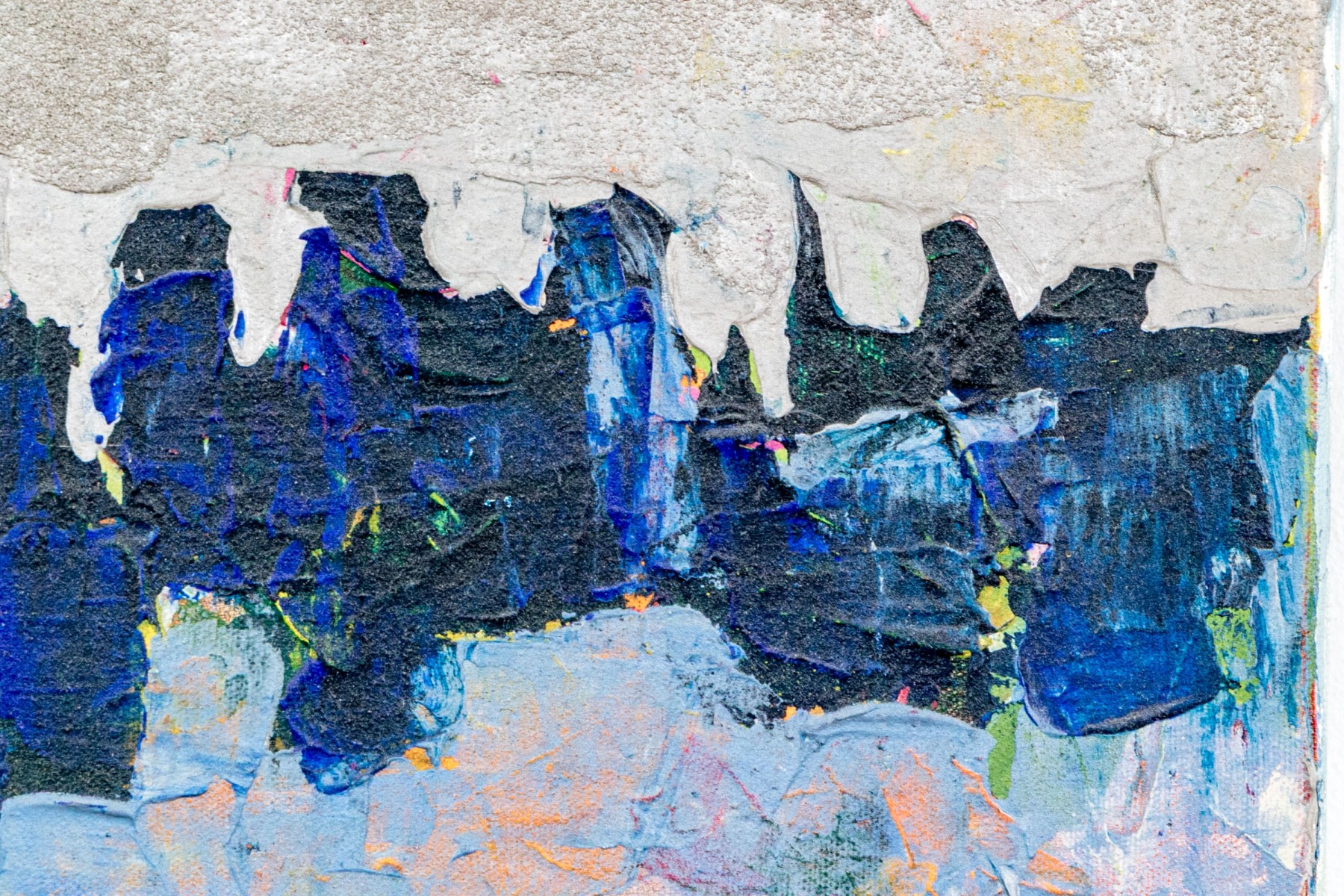 Brenda Jacobsen (Canadian-American [CT], b. 1961) "Winter's Tale" mixed media on canvas depicting an abstract landscape with textural striations in gray, dark blue, light blue, and cool white accented wit hsubtle pops of yellow, green, pink, and orange. Signed lower right. Titled, signed, and dated 12/2013 on the verso. The canvas is mounted to a stretcher, unframed.