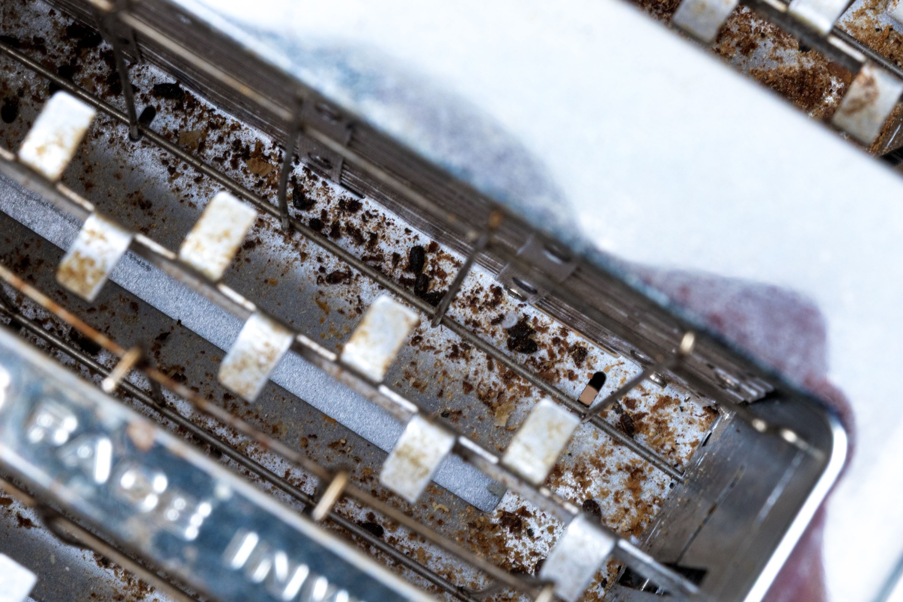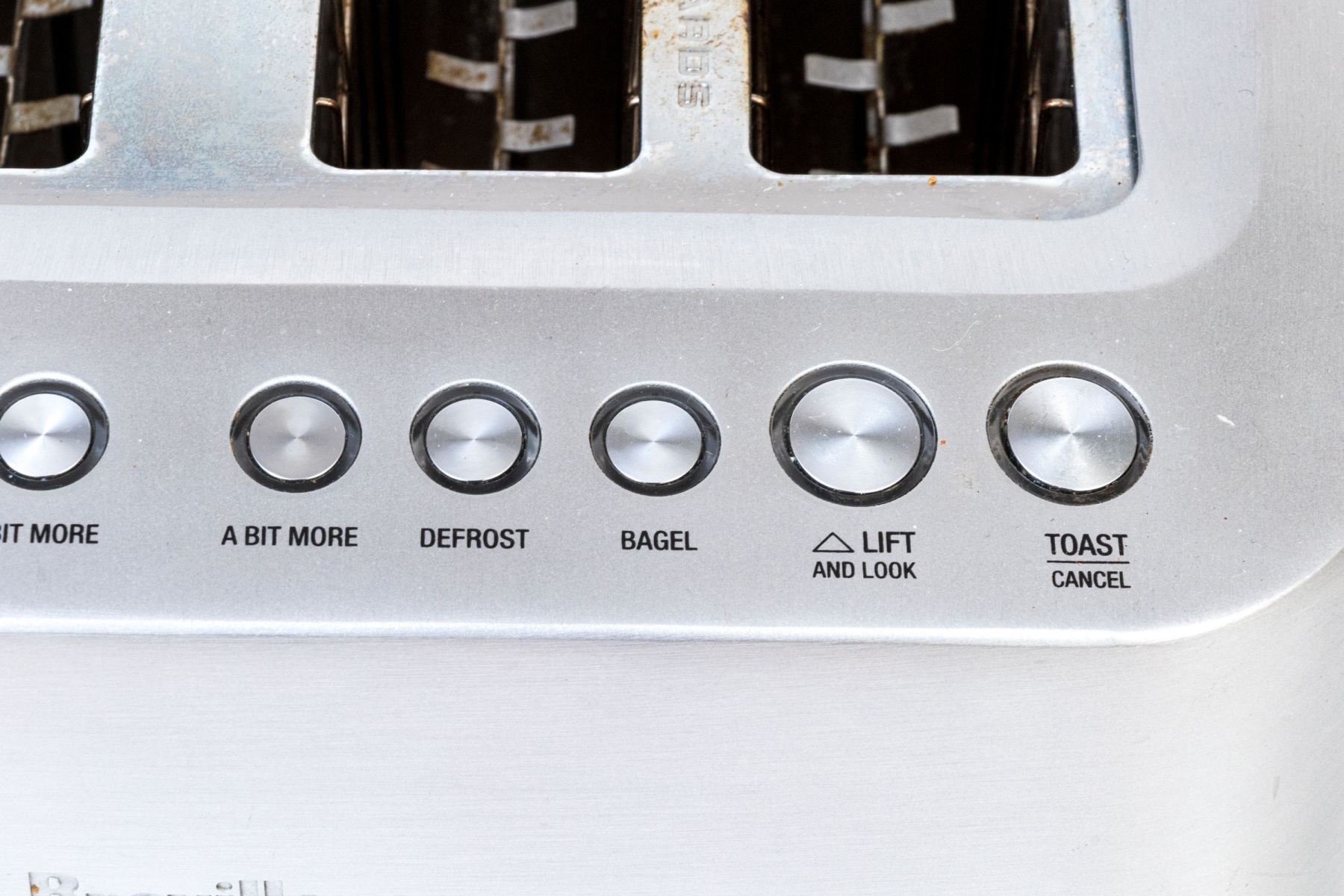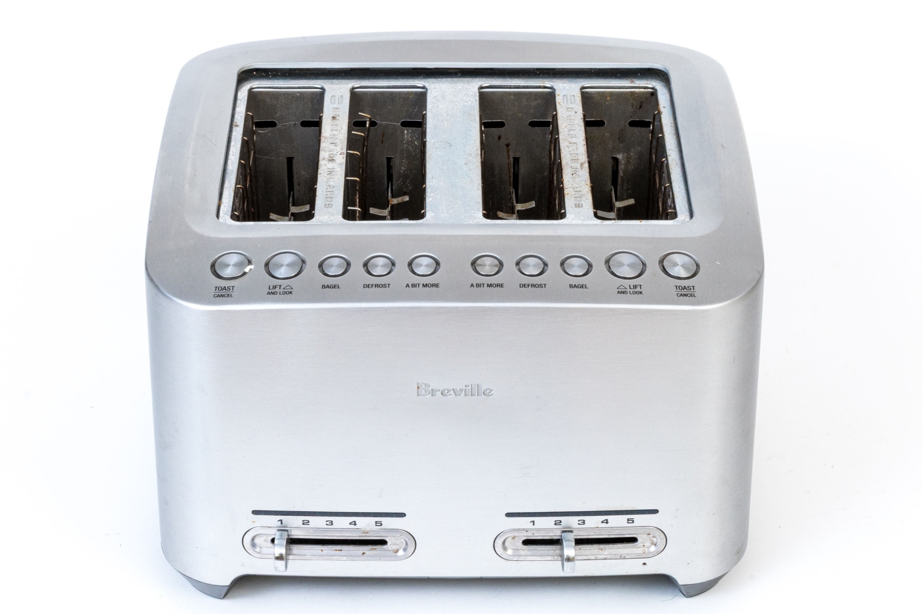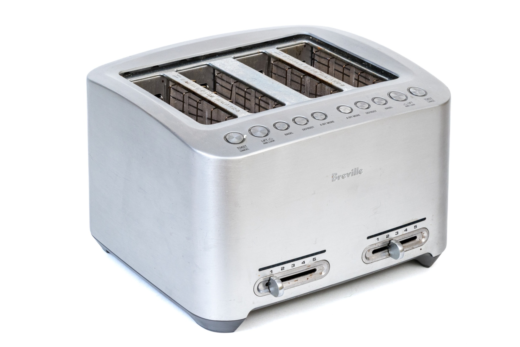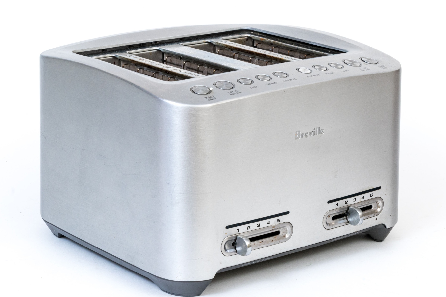 A handy Breville model BTA840XL four slot toaster in gray metal with rubber feet.