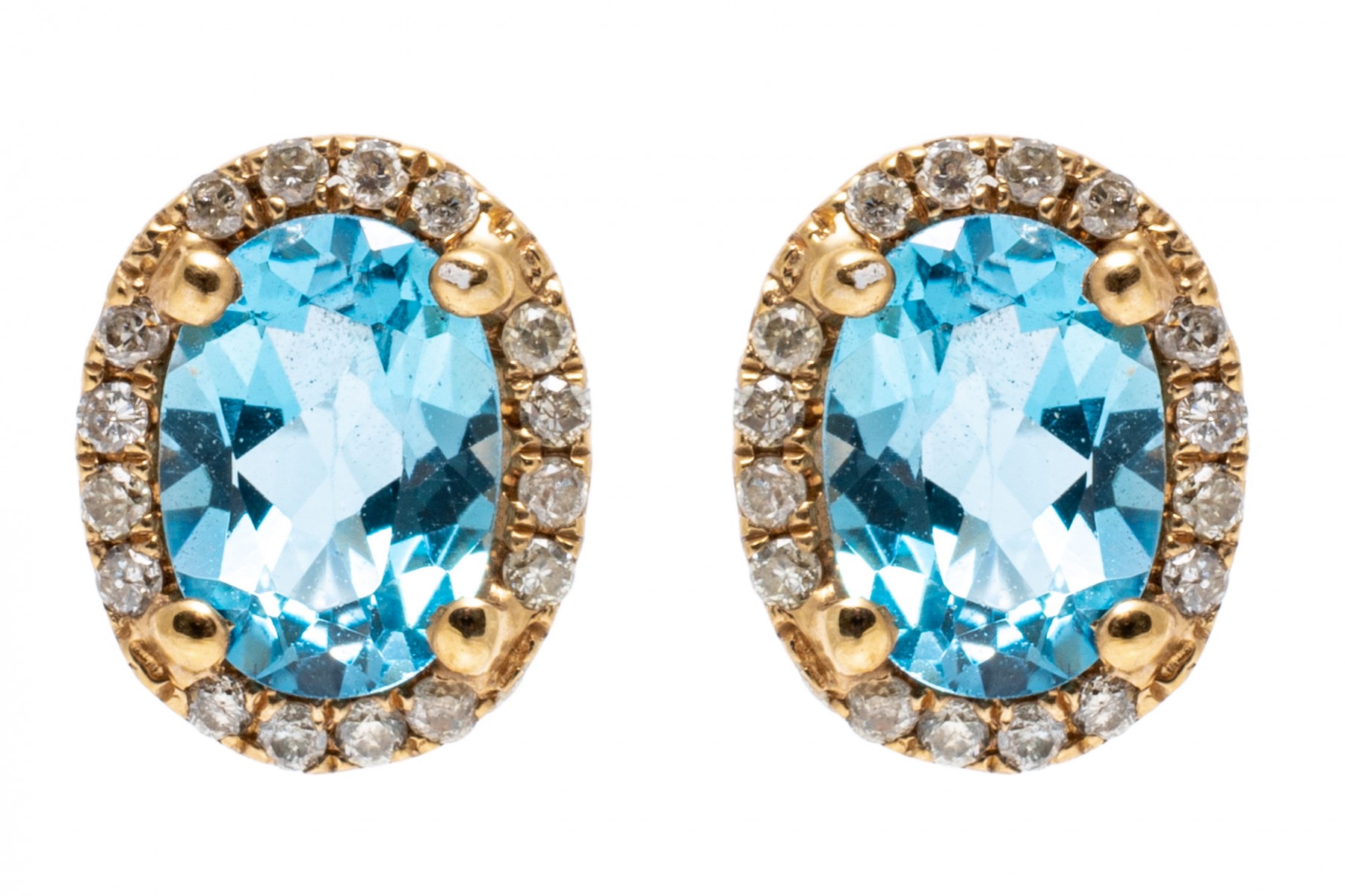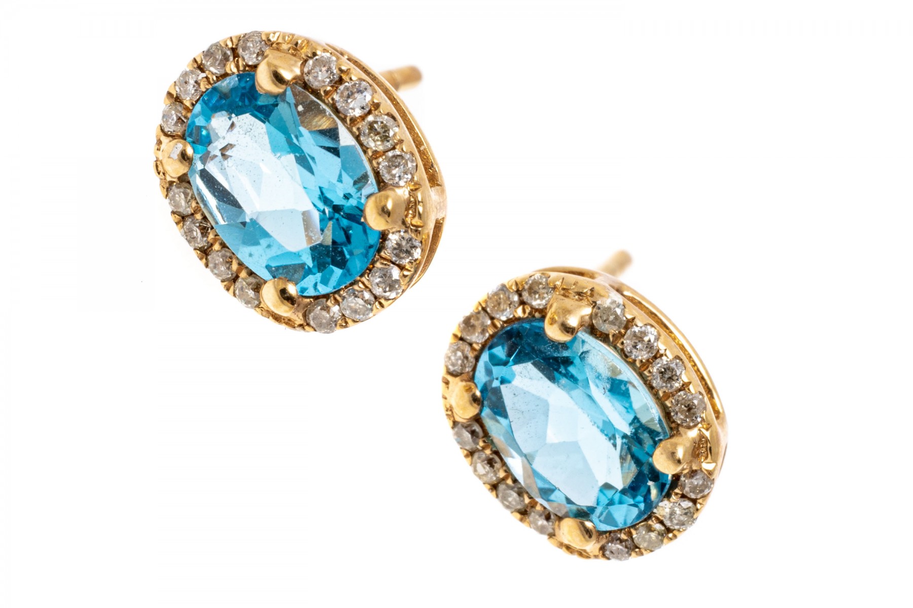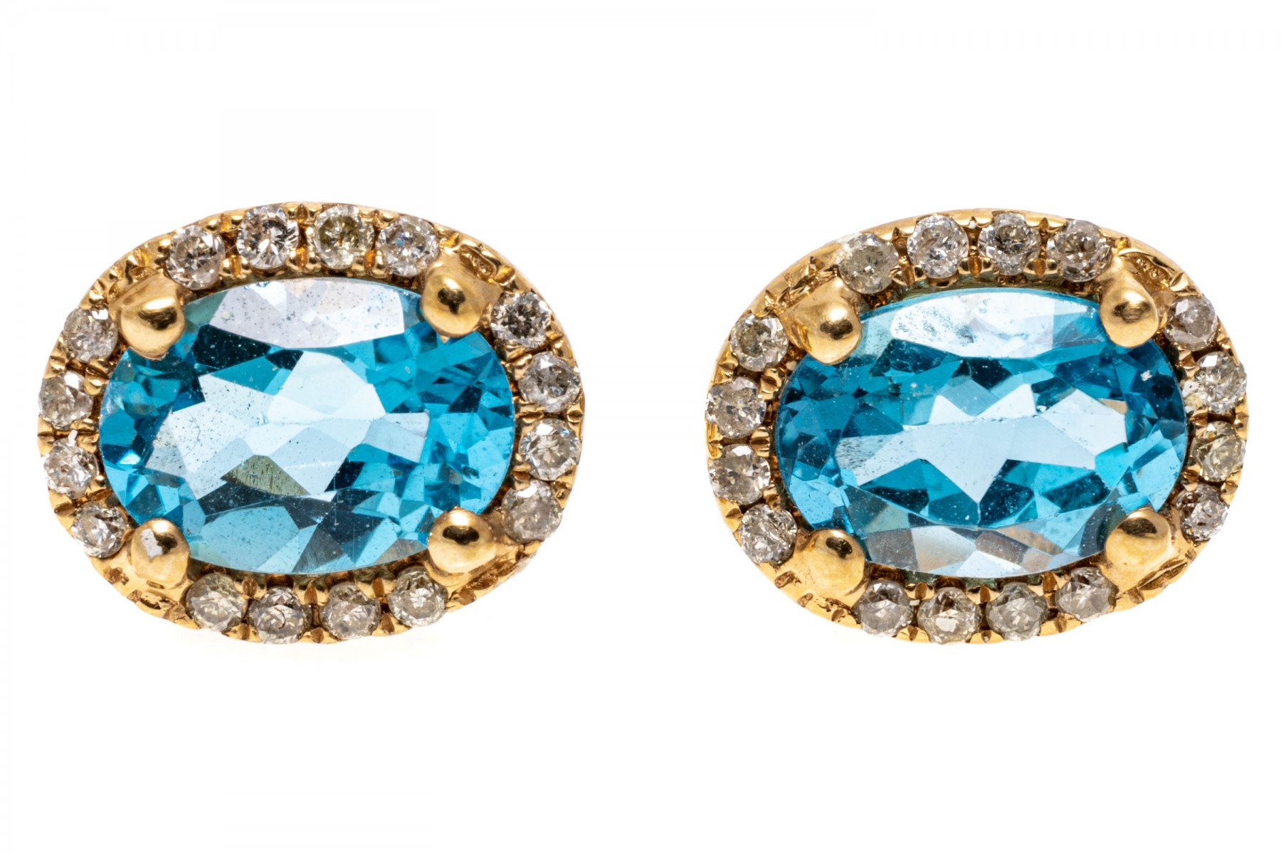 Bright blue topaz set within 14K yellow gold stud earrings. Surroundings the oval cut topaz stones are round cut diamonds. Topaz are approximately 1.28 TCW and the diamonds are approximately 0.22 TCW. Post backings.