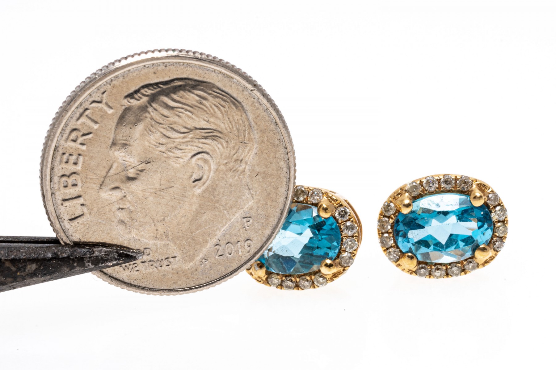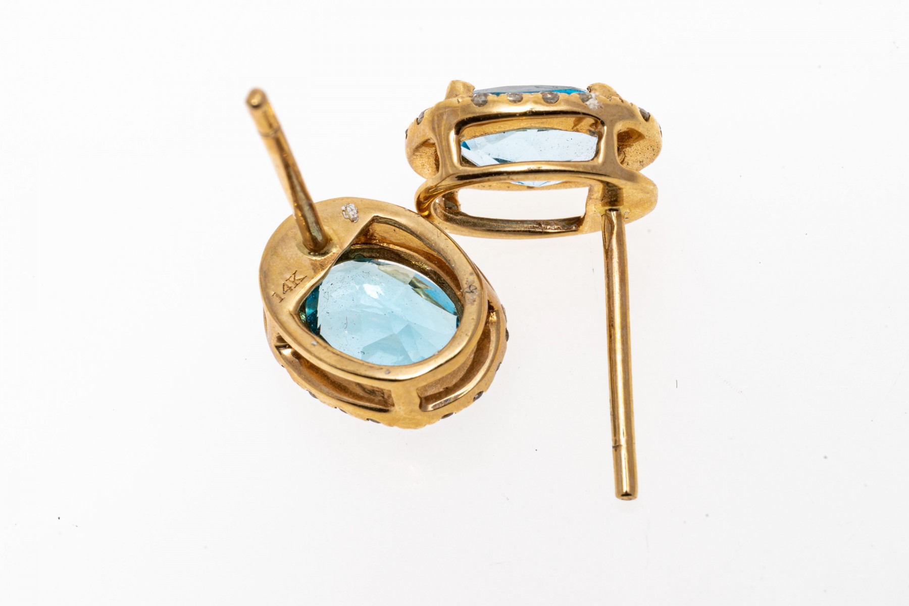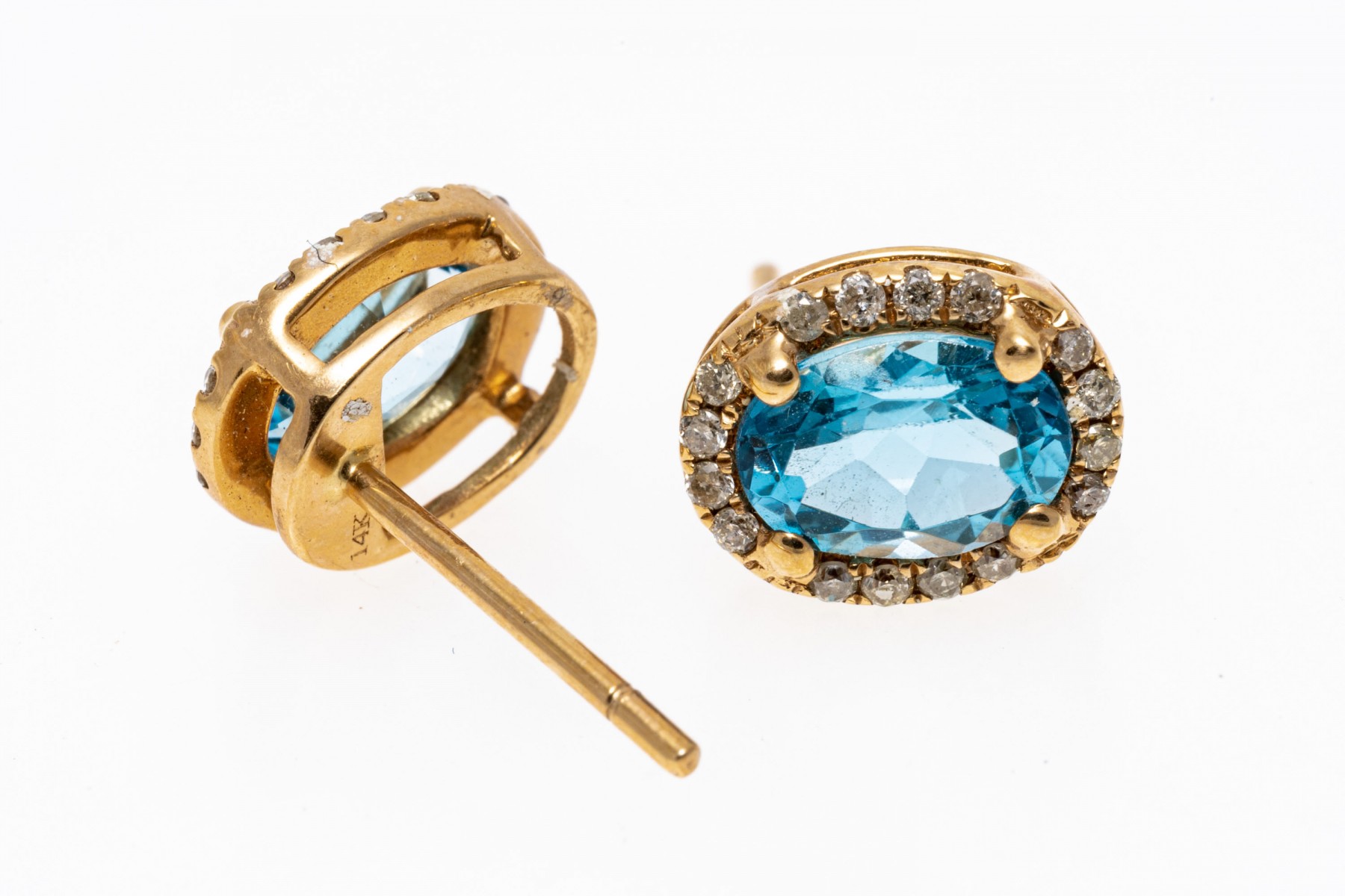 Bright blue topaz set within 14K yellow gold stud earrings. Surroundings the oval cut topaz stones are round cut diamonds. Topaz are approximately 1.28 TCW and the diamonds are approximately 0.22 TCW. Post backings.